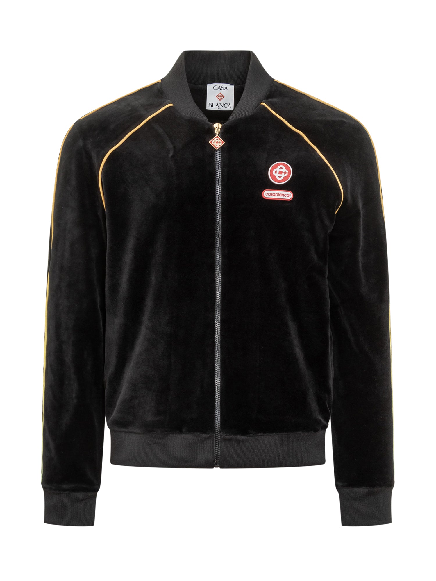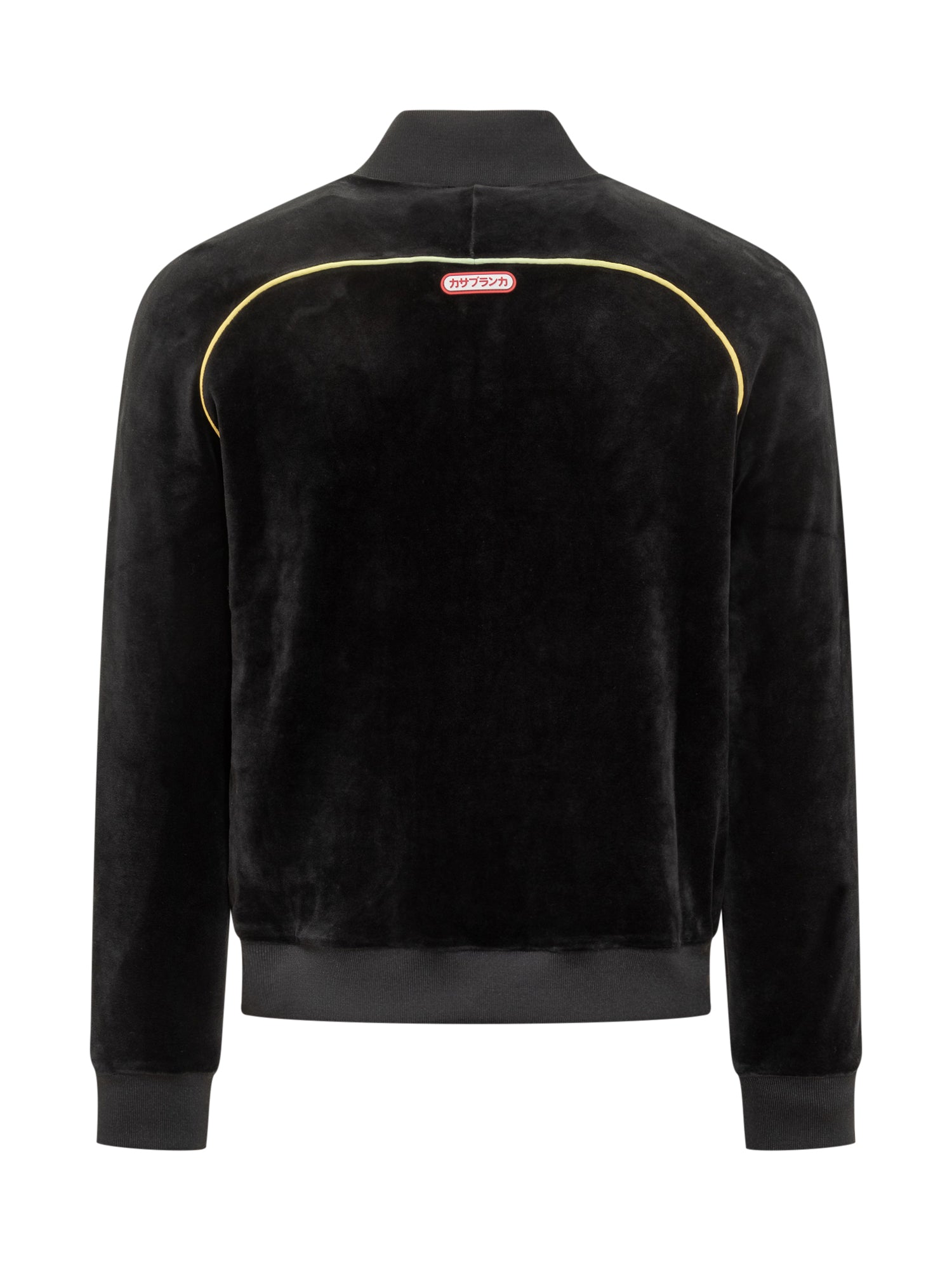 Casablanca bomber jacket in black velvet with yellow contrast piping and embroidered logo. Zip closure, sport-luxury design.