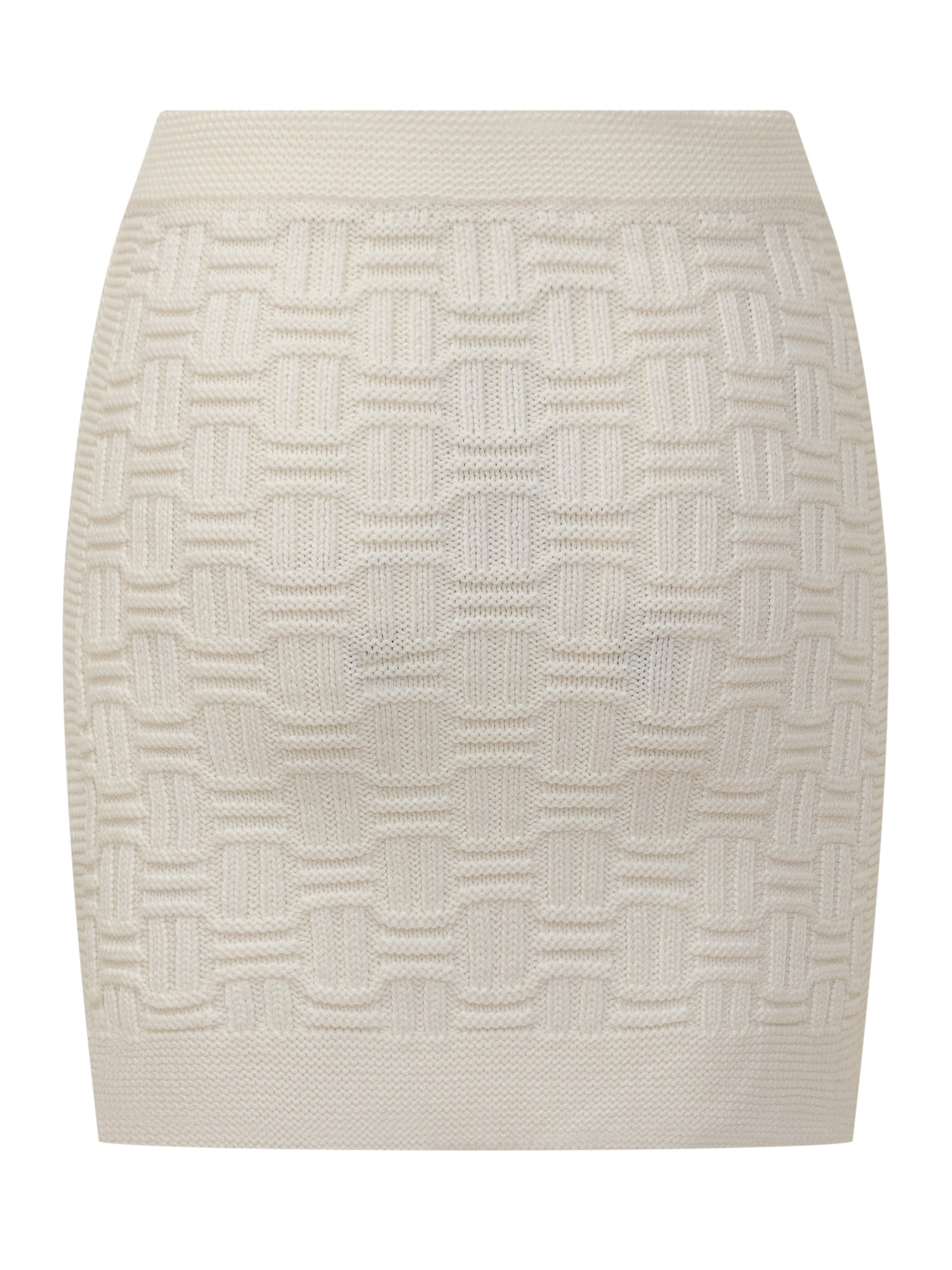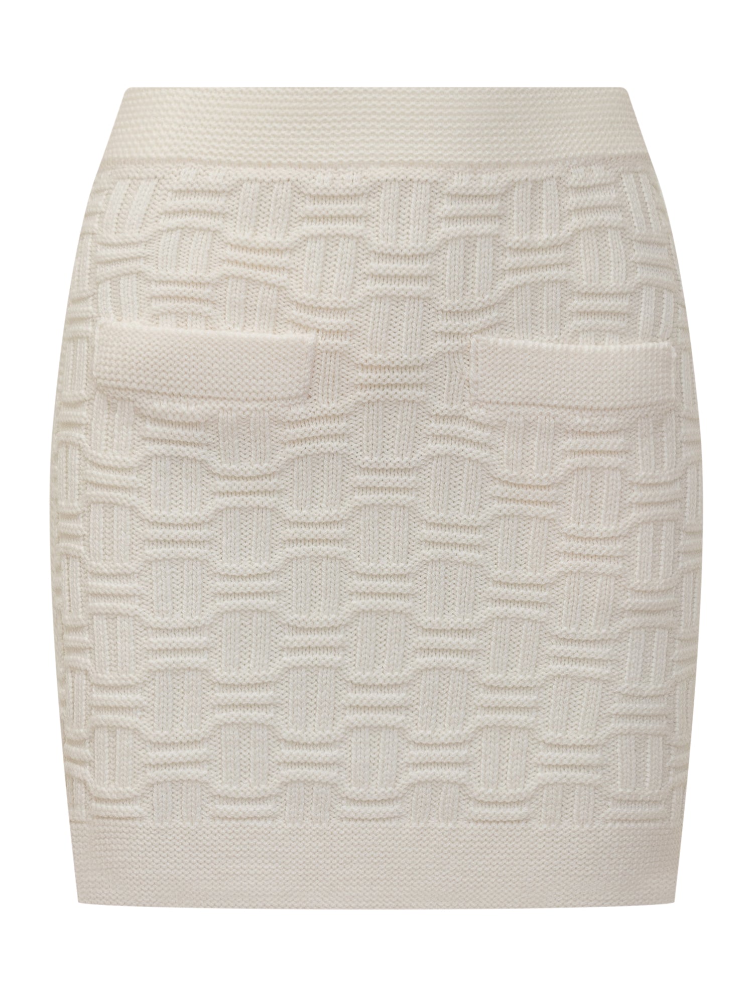 Mini skirt with elasticized waist. Ribbed hems. Two pockets on front.