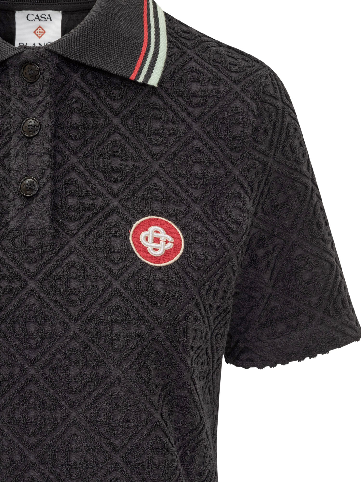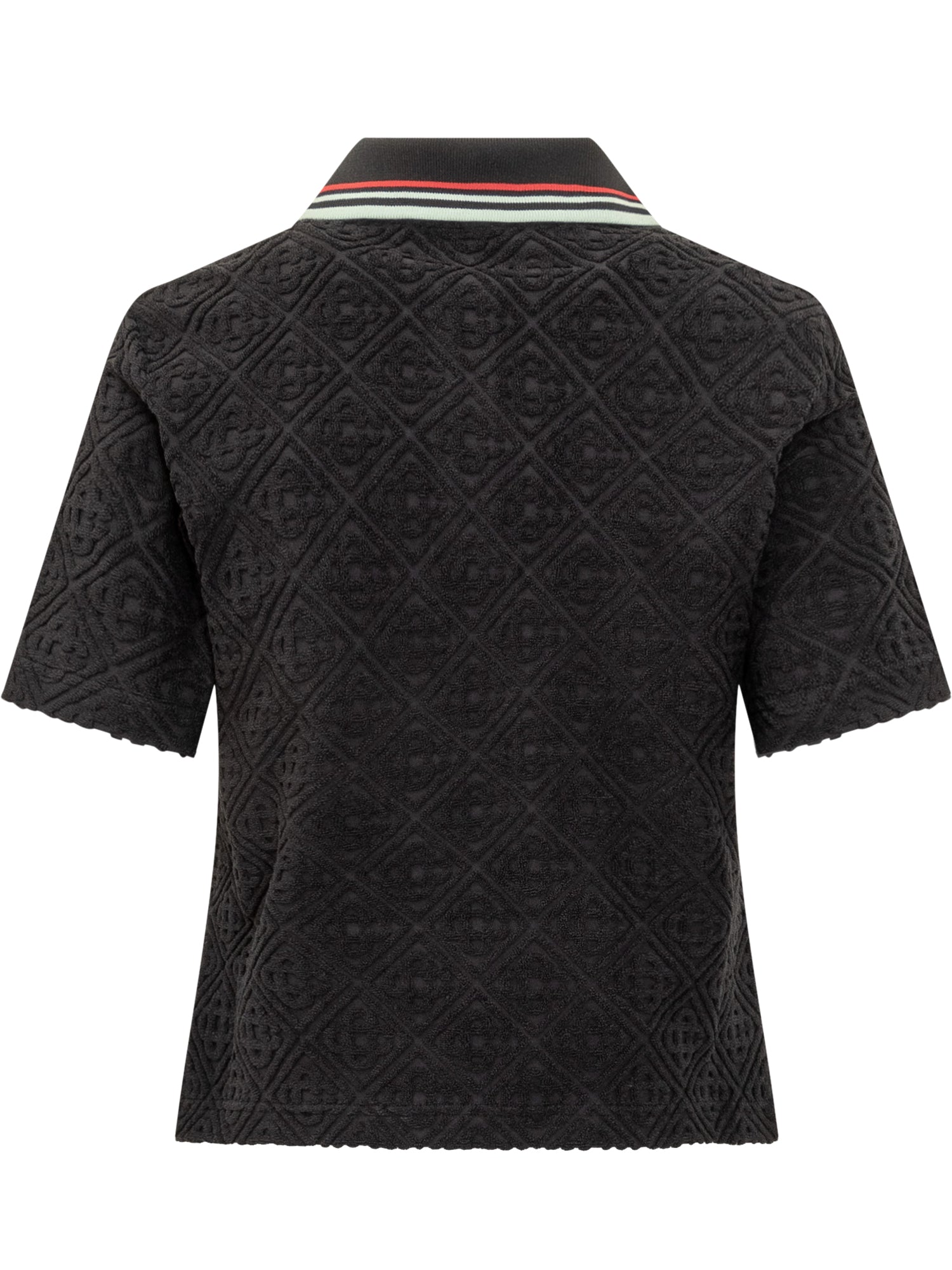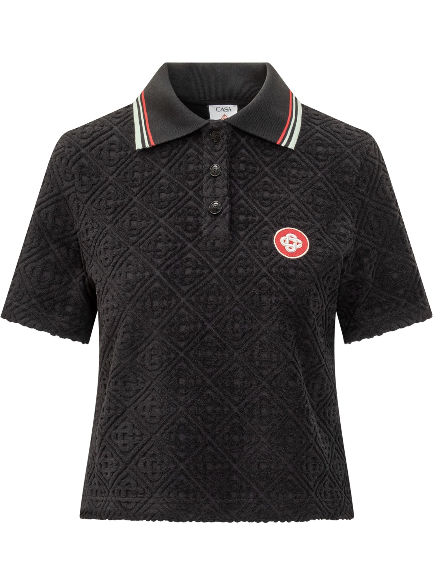 Casablanca women's T-shirt in black jacquard terry with all-over monogram pattern. Striped polo collar, three-button closure, and embroidered logo on the chest.