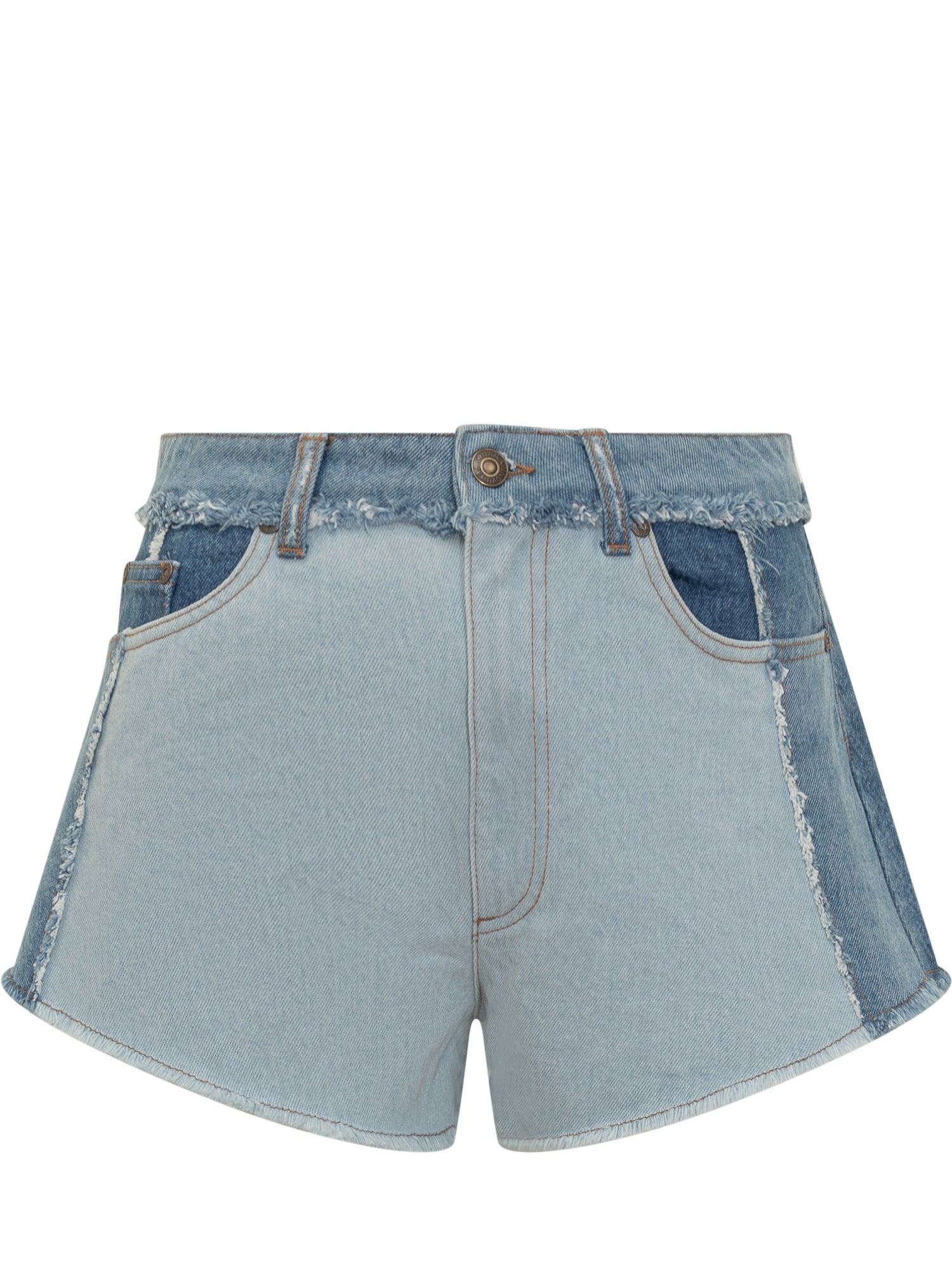 Denim shorts. Zipper and button closure. Belt loops. Three pockets on front. Reverse fabric on front and back.