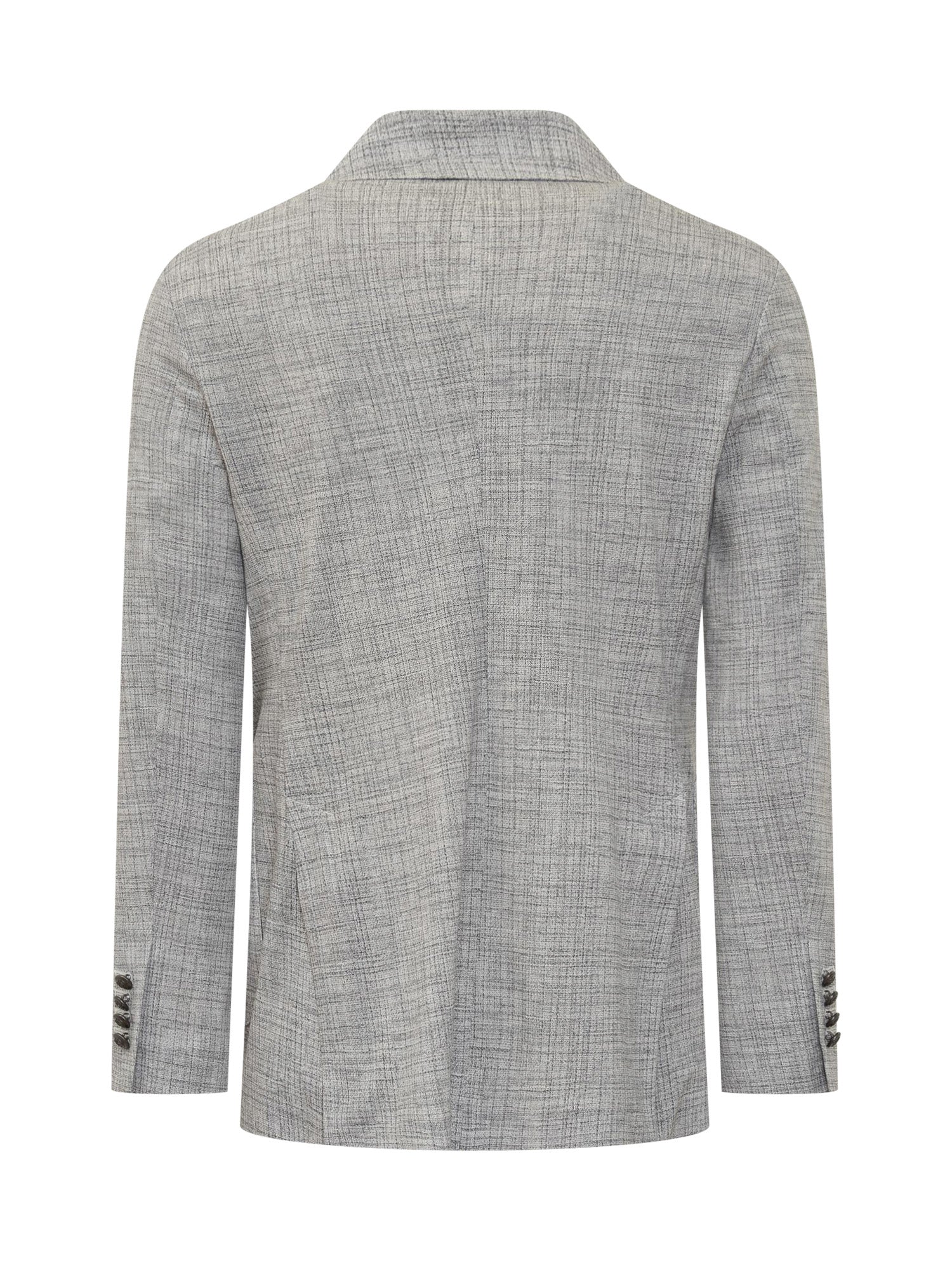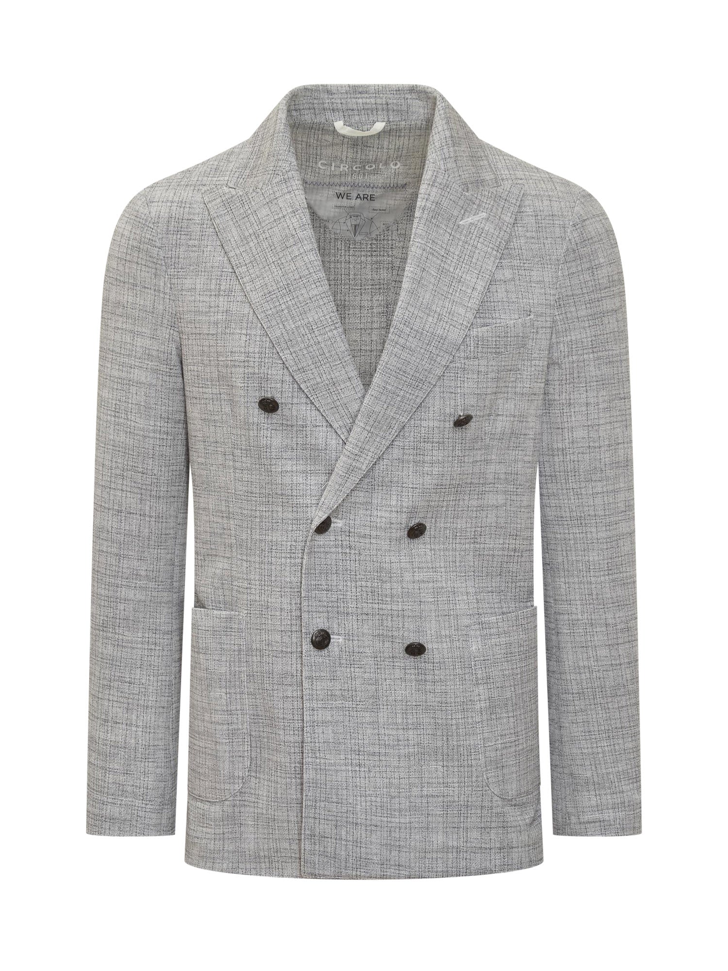 Classic lapels with buttonhole. Double-breasted button fastening. Cuffs with buttons. Two patch pockets and one welt pocket.