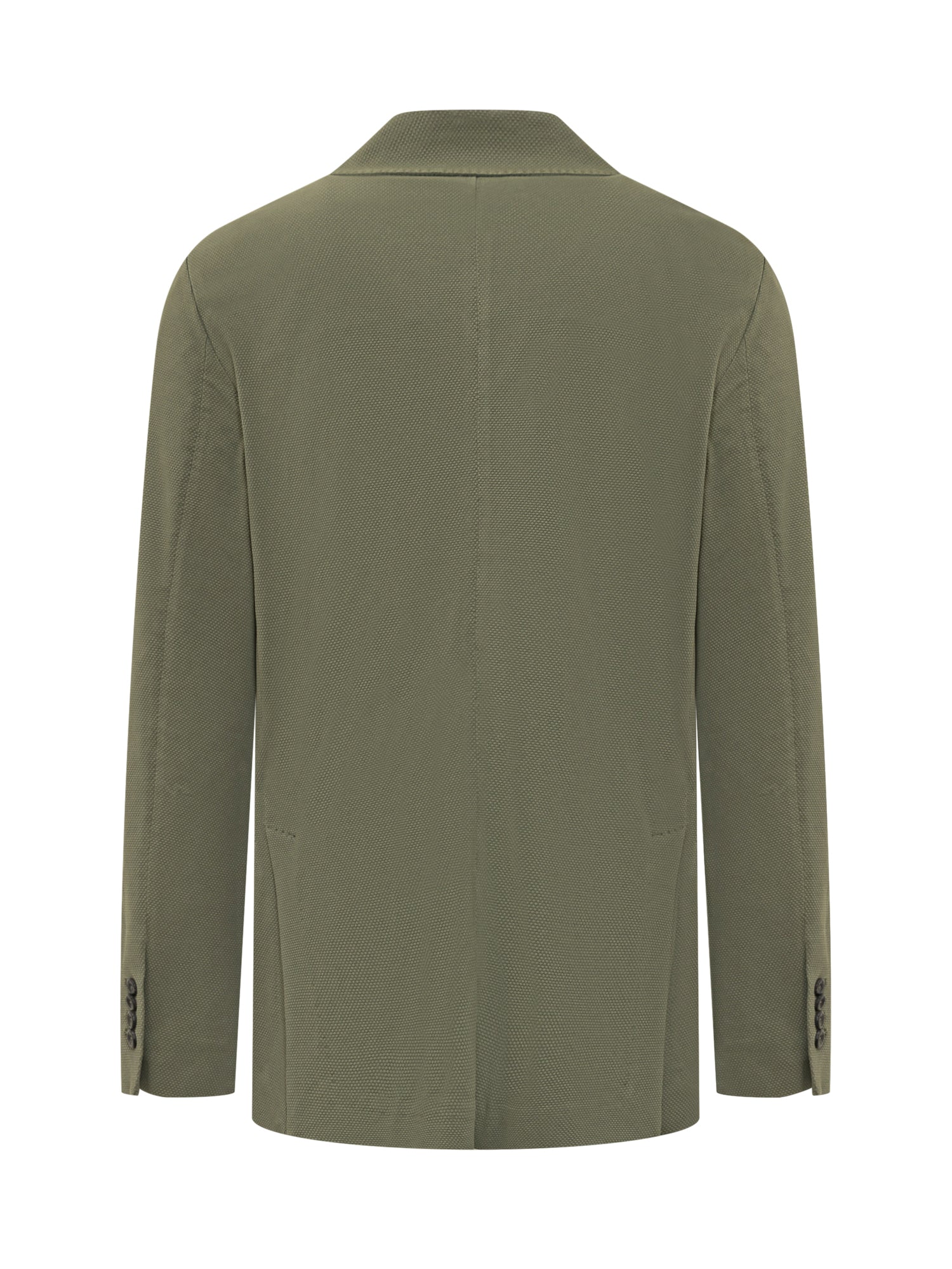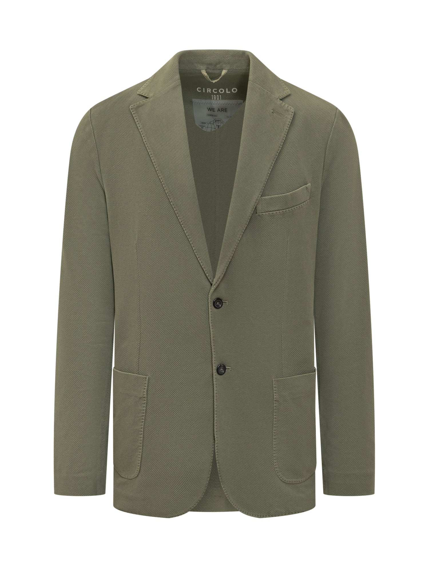 Classic lapels with buttonhole. Button fastening. Cuffs with buttons. Two patch pockets and one welt pocket.