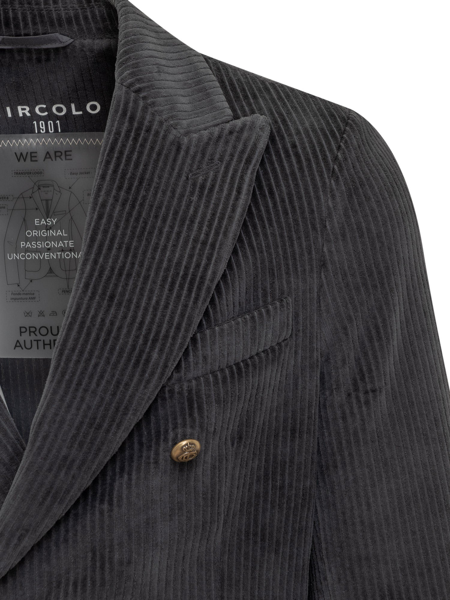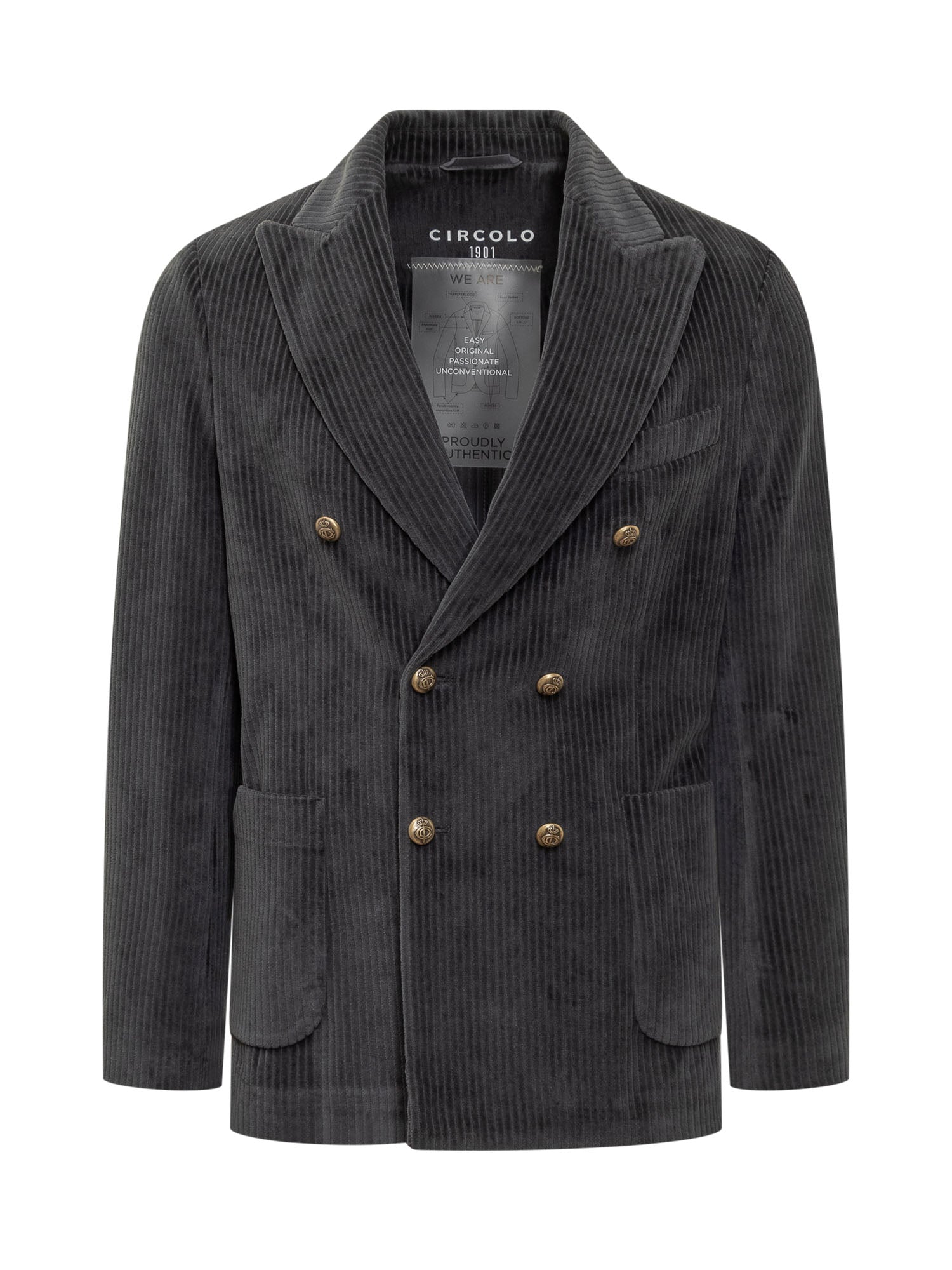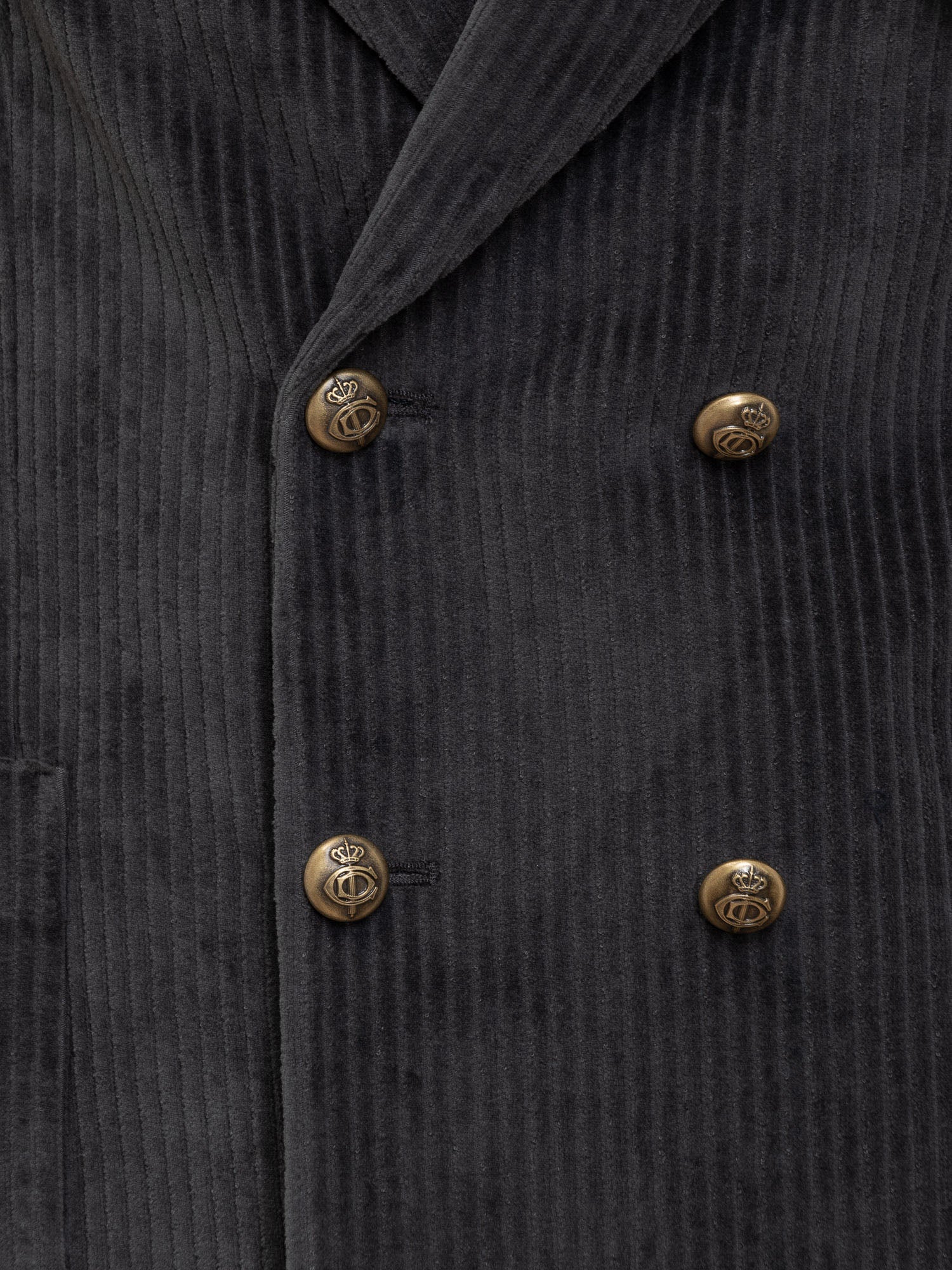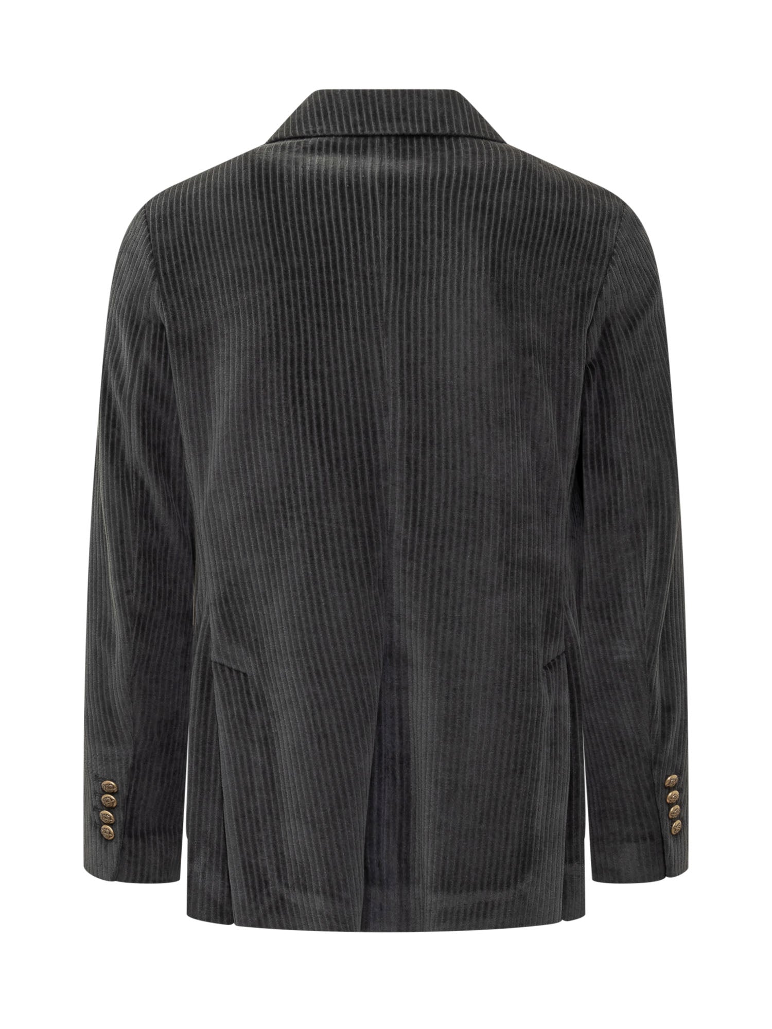Giacca blazer in velluto verde scuro. Chiusura doppio petto. Bottoni in metallo intagliati. Tasche applicate. Taschino sul petto. Collo rever. Spacchi sul retro. Bottoni sui polsini.