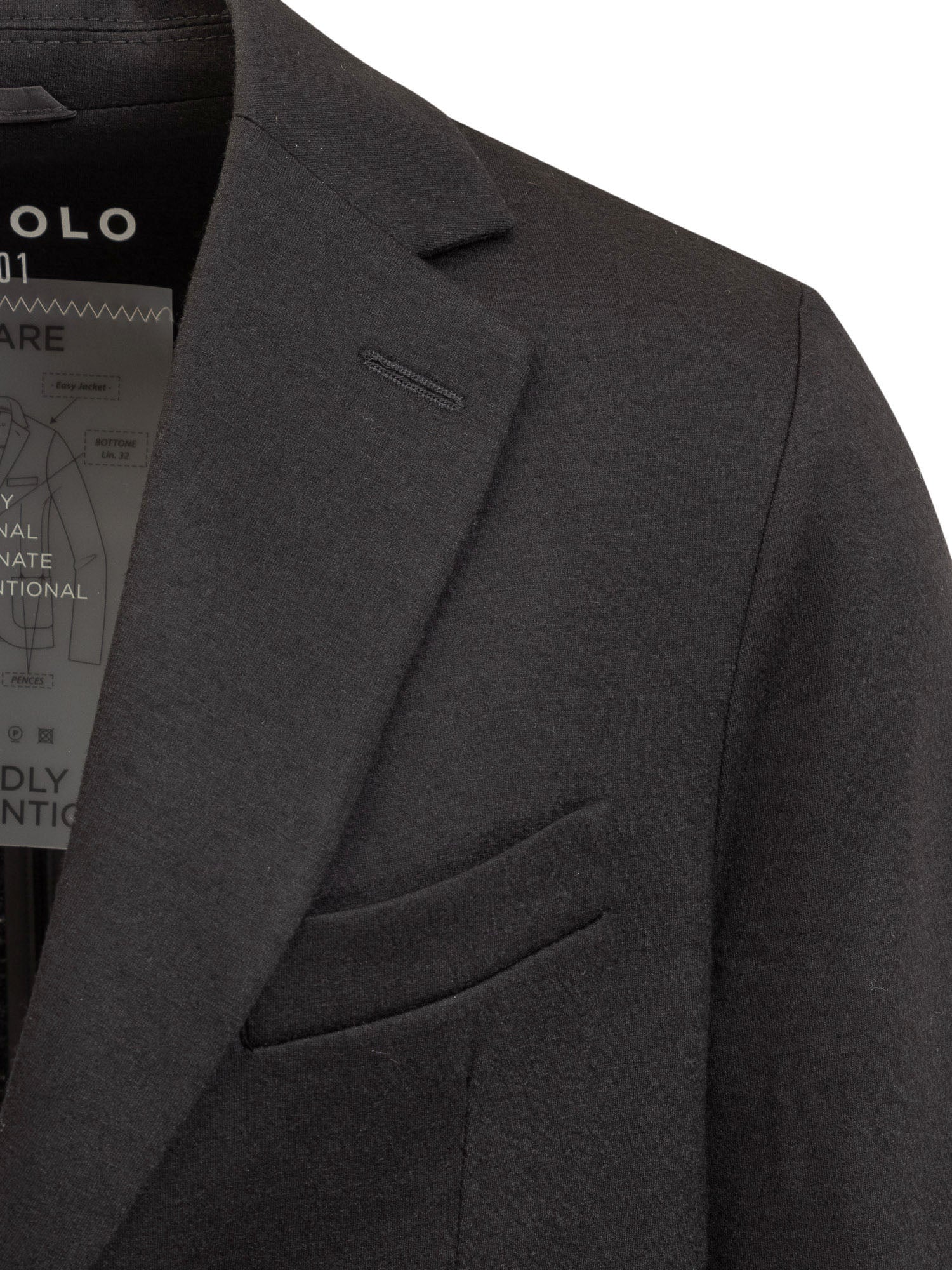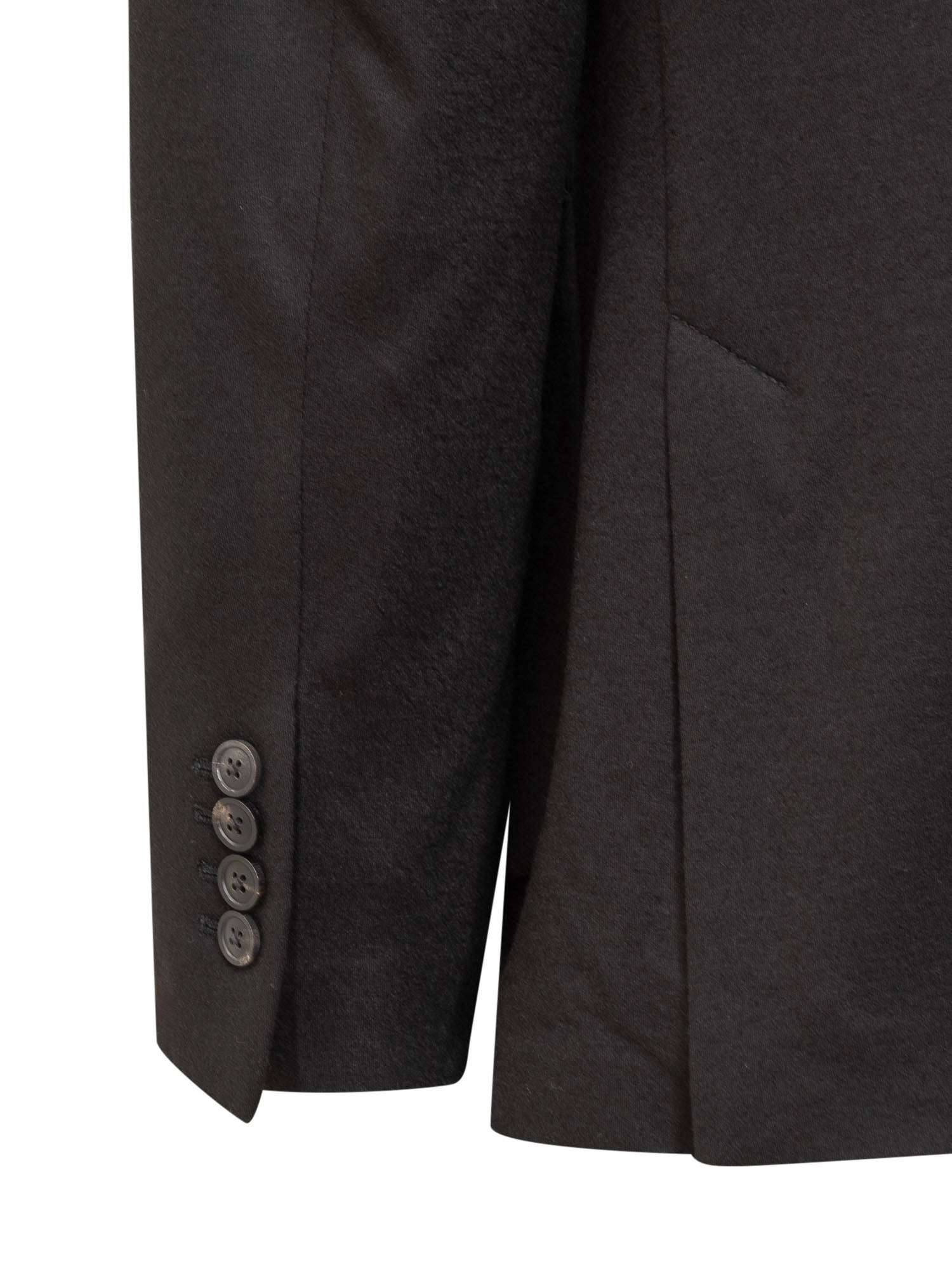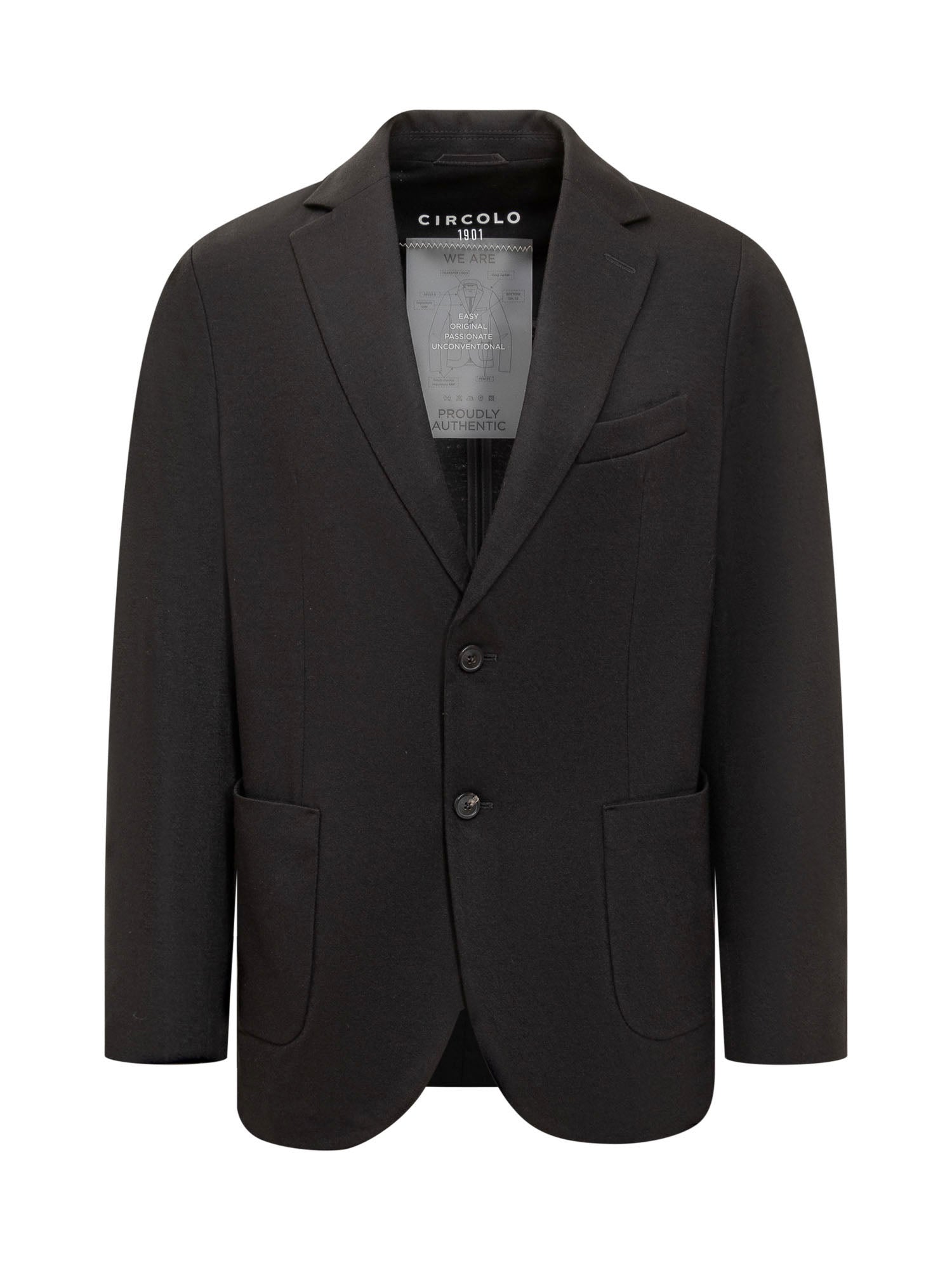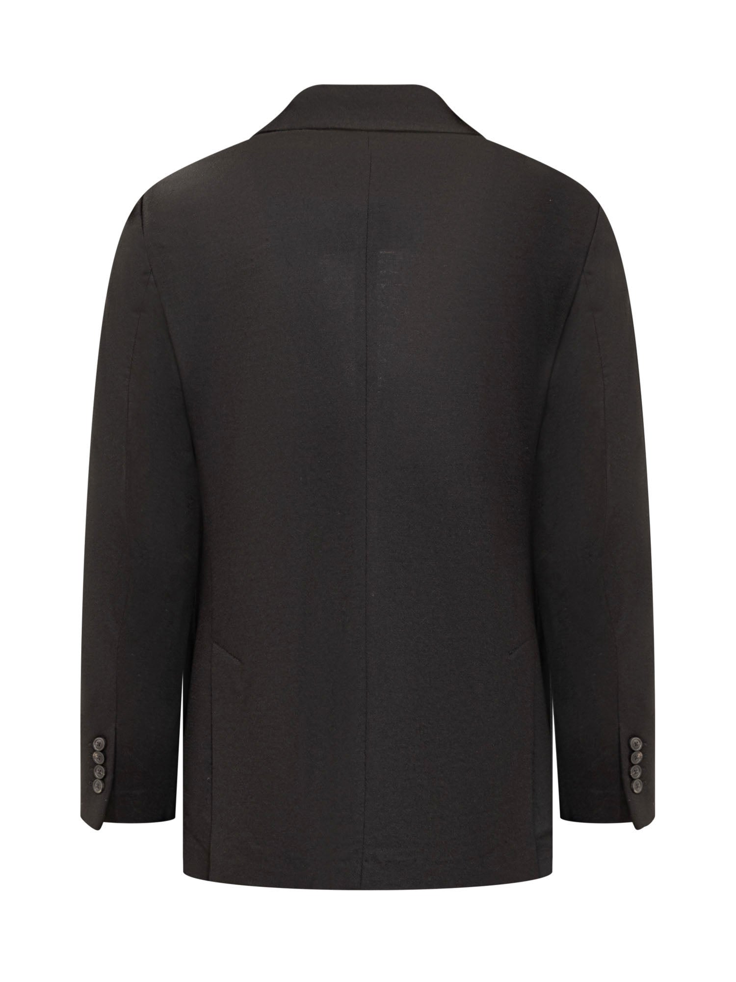 Blazer jacket. Lapel collar. Button closure. Patch pockets. Breast pocket. Cuffs with buttons. Slits on the back. Black color.