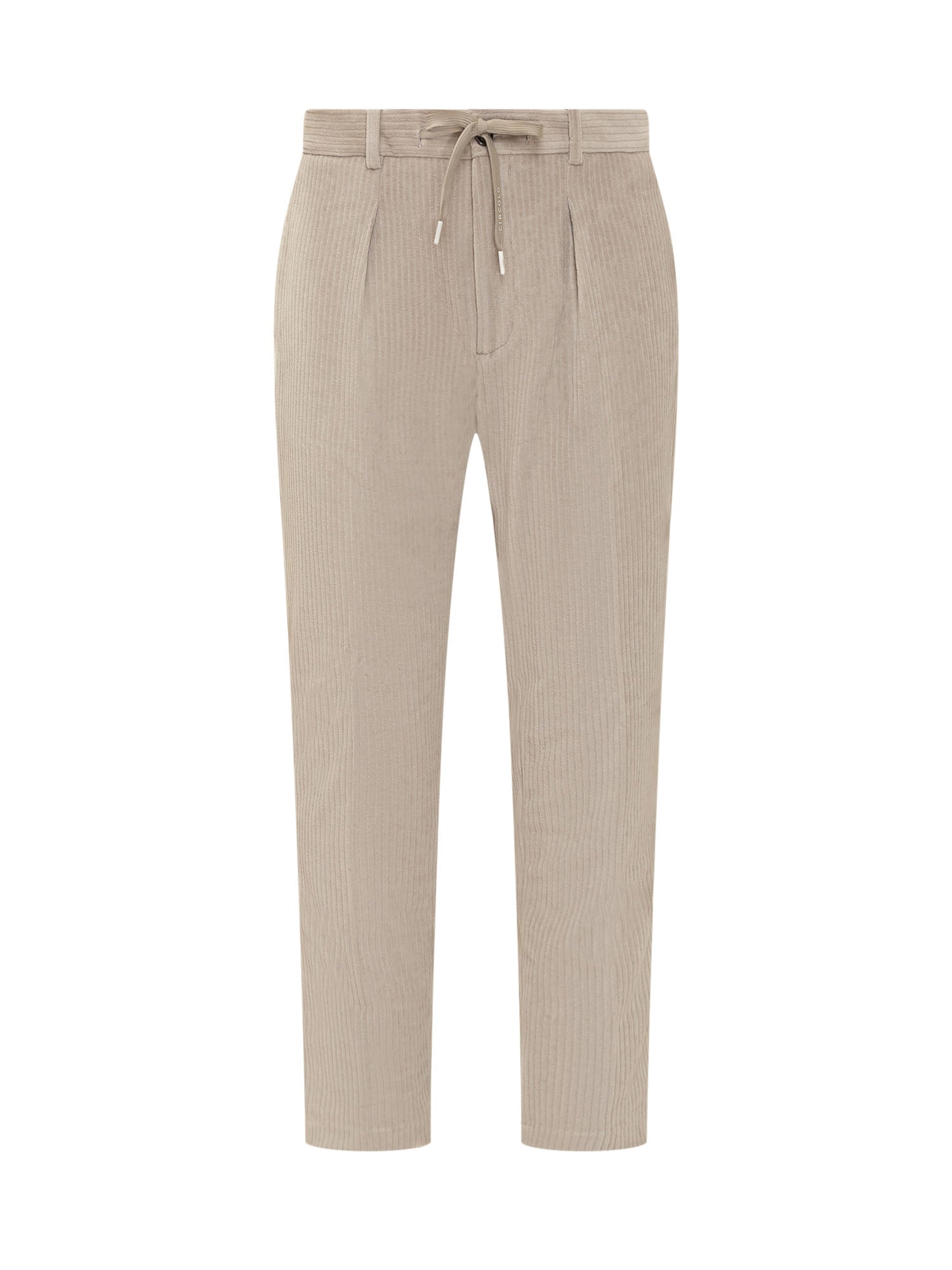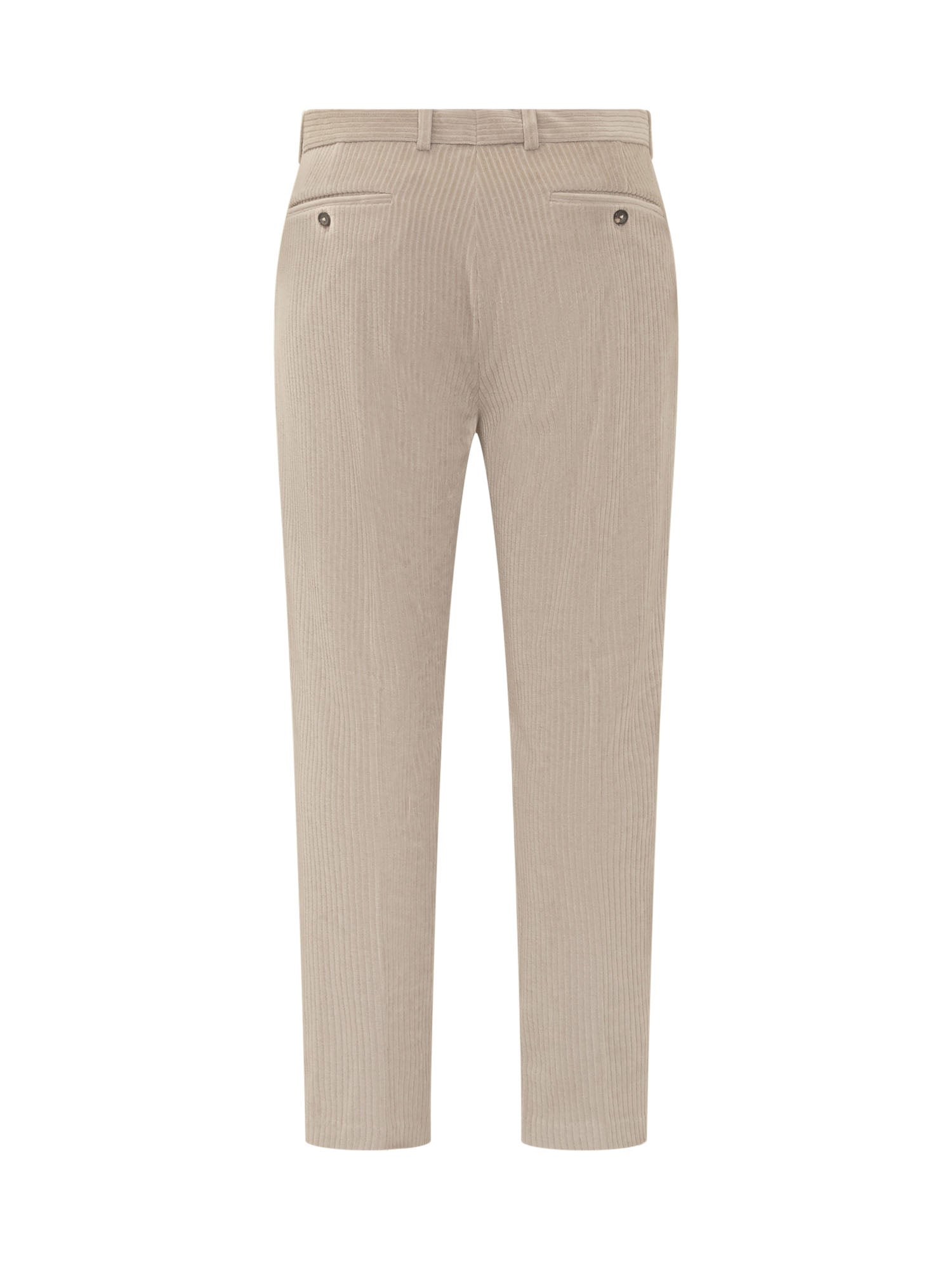 Beige velvet trousers. Button and zip closure. Drawstring waist. Belt loops. Welt pockets on the sides. Welt pockets with button on the back.
