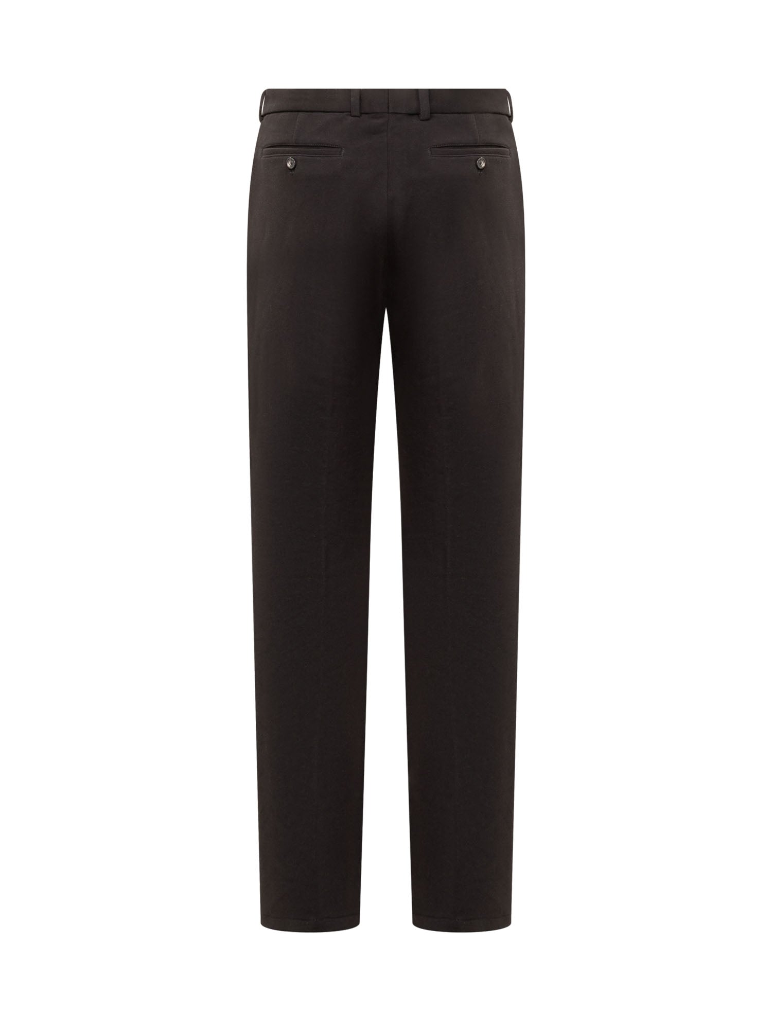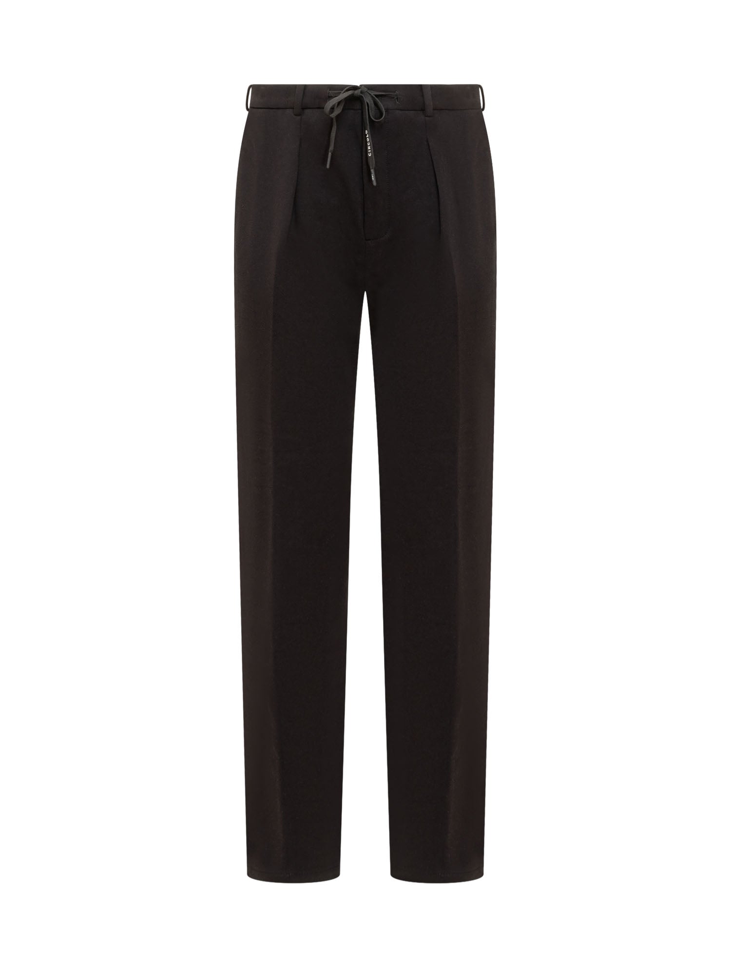 Black trousers. Button and zip closure. Drawstring waist. Belt loops. Side pockets. Side pockets with button on the back.