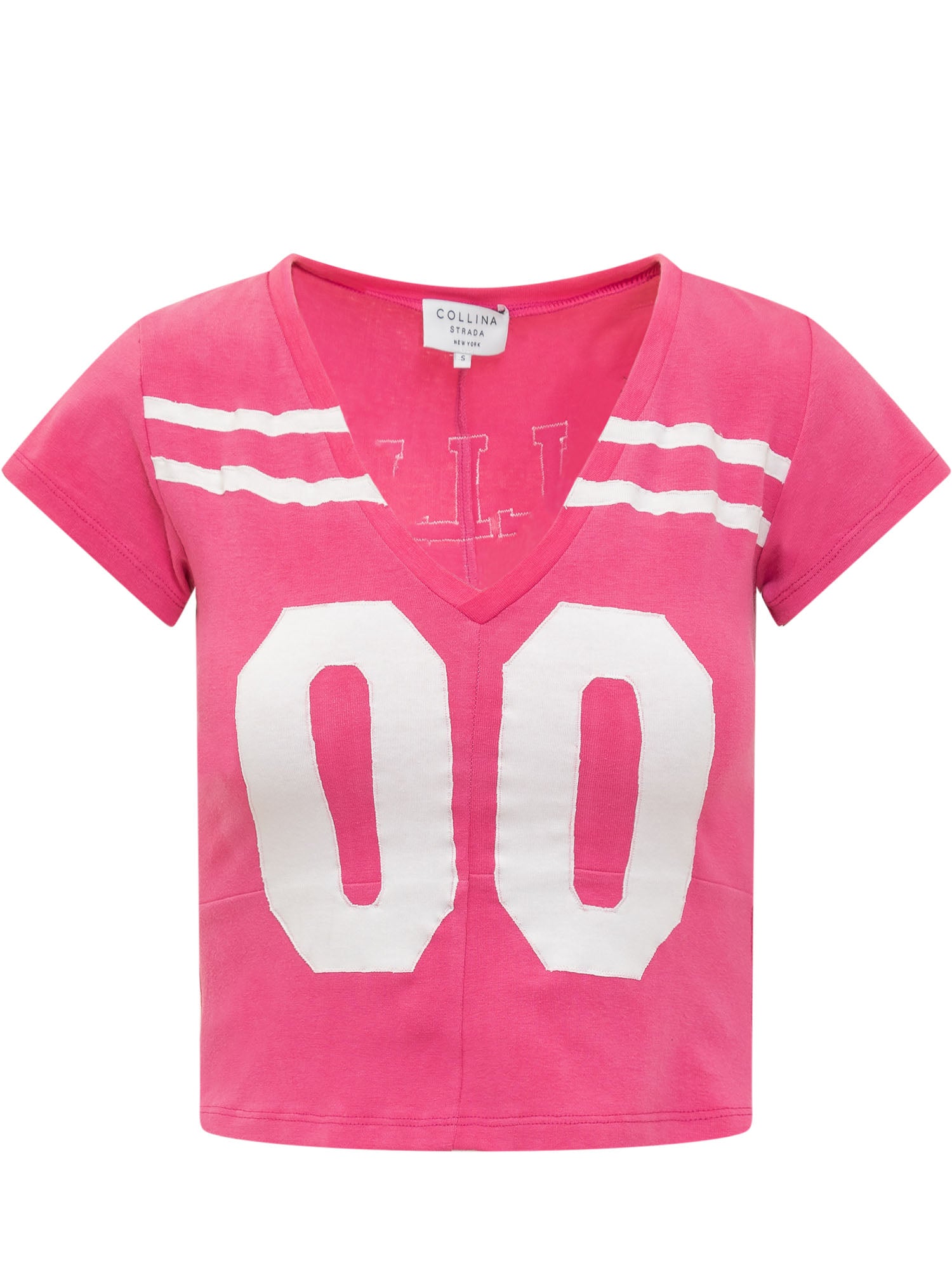 T-shirt with V-neck. Logo with patch writing on the front and back.