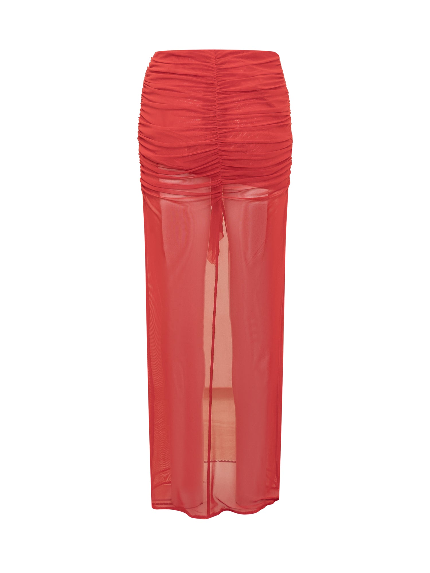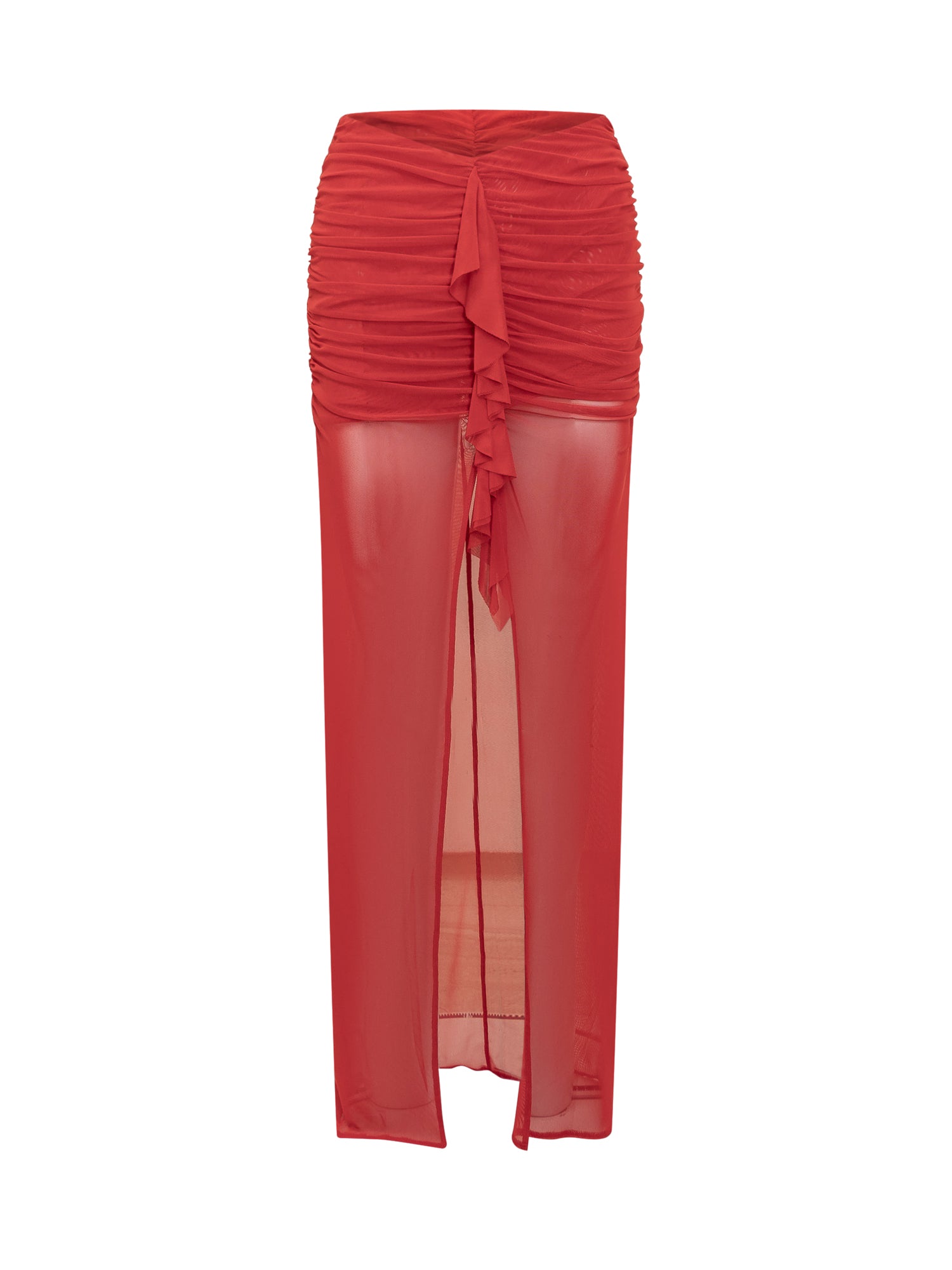Long skirt. Zipper and hook-and-eye closure on the side. Zipper closure at back. All-over ruffles with drape and sheer.