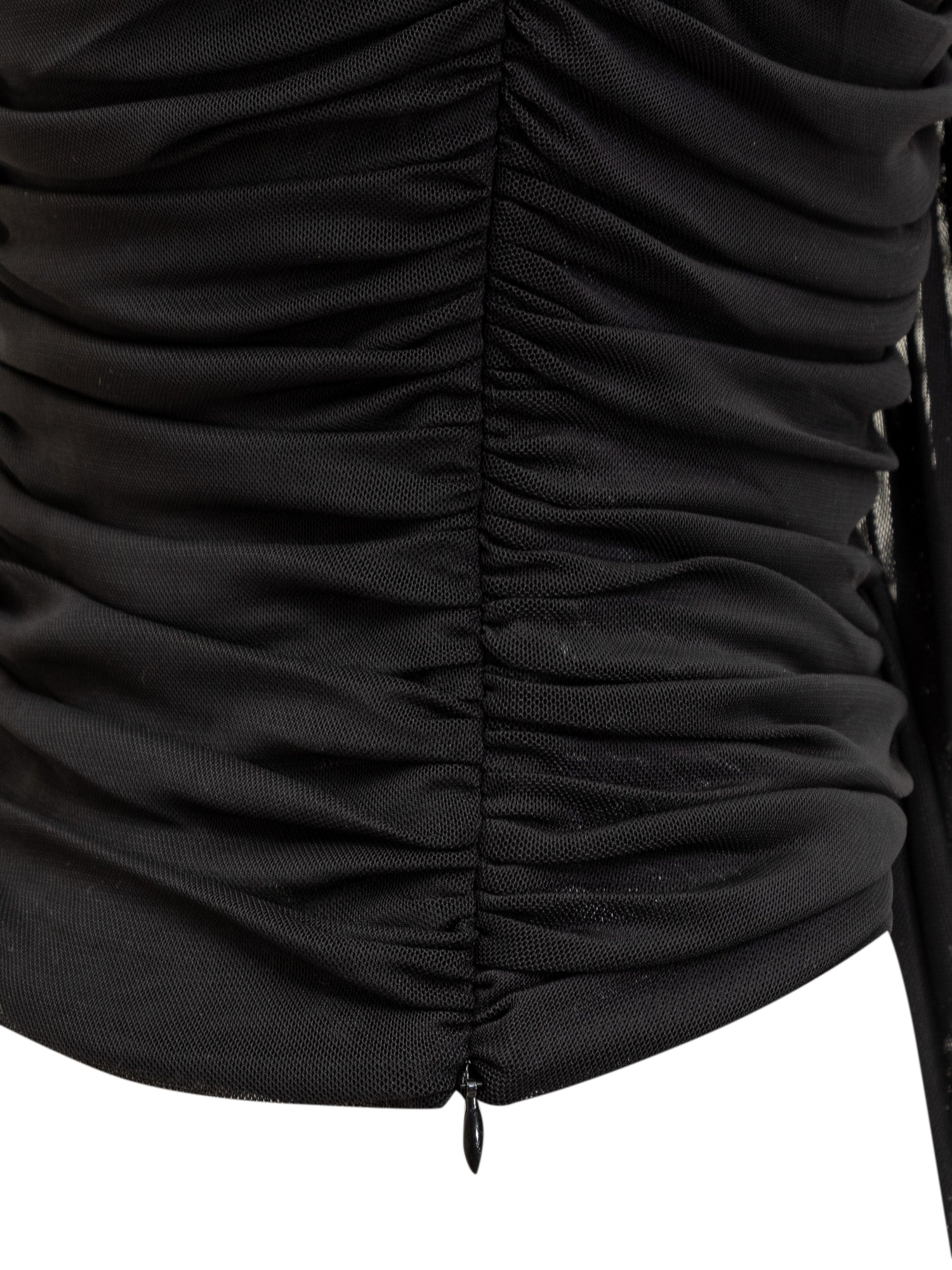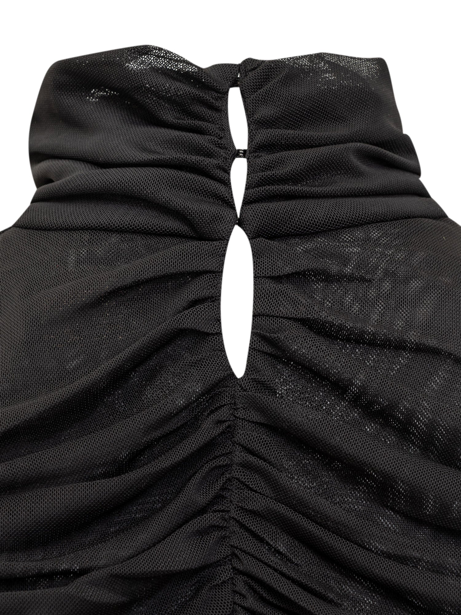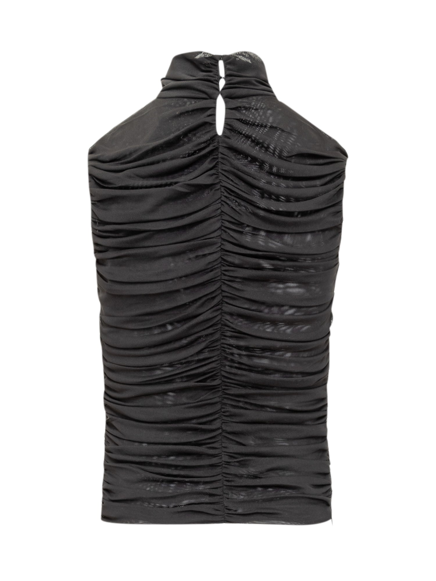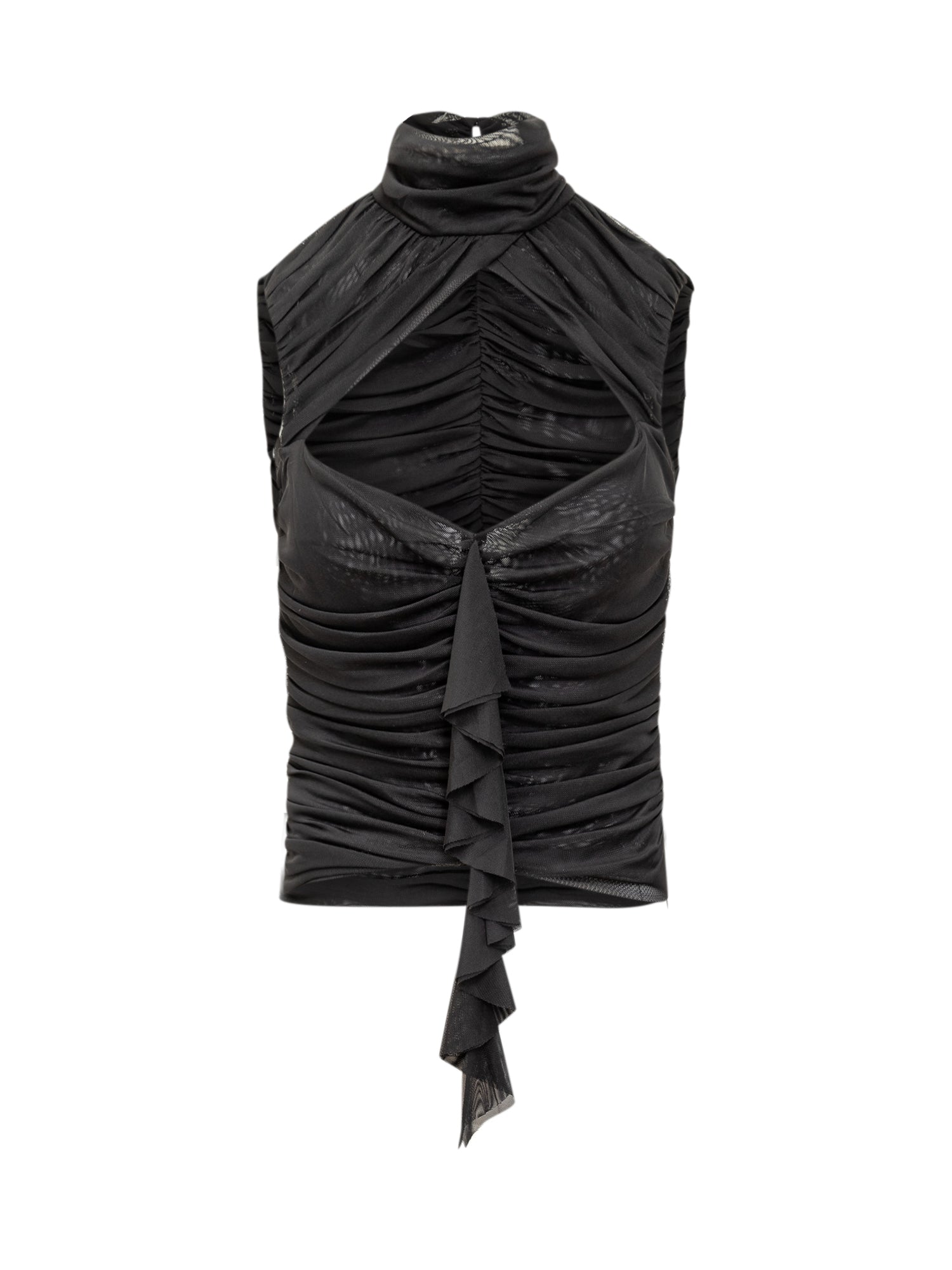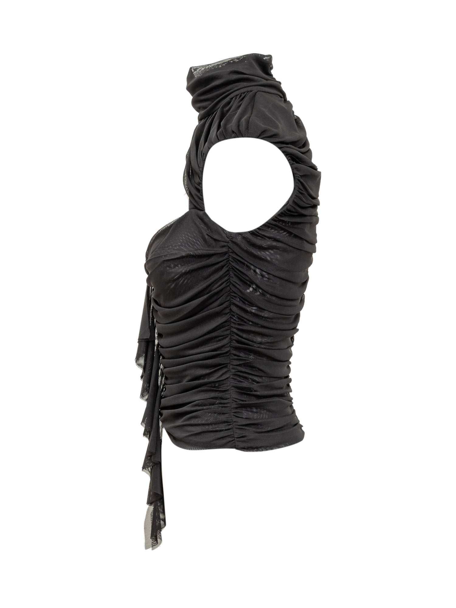 Sleeveless top. High collar and cut-out neckline. Back button closure. All-over ruffles with drape.