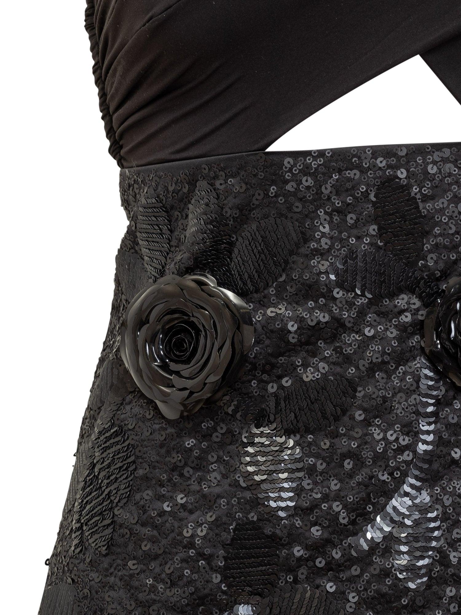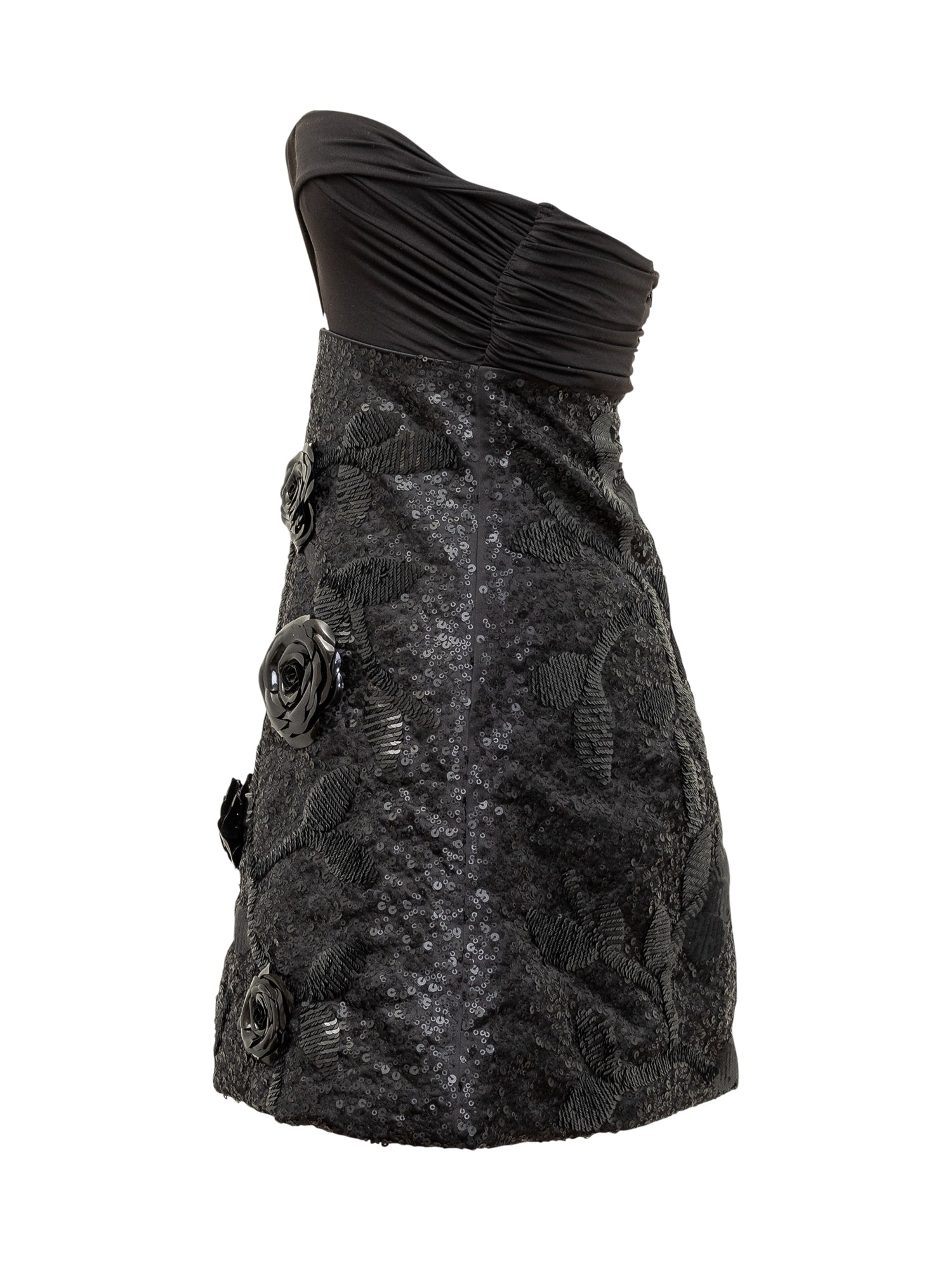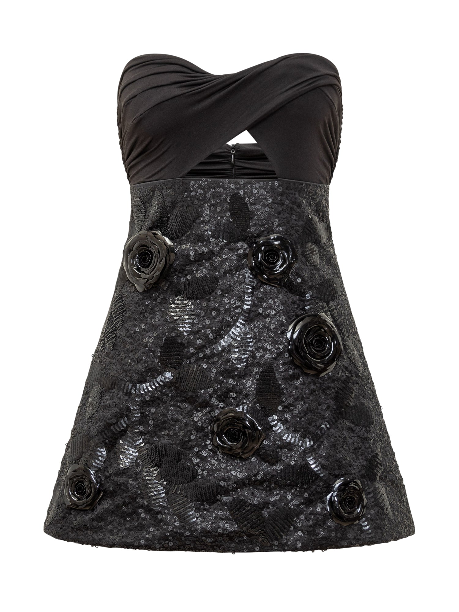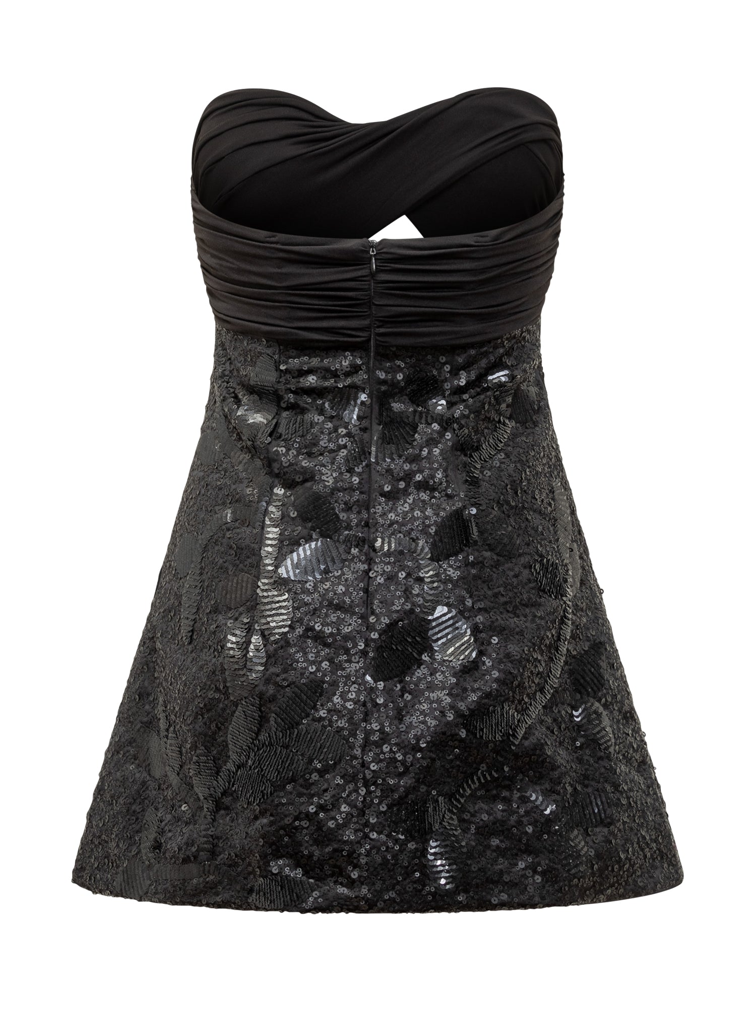 Mini dress. Sweetheart neckline with draping effect. Zip closure on the back. Cut out on the front. Floral decoration with sequins.