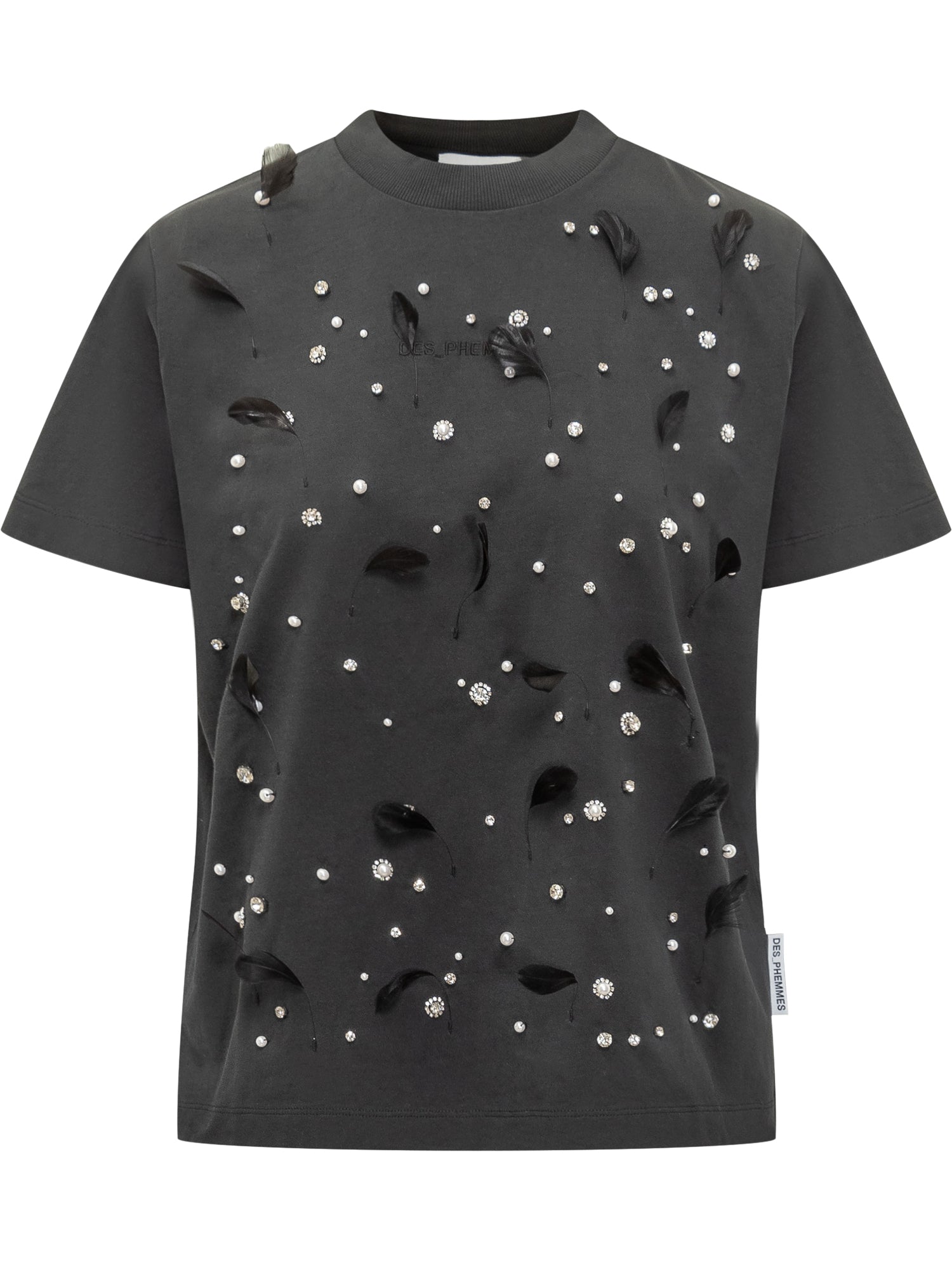 Black cotton Des Phemmes t-shirt embellished with jewel details, pearls, and feather applications.