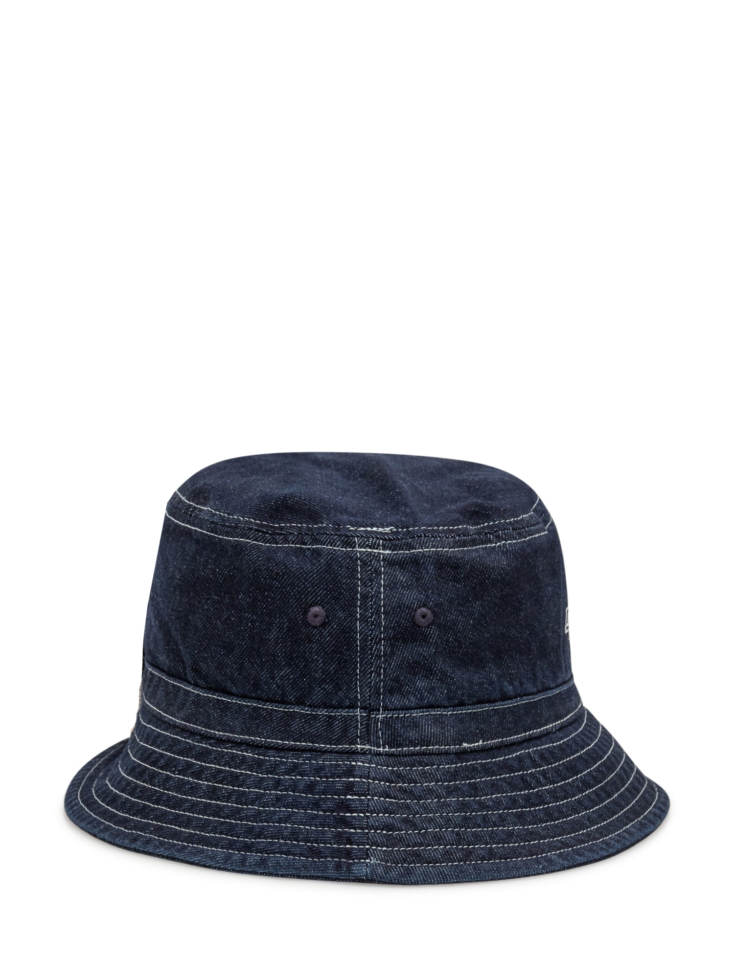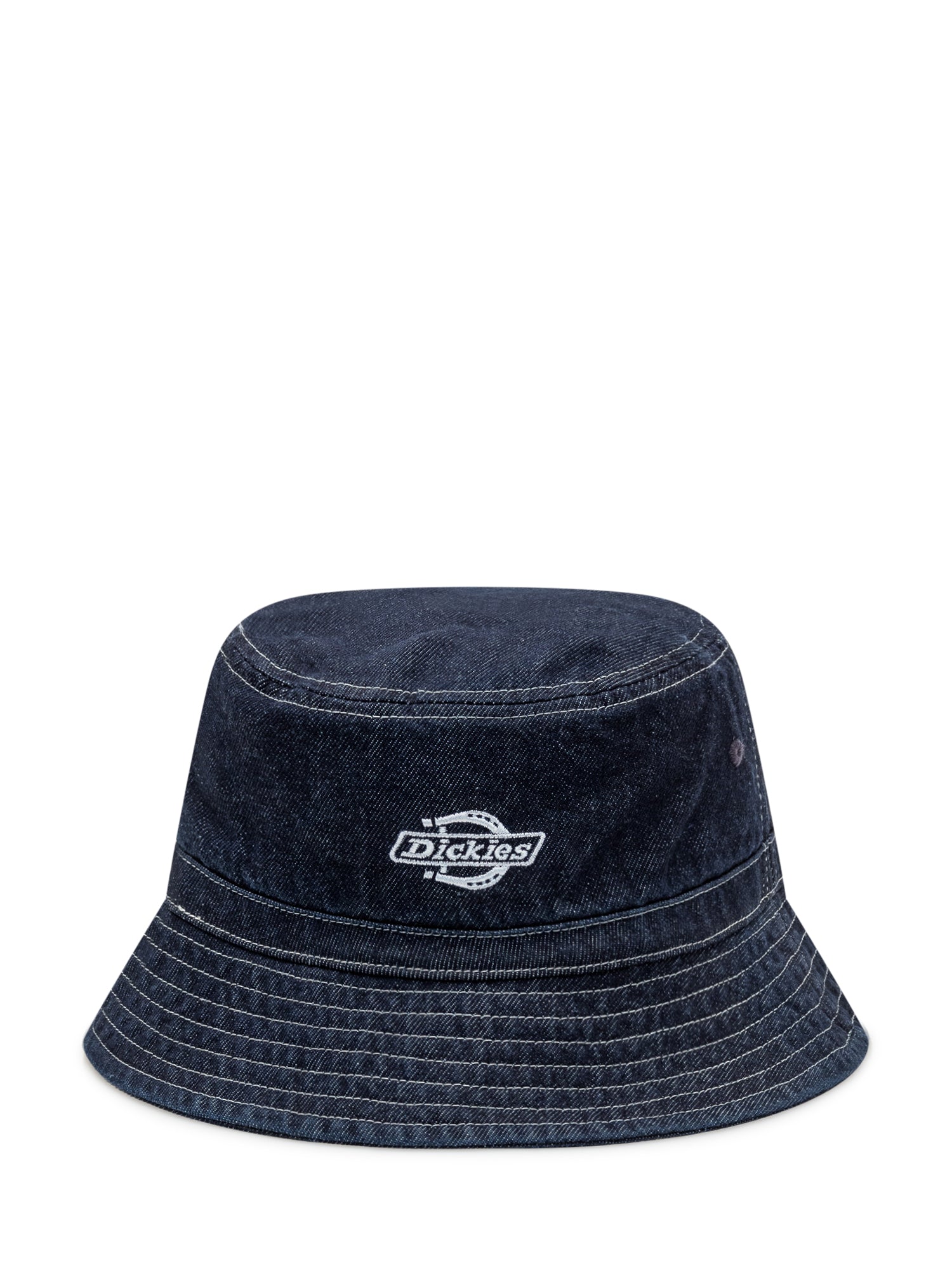 Blue denim hat. Bucket pattern. Embroidered logo.