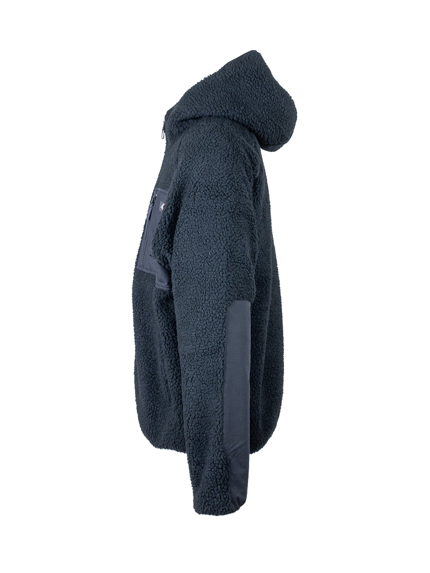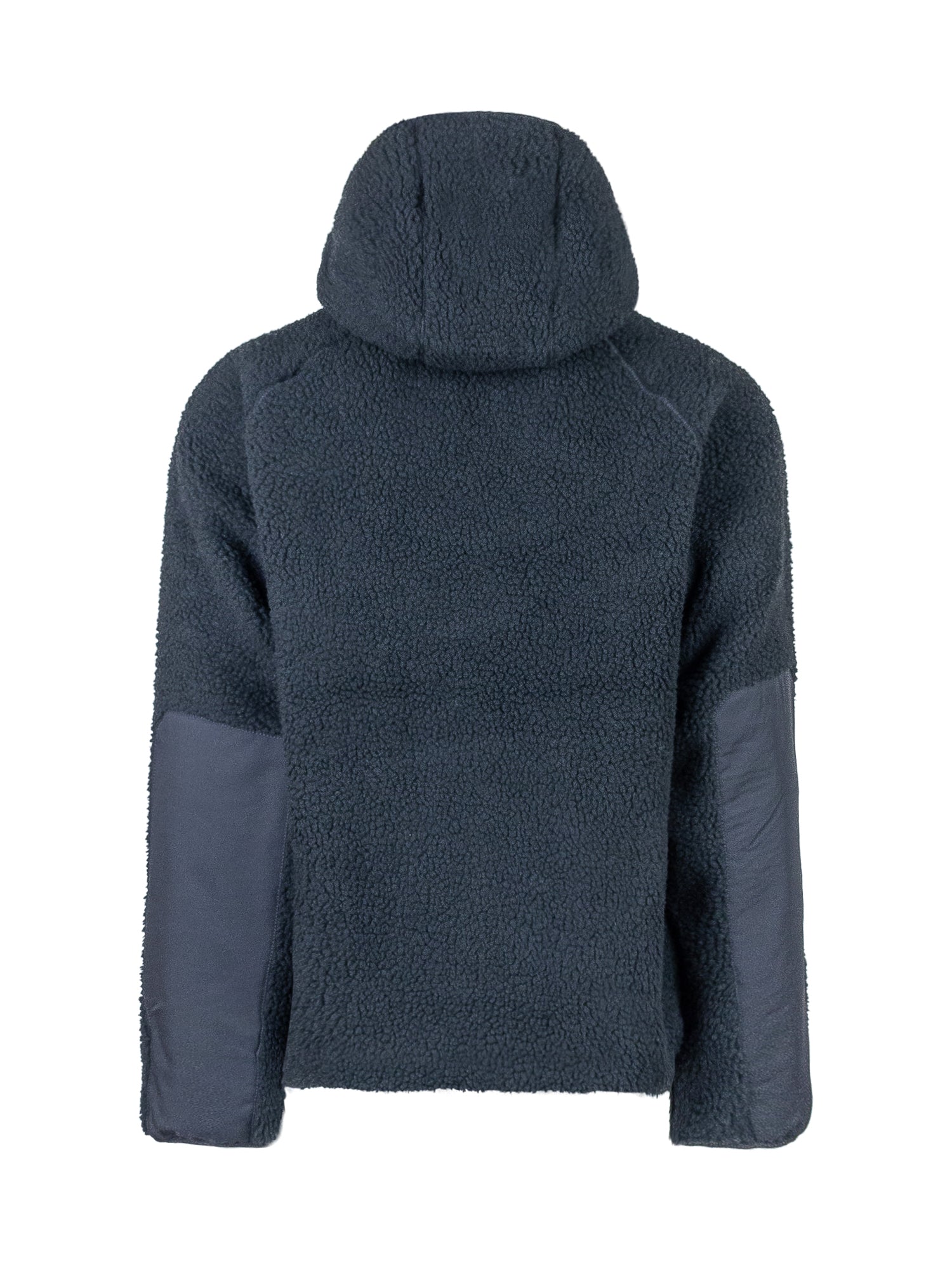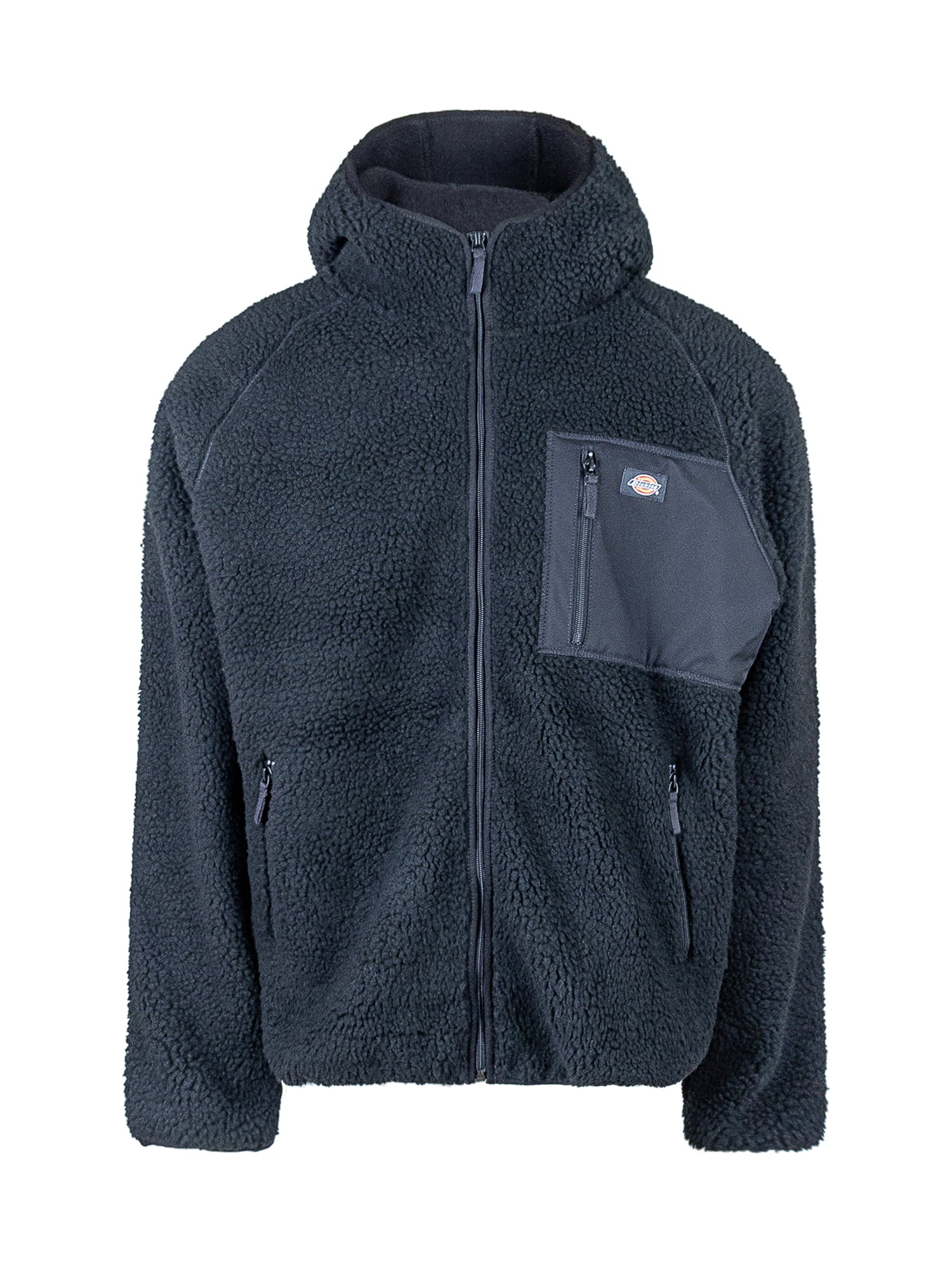 Dickies blue fleece jacket featuring a hood and zip closure. Designed with side pockets and a zip chest pocket with logo patch.