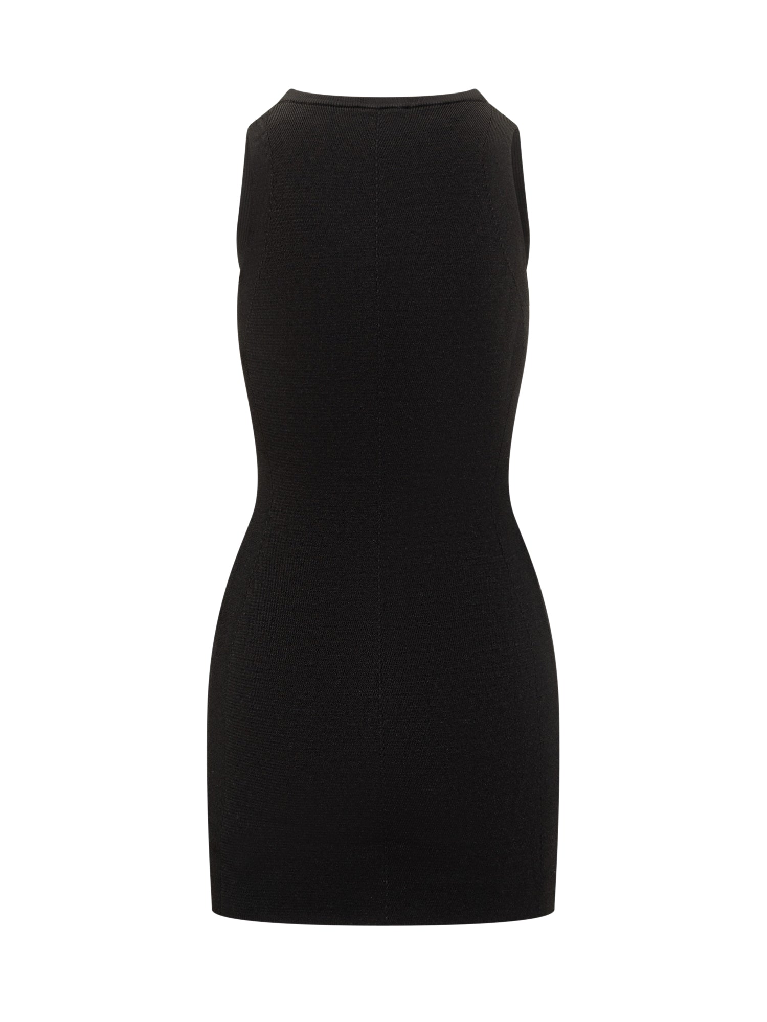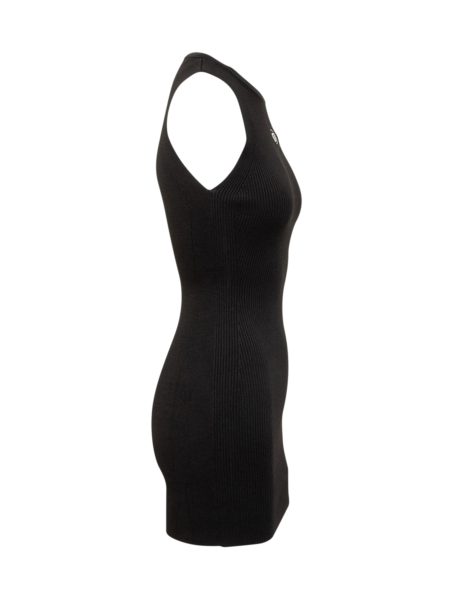 Sleeveless Diesel mini dress in black stretch knit, featuring a body-hugging fit and metallic logo on the chest.