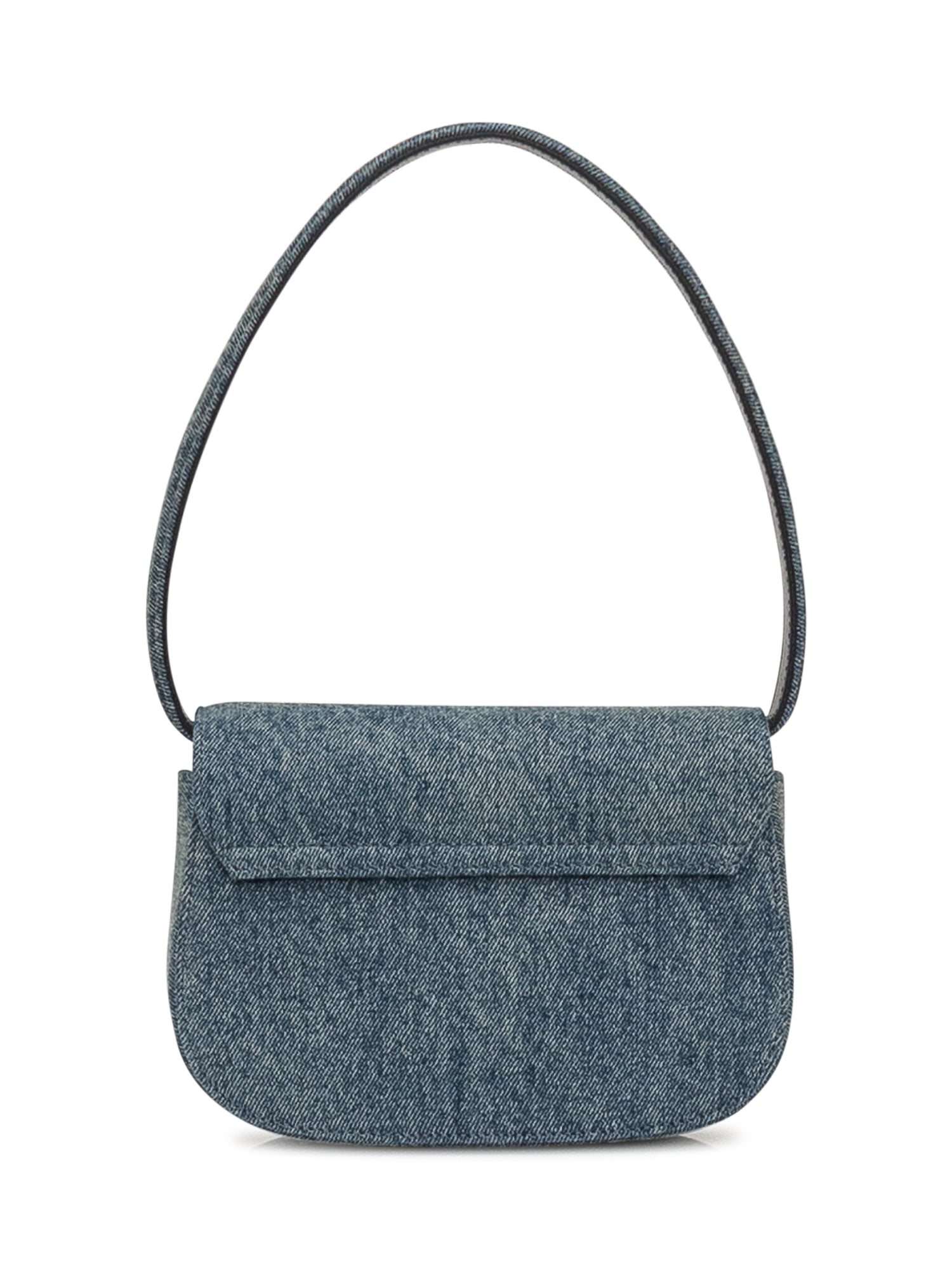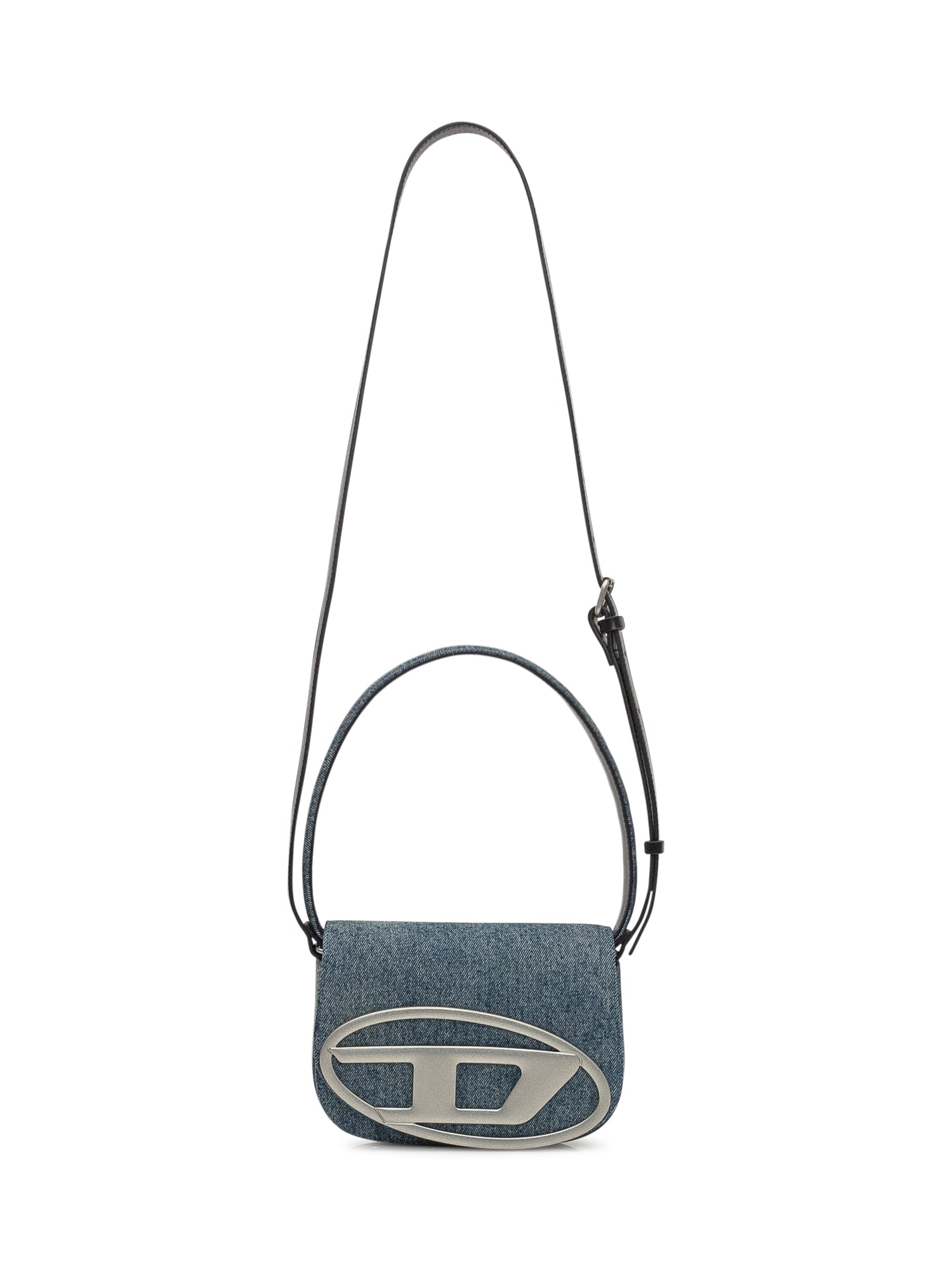 Diesel 1DR women's bag in denim, featuring the iconic metal logo on the front. Compact and modern design, fixed strap, flap closure.