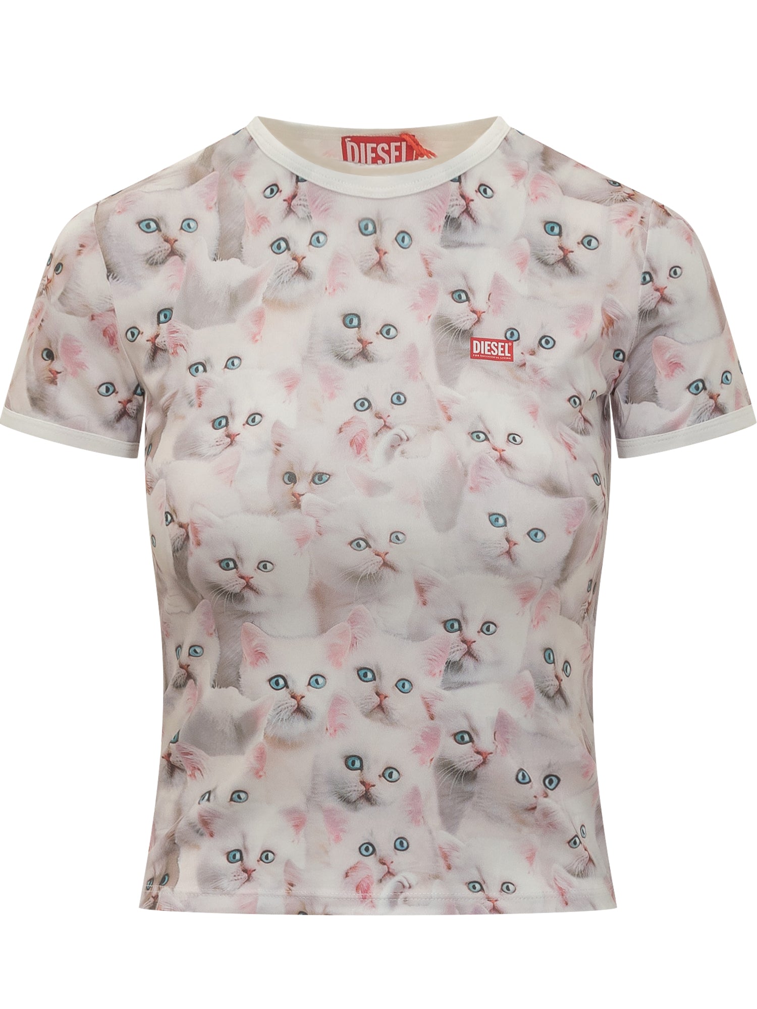 Slim fit Diesel T-shirt in stretch jersey with all-over kitten print and red chest logo.