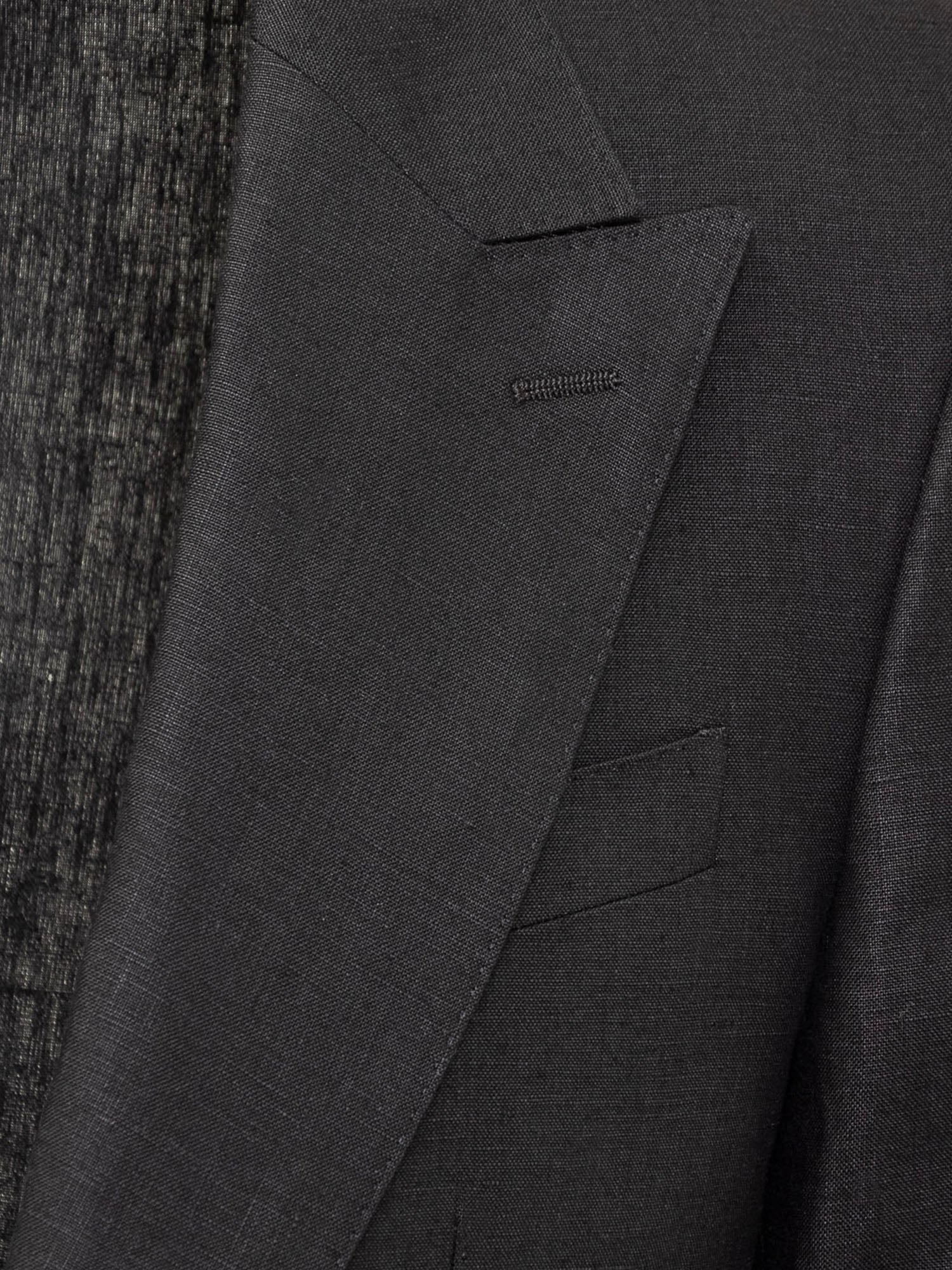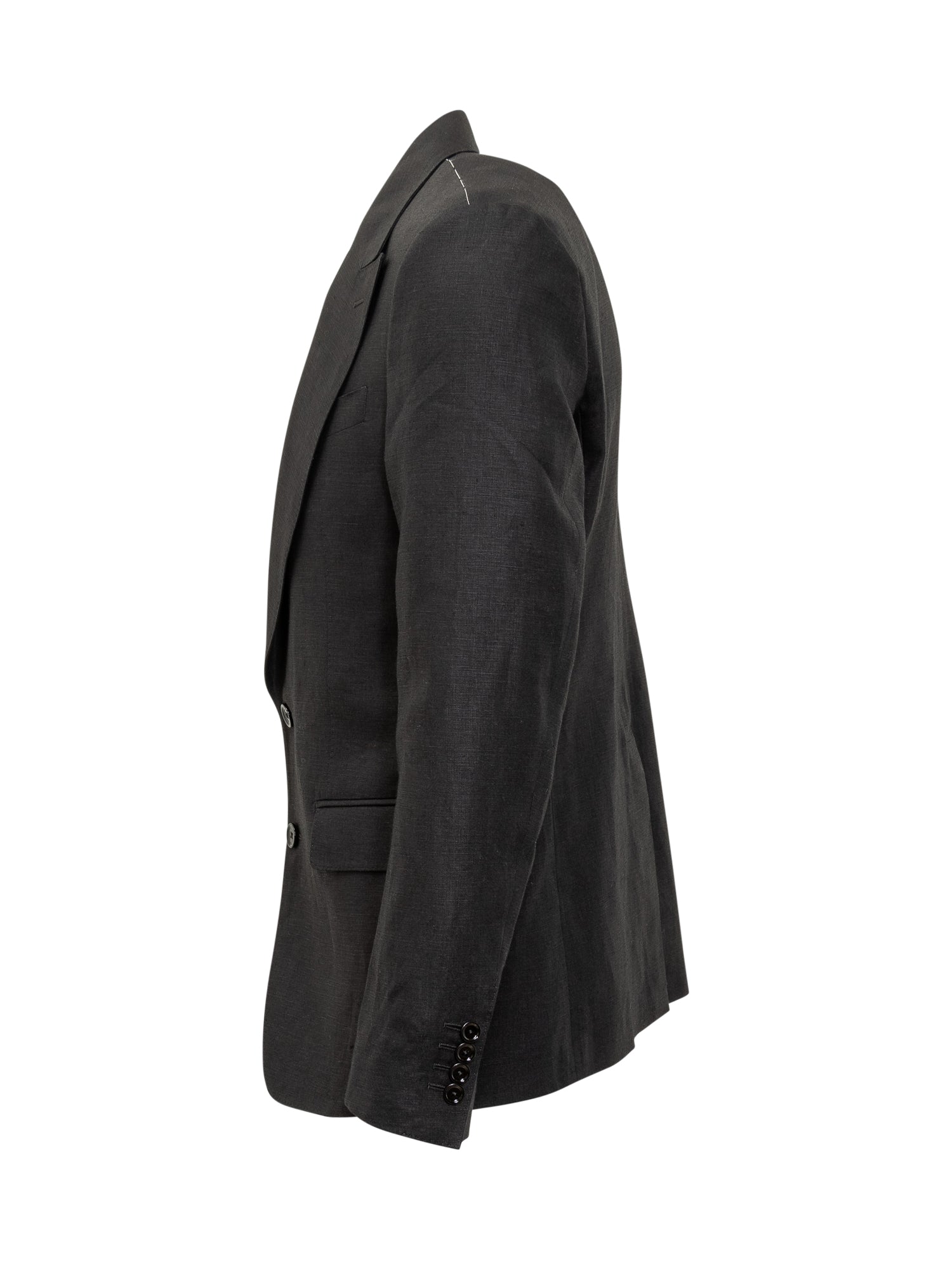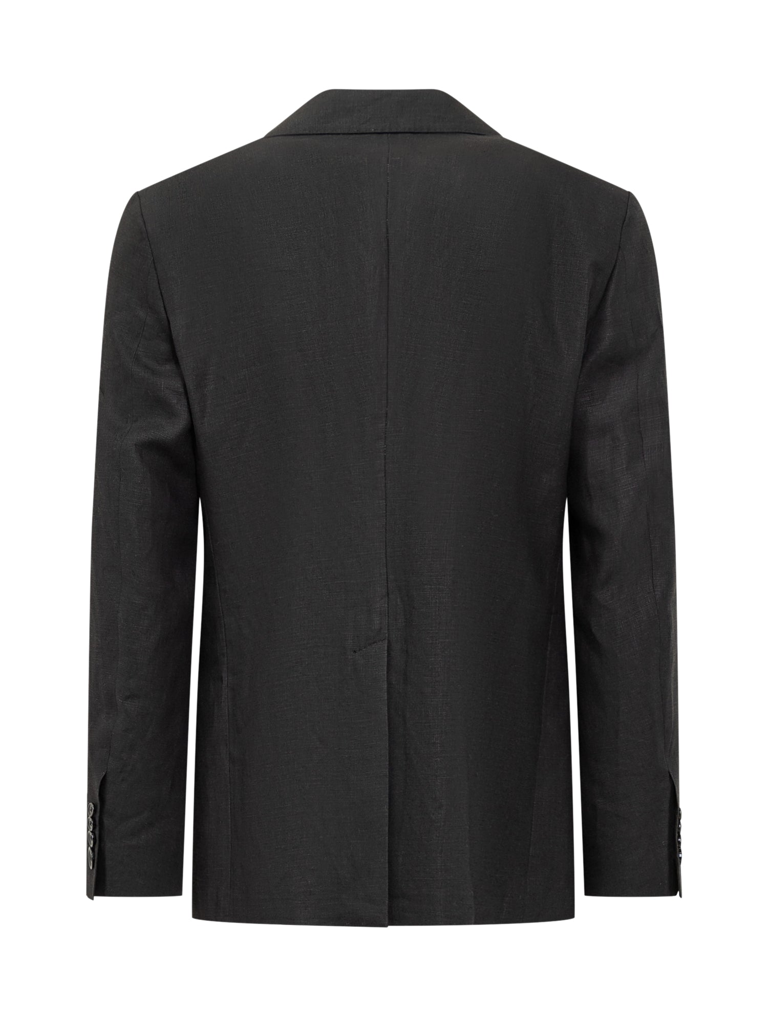 Black linen jacket. Lapel collar. Flap pockets. Cuffs with buttons. Chest pocket. Button closure.