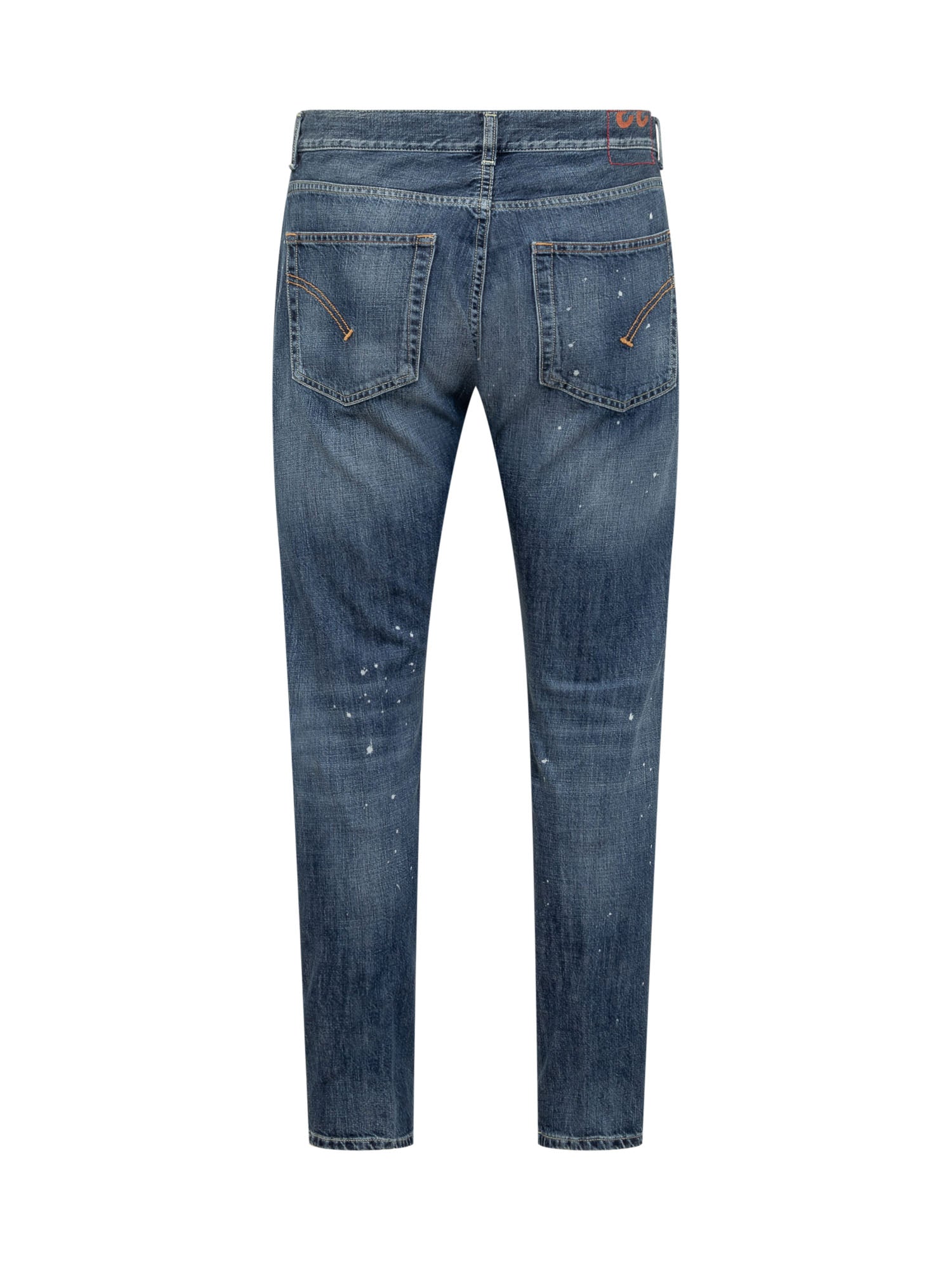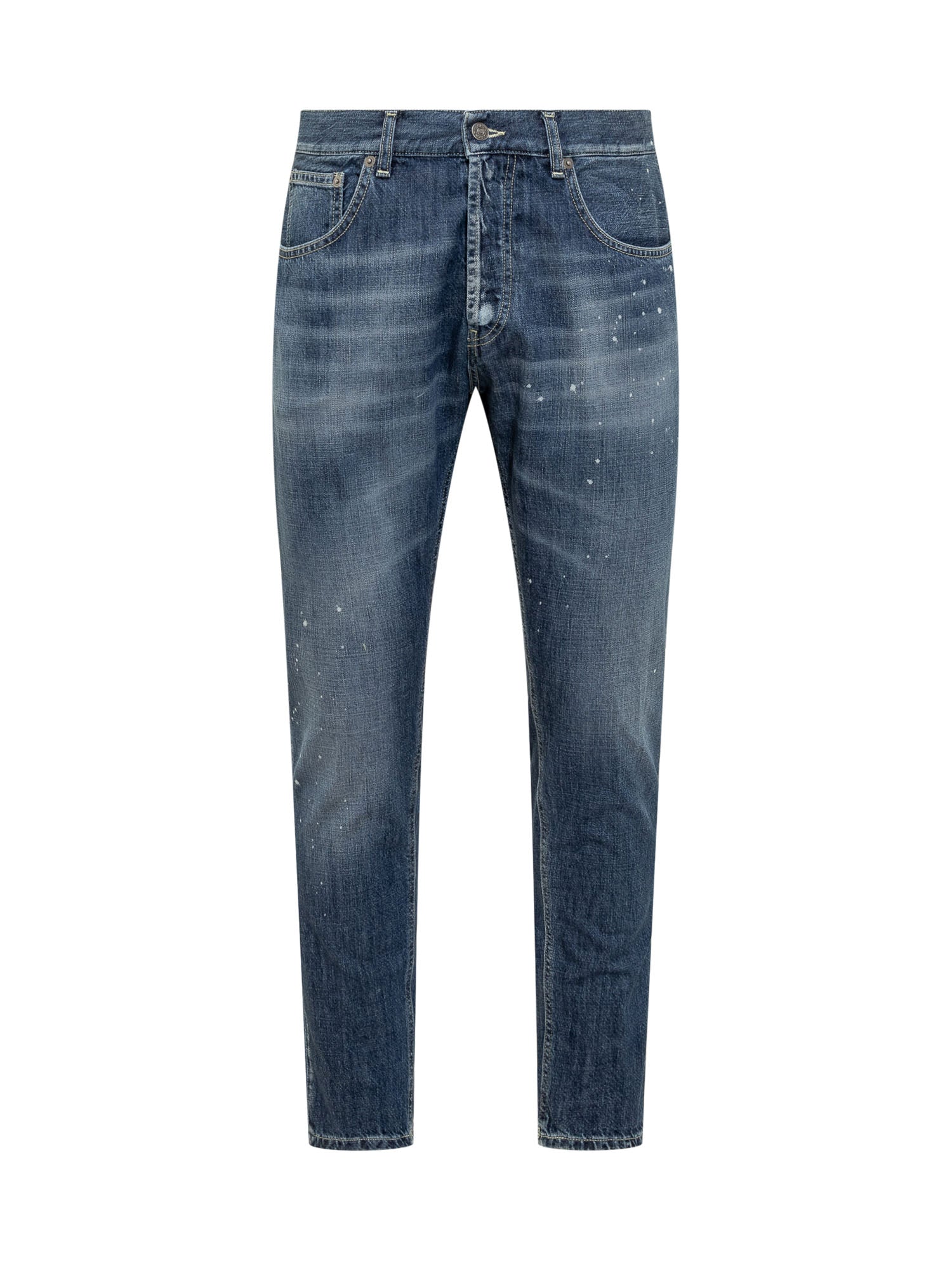Carrot slim fit jeans. Button closure. Belt loops. Five pockets. Metal logo on the back. Spoiled all over effect.