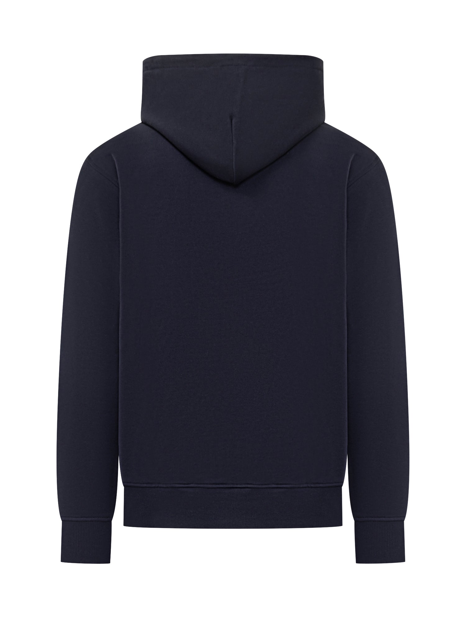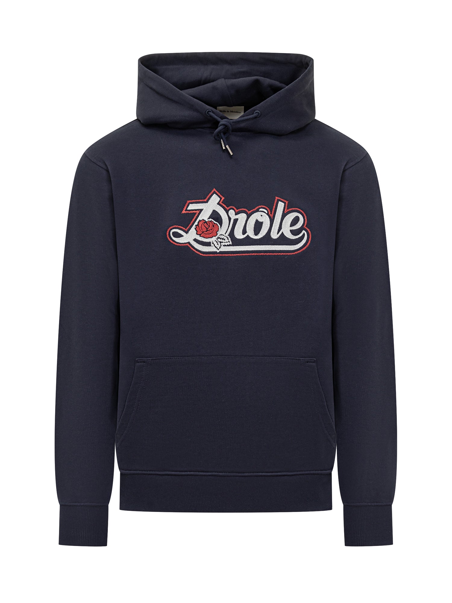 Drole de Monsieur blue cotton hoodie with embroidered logo and rose detail on chest.