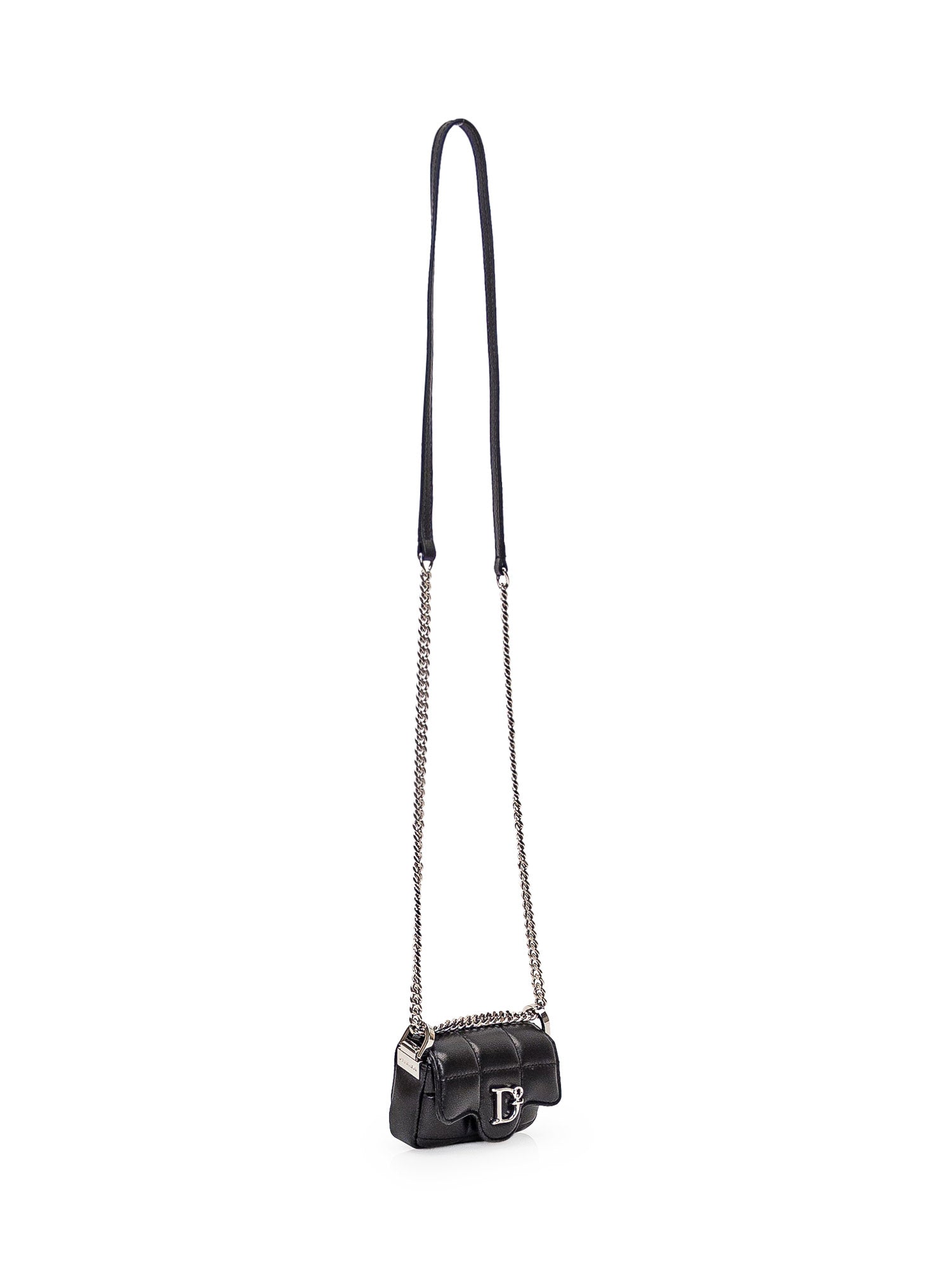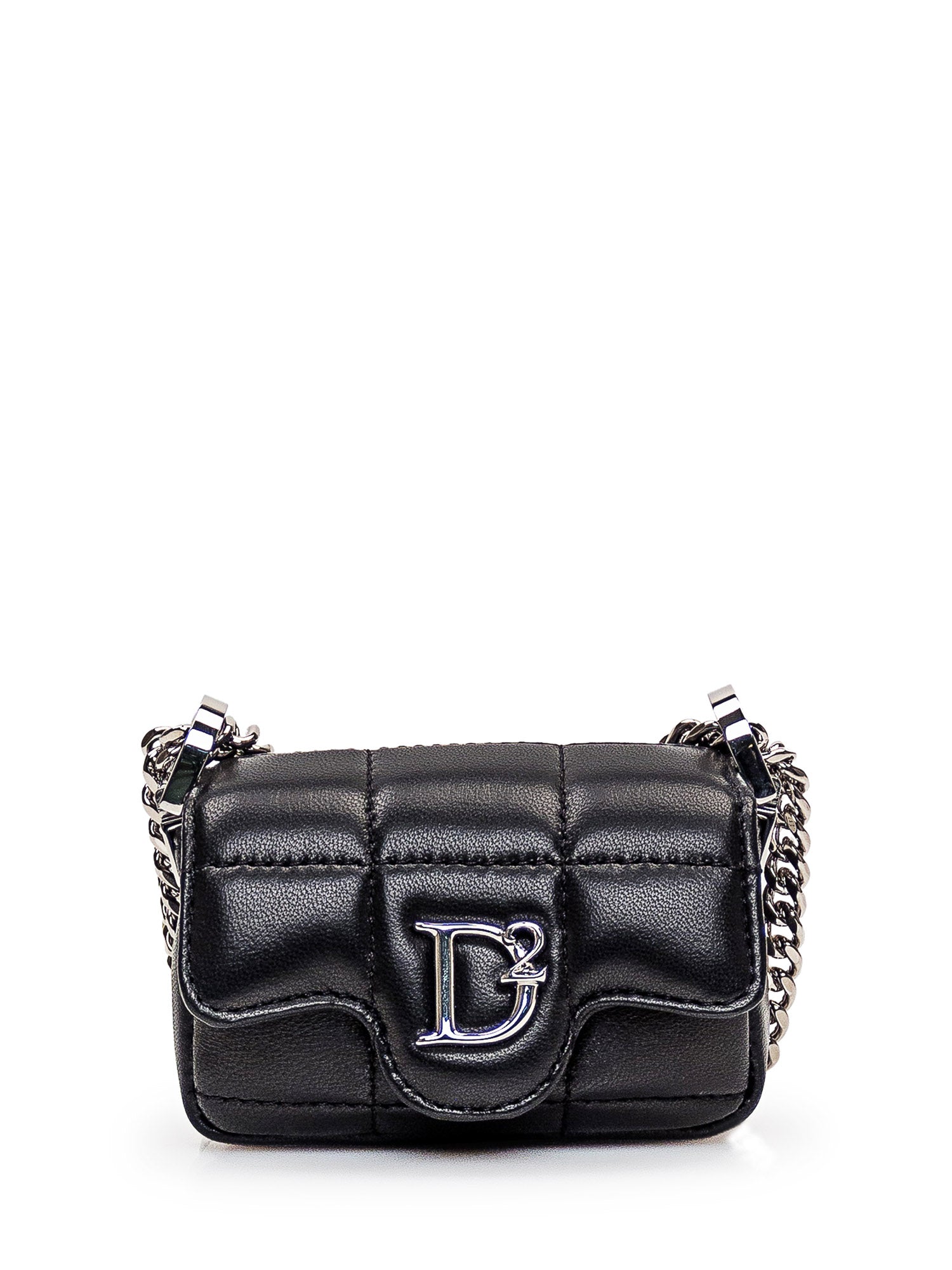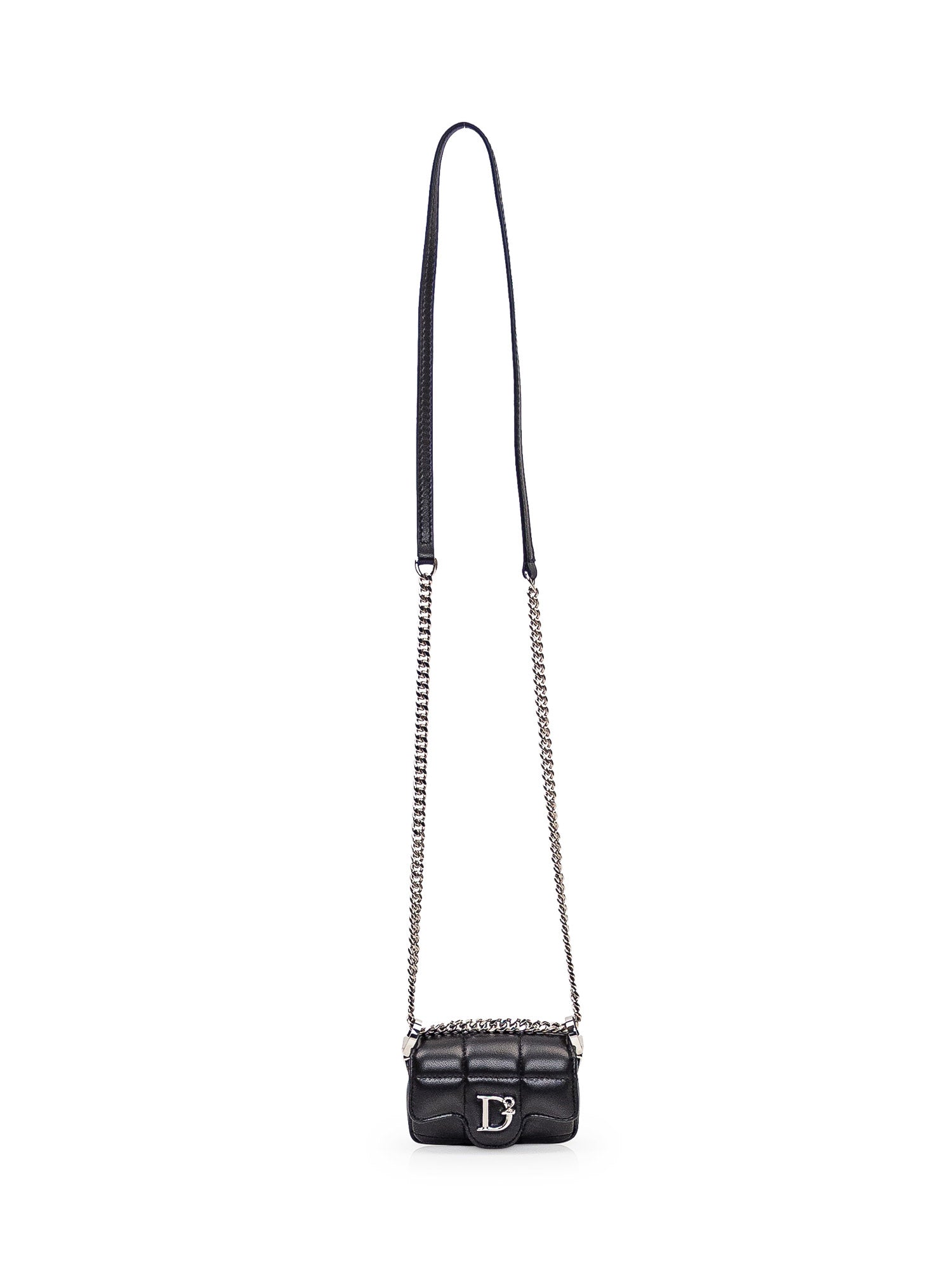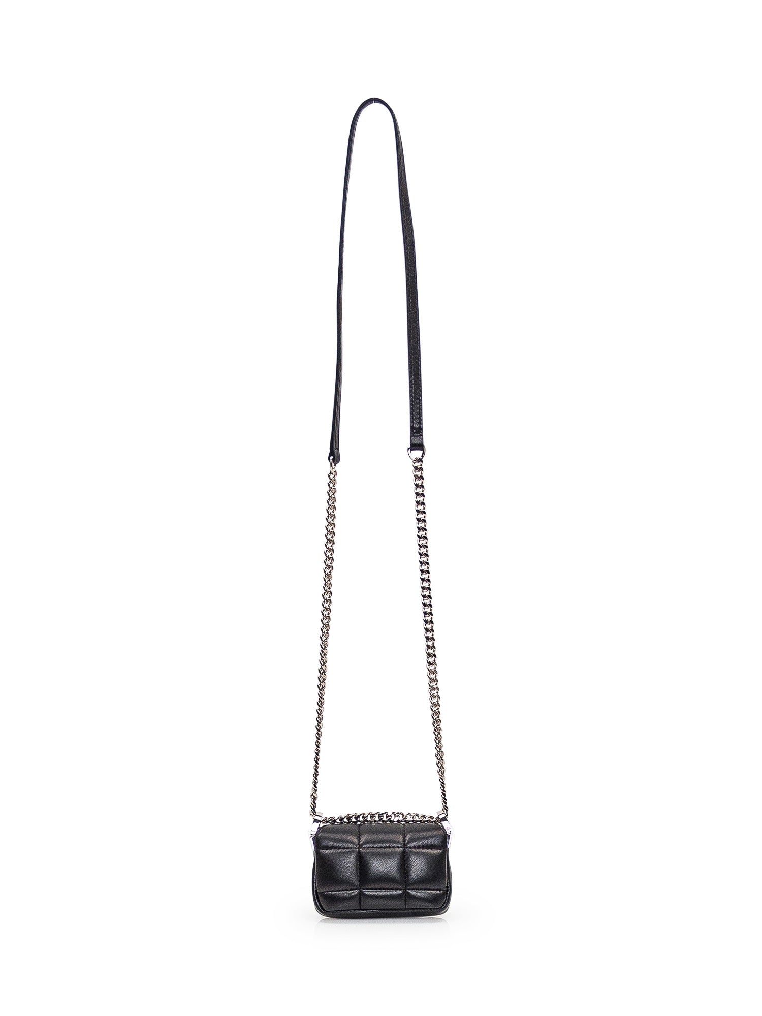 Black leather shoulder bag with all-over quilted pattern. Chain shoulder strap. Flap closure with button. Metal monogram on the front.