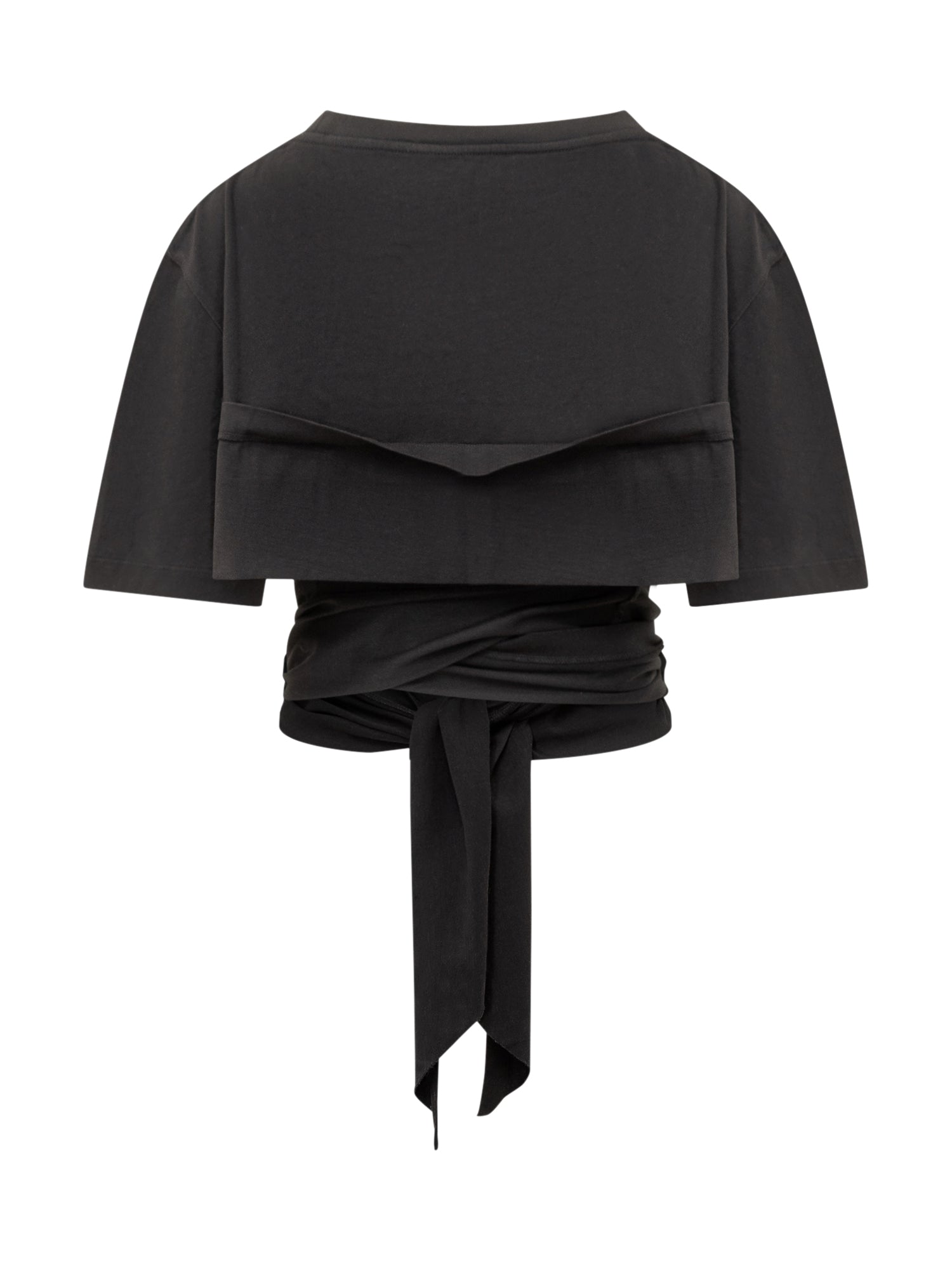 DSquared2 black cotton T-shirt featuring a tone-on-tone embroidered logo. Front tie detail.