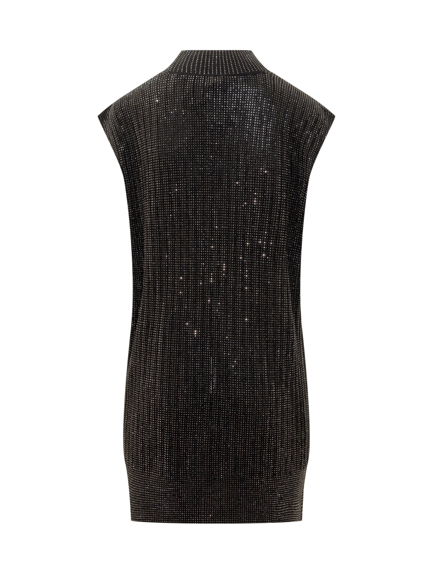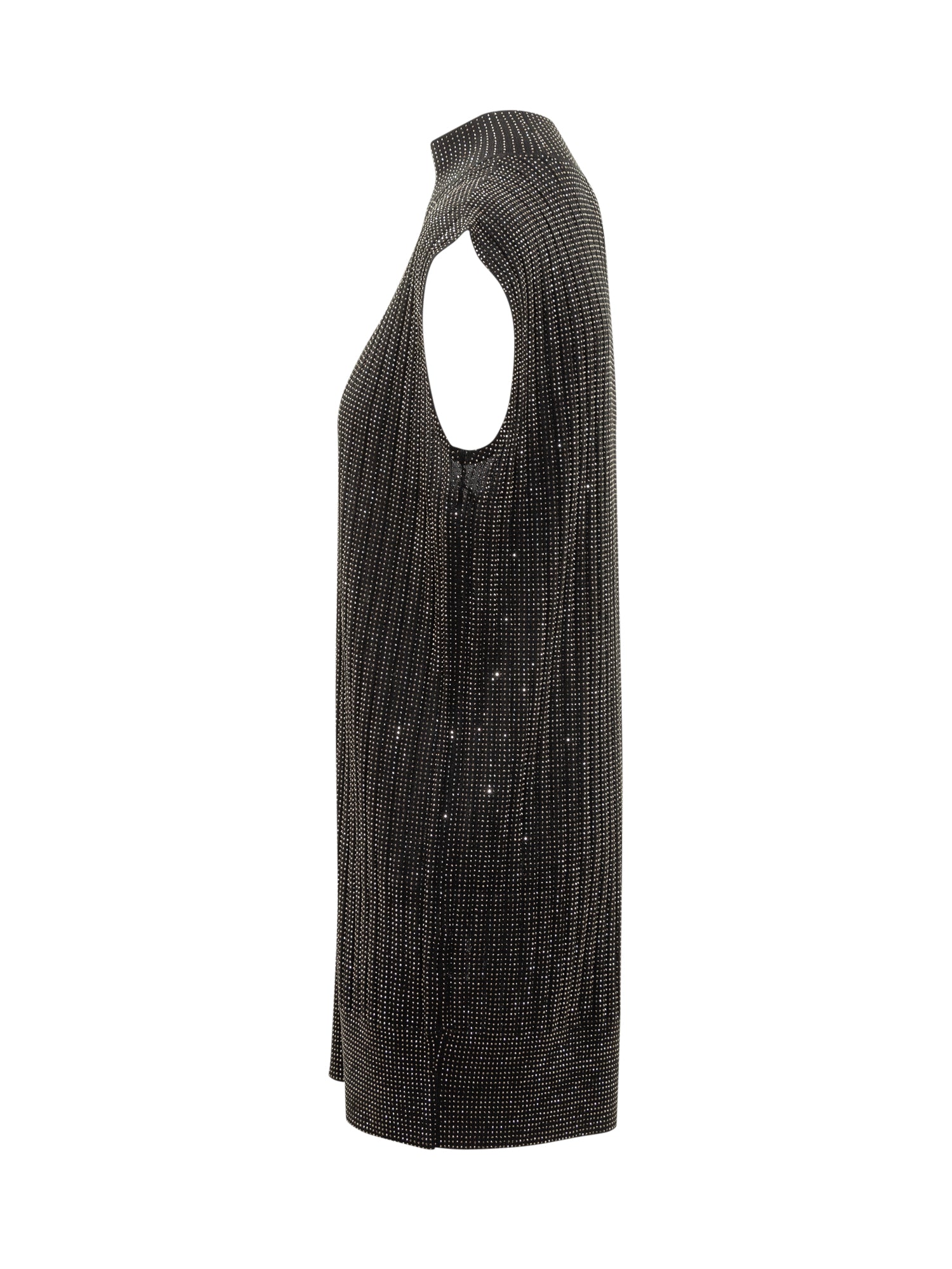 Emporio Armani black sleeveless dress with high neck and sparkling rhinestone embellishment.