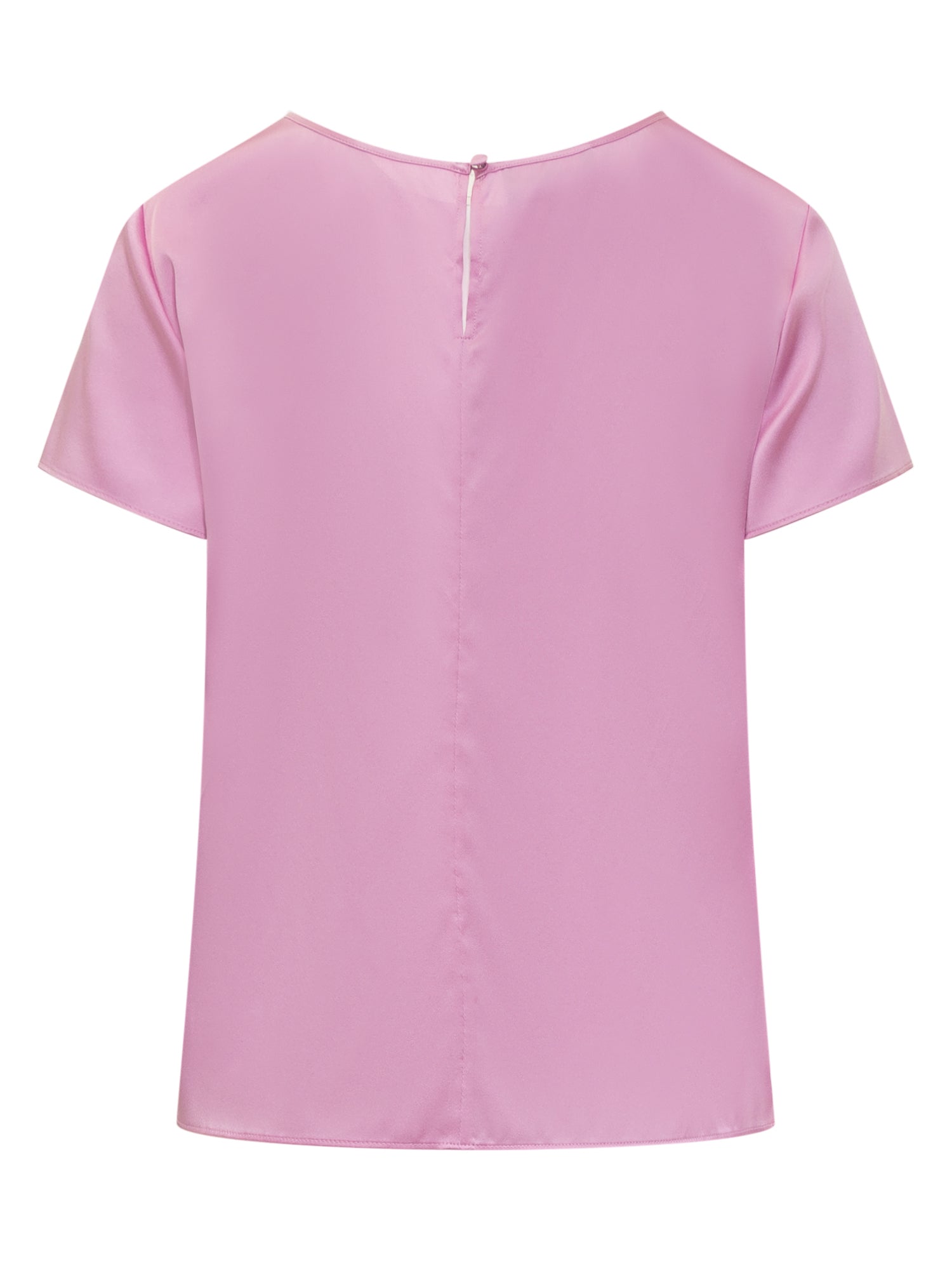Short-sleeved top. Crew neck. Button closure at back of neck.