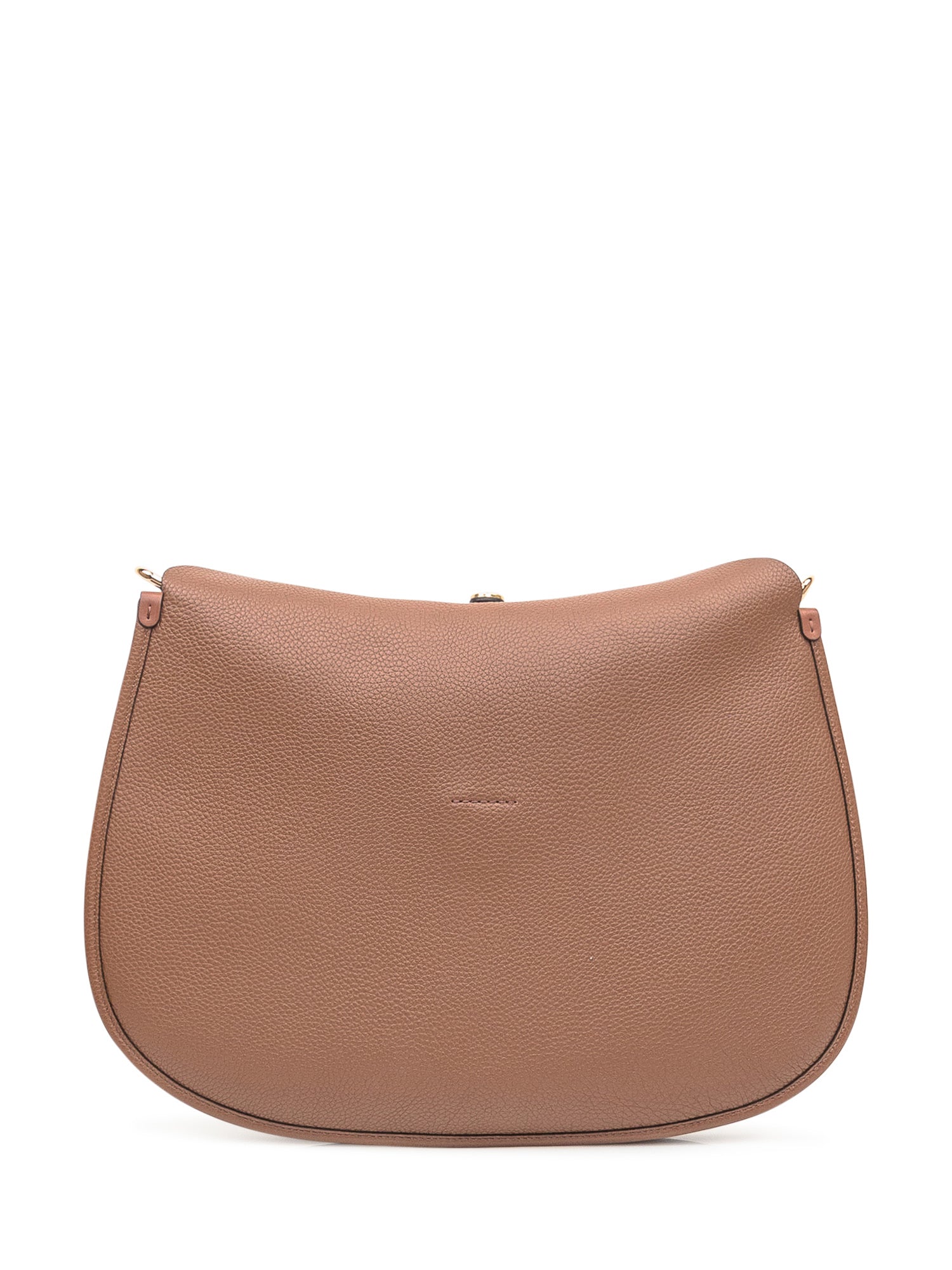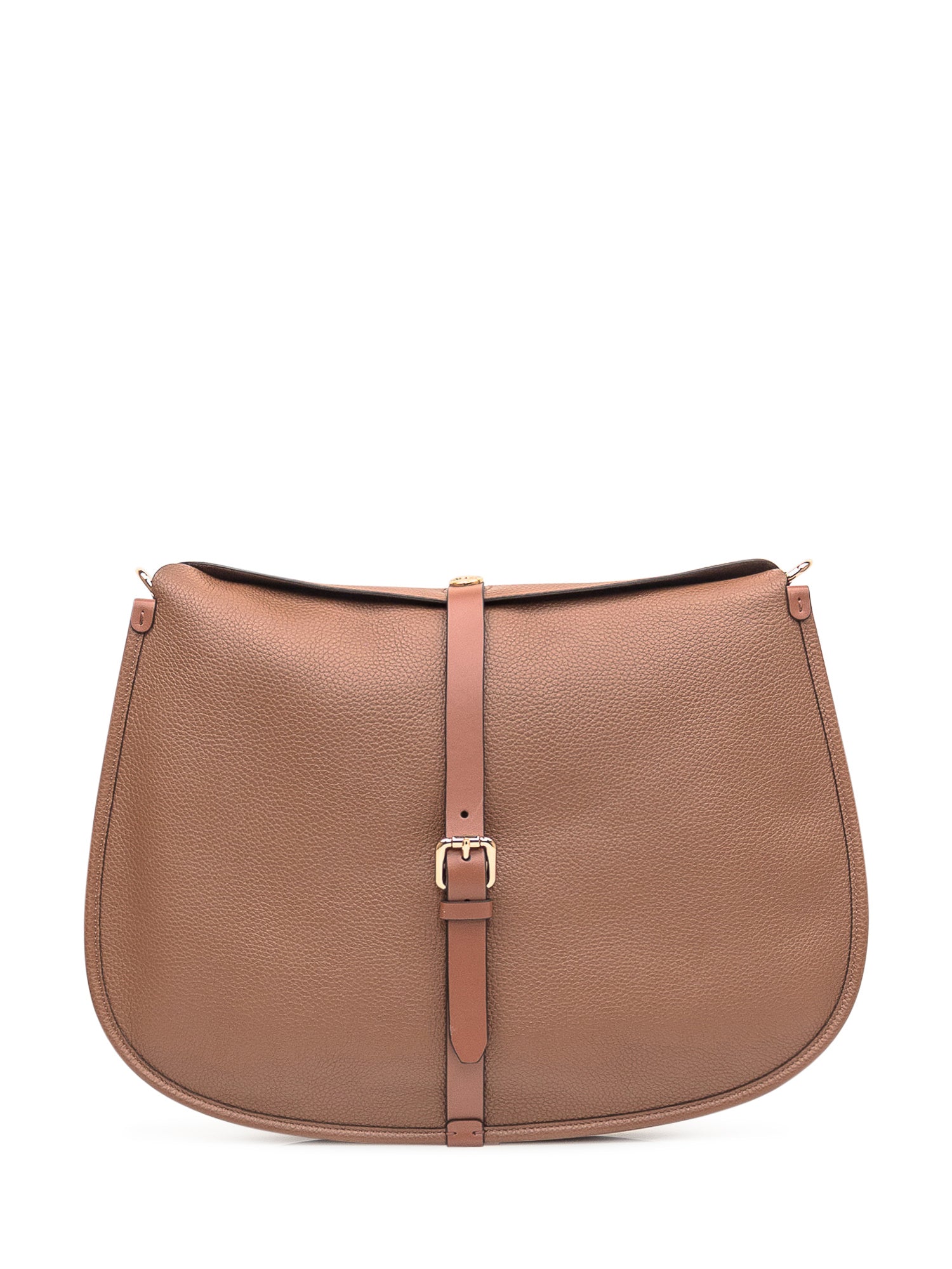 Etro shoulder bag in tan pebbled leather, featuring a saddle-shaped silhouette and an adjustable strap closure with a gold-tone buckle.