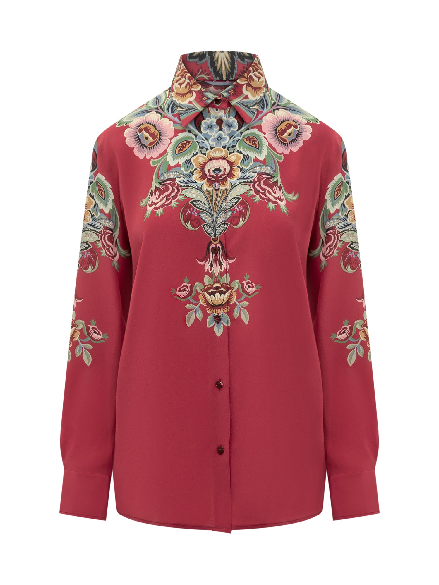 Etro silk shirt with baroque floral pattern on a deep red background. Classic collar and front button closure.