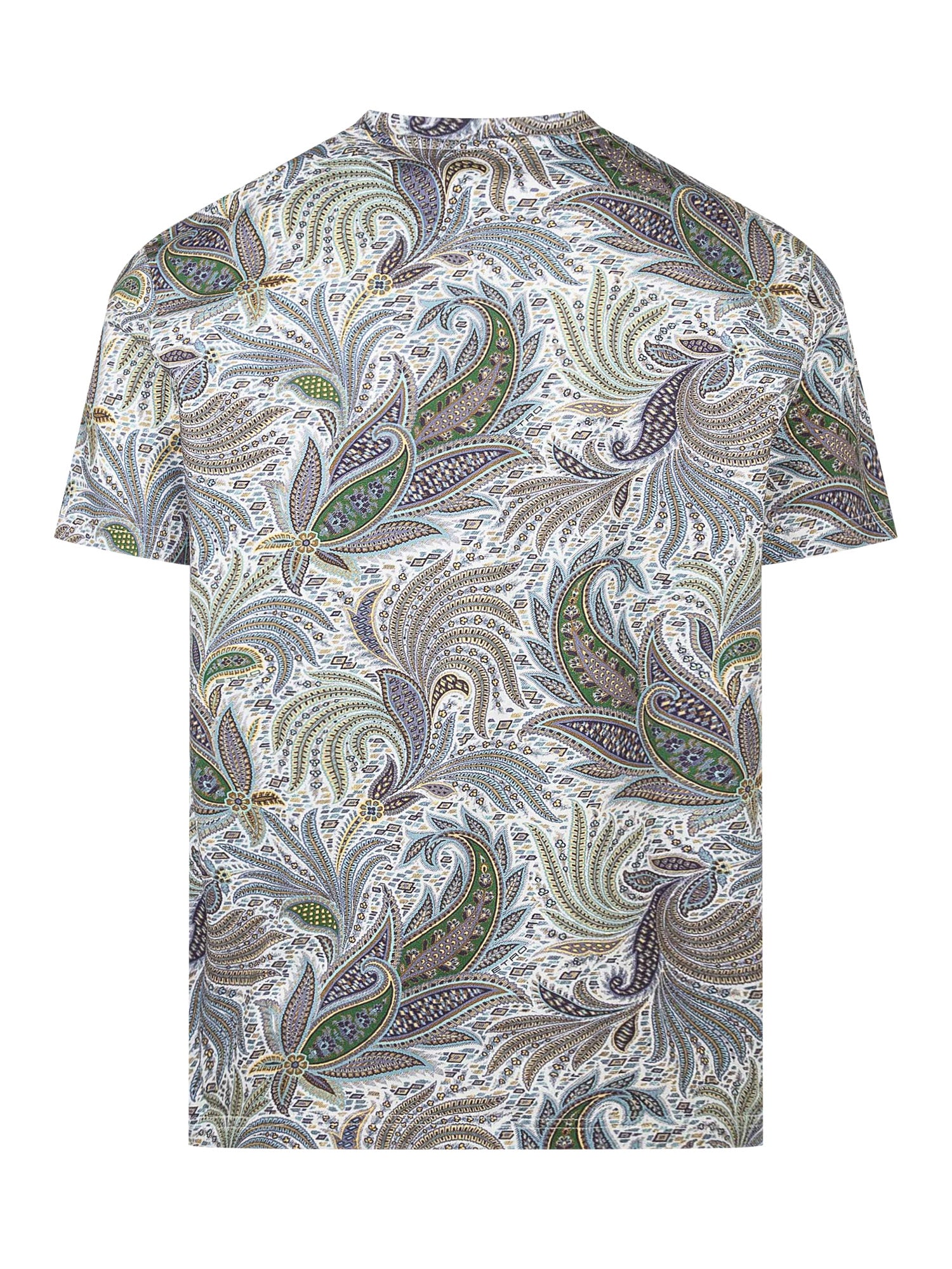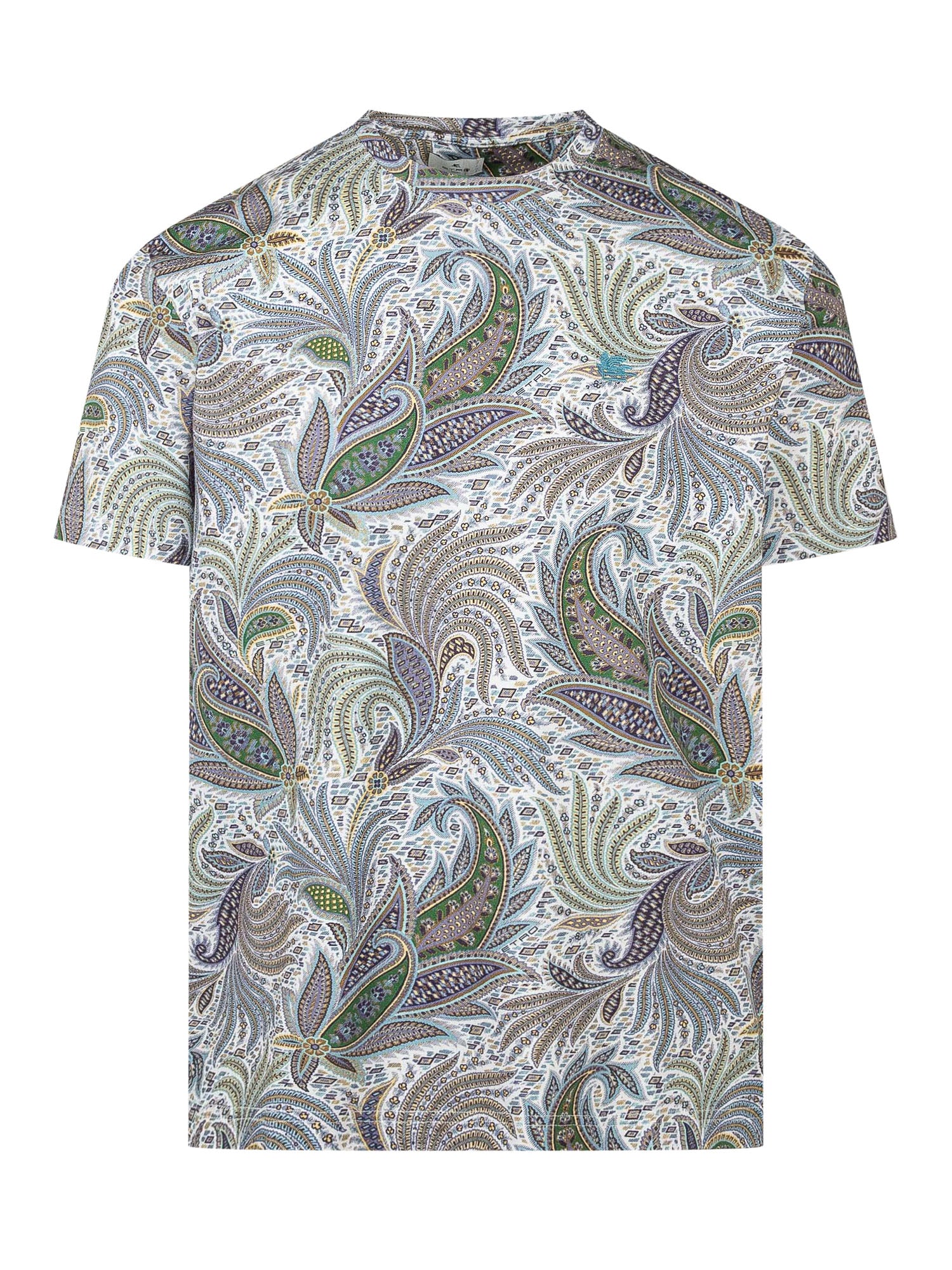 Short-sleeved cotton T-shirt. Round neck. Ribbed hem. Logo on the front. Floral pattern all over.