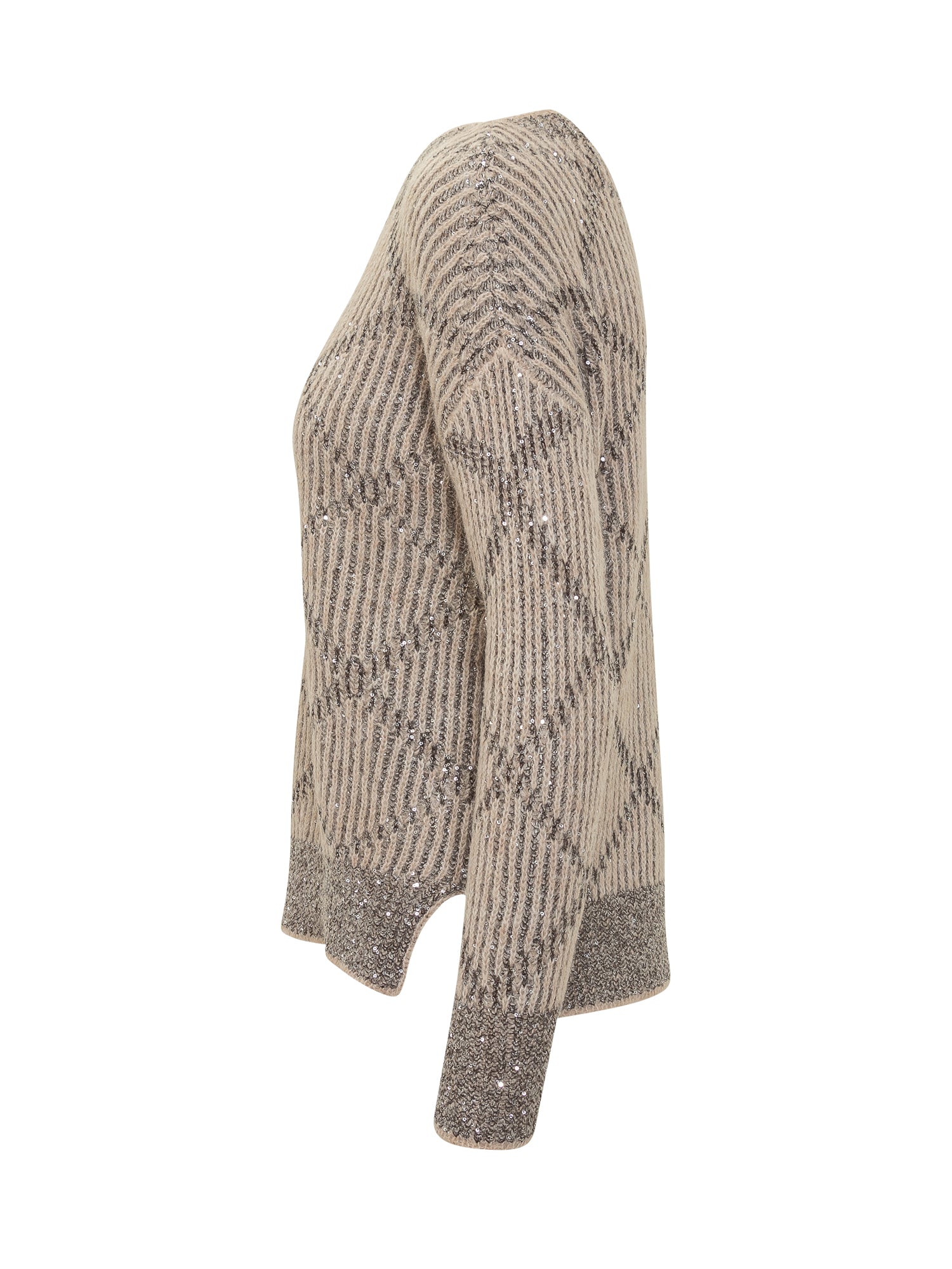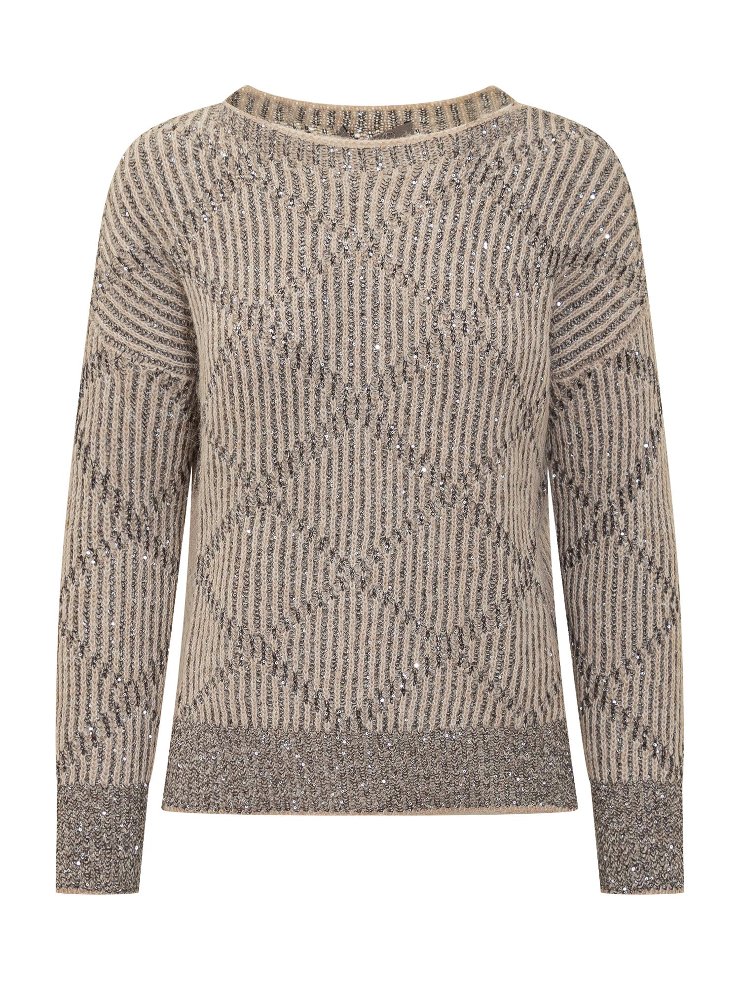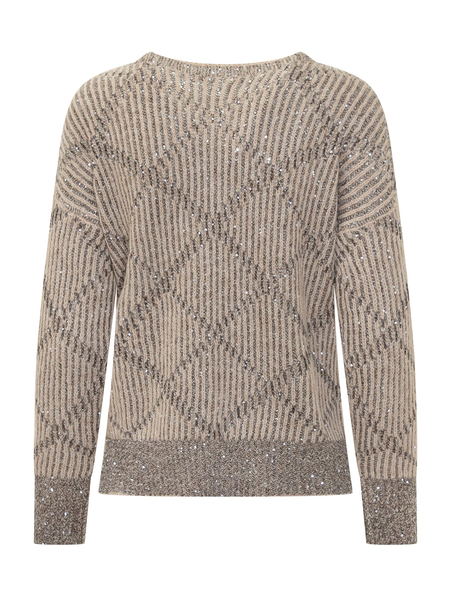 Beige Exterior long-sleeve sweater featuring a dark geometric pattern with lurex yarn.