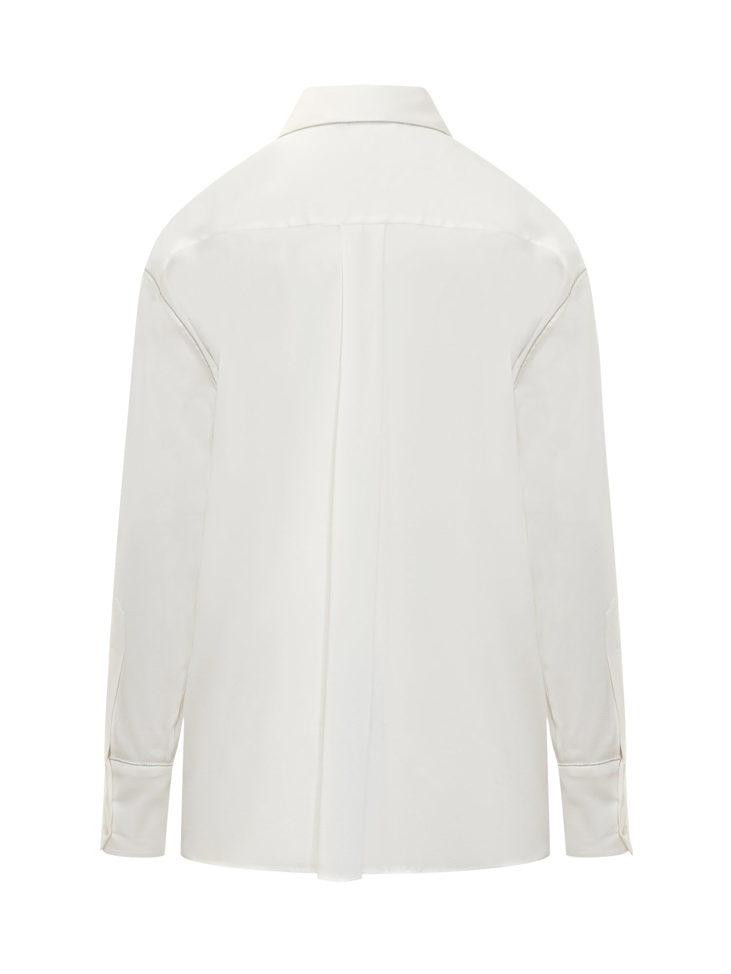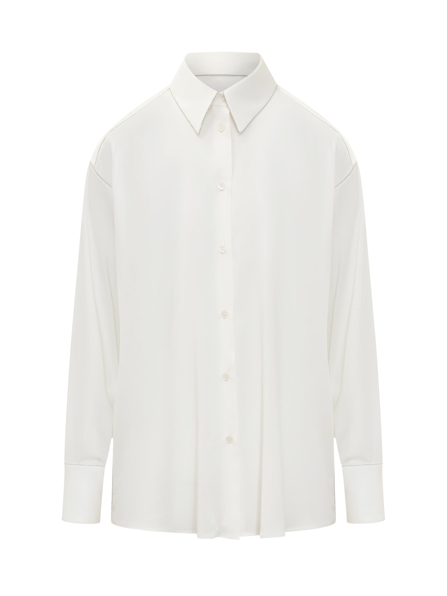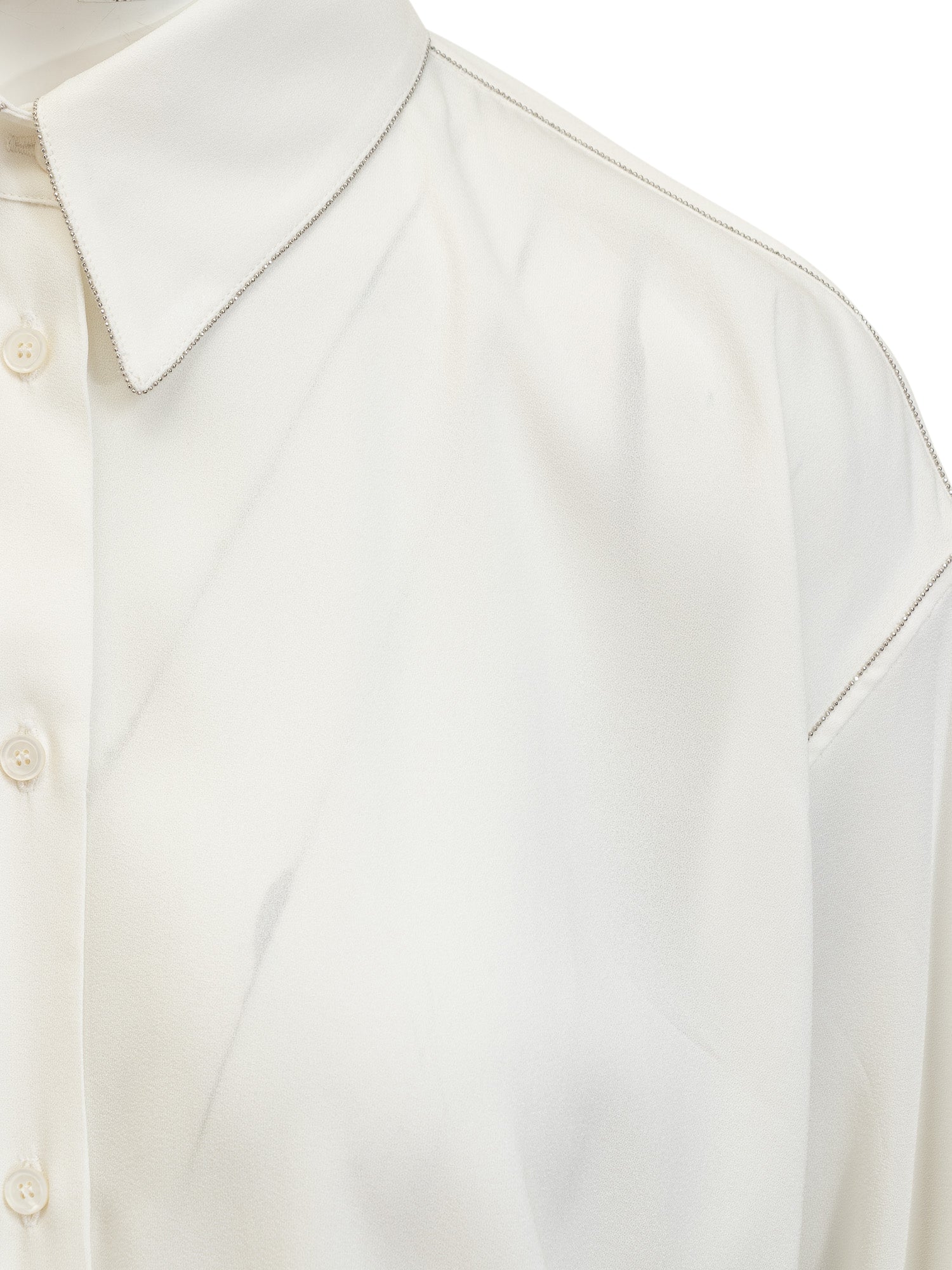 Long-sleeved shirt. Classic collar. Button closure. Button cuffs. Rhinestone detail on all-over hems.