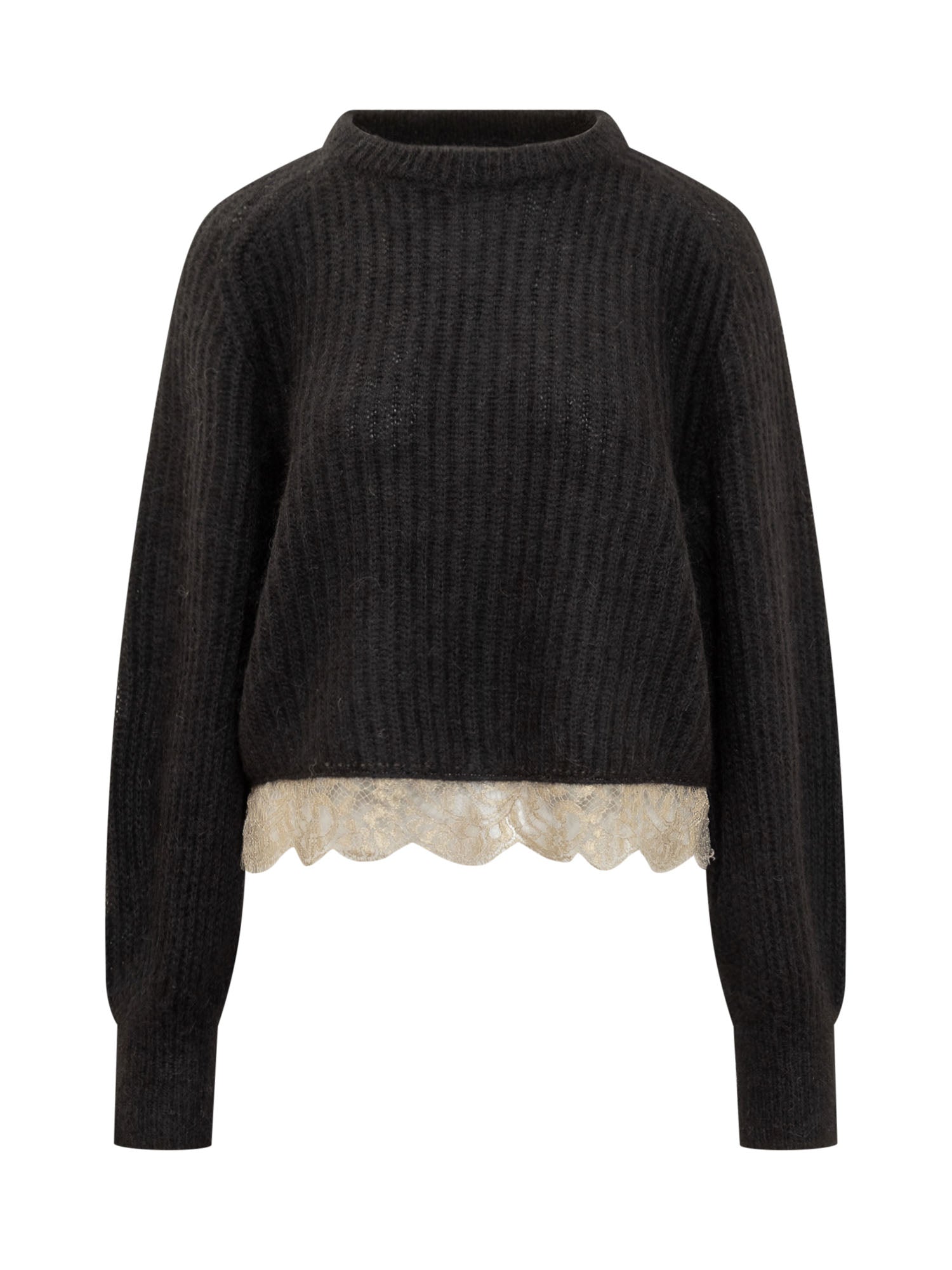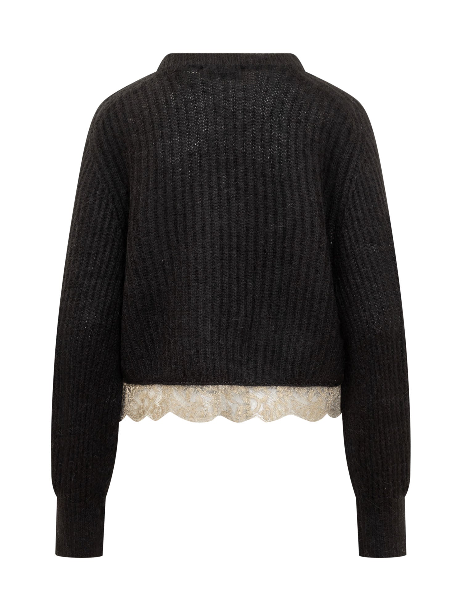 Black sweater with long sleeves. Crew neck. Knitting. Lace detail on the bottom. All-over ribs.