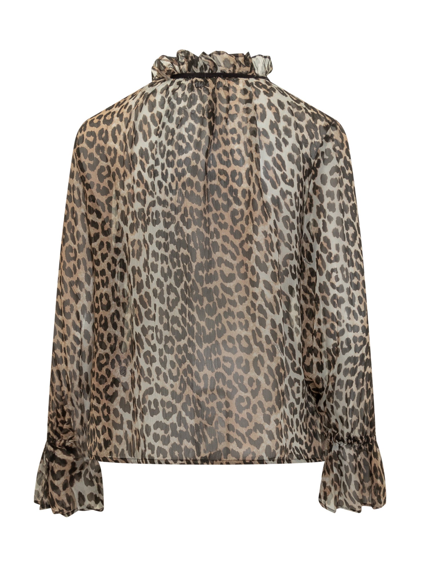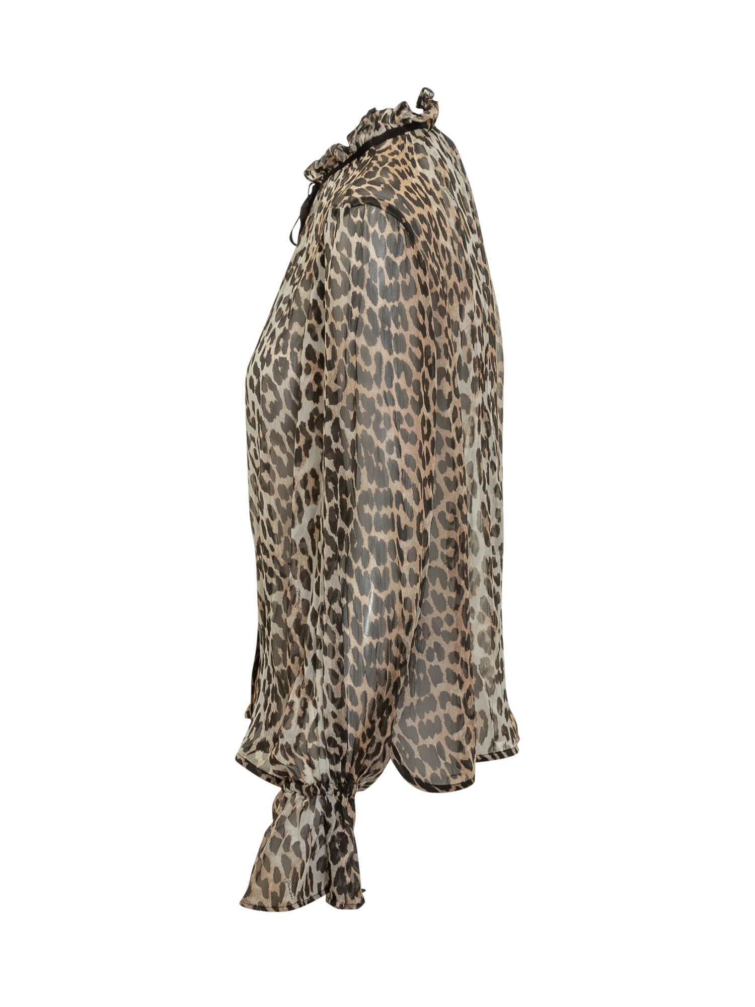 Ganni lightweight chiffon shirt featuring an all-over animal print. Feminine design with a ruffled collar, black velvet bow tie, and long sleeves with wide cuffs.