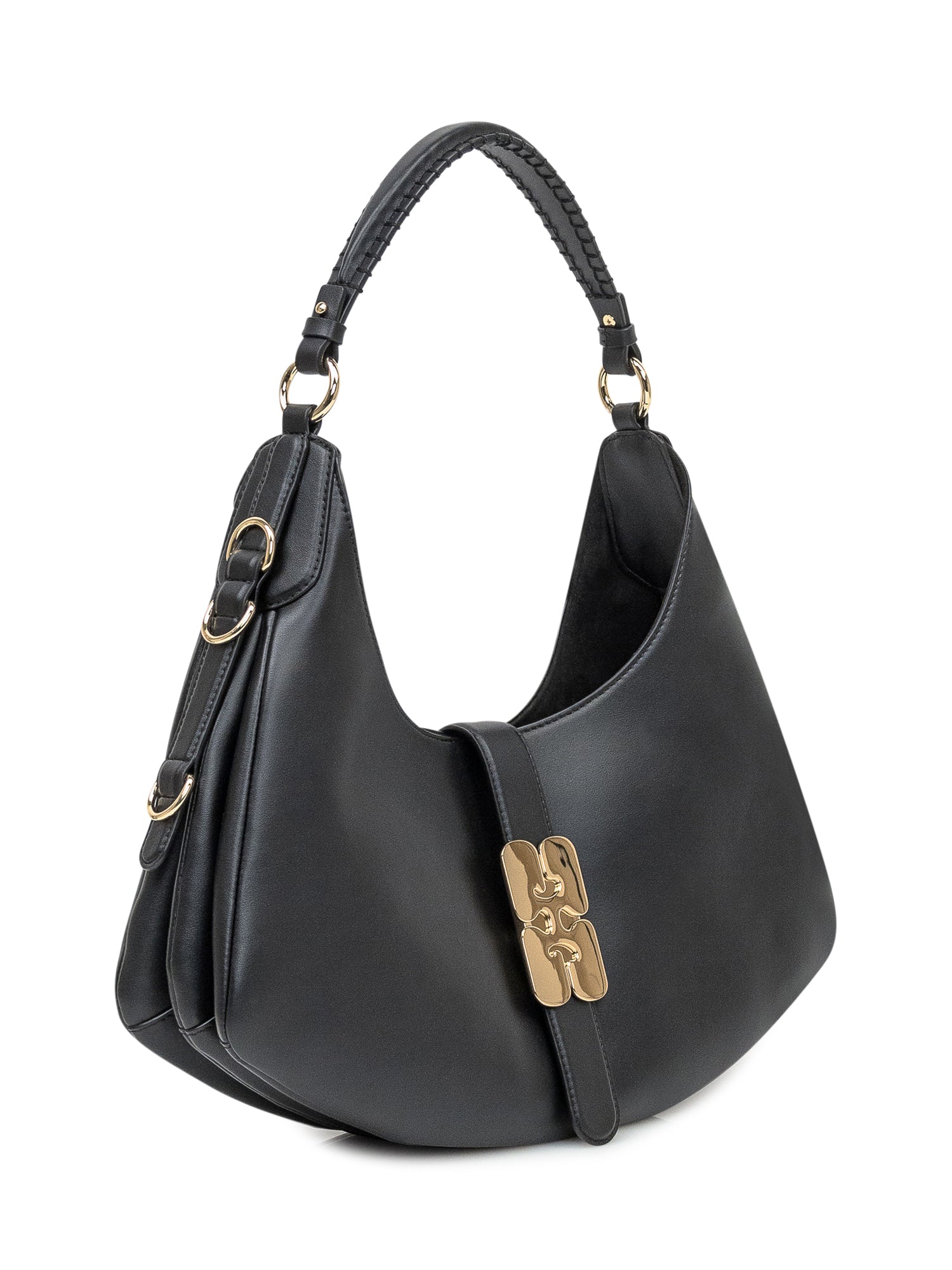 Ganni shoulder bag in smooth black leather with metallic logo clasp and gold-tone details.