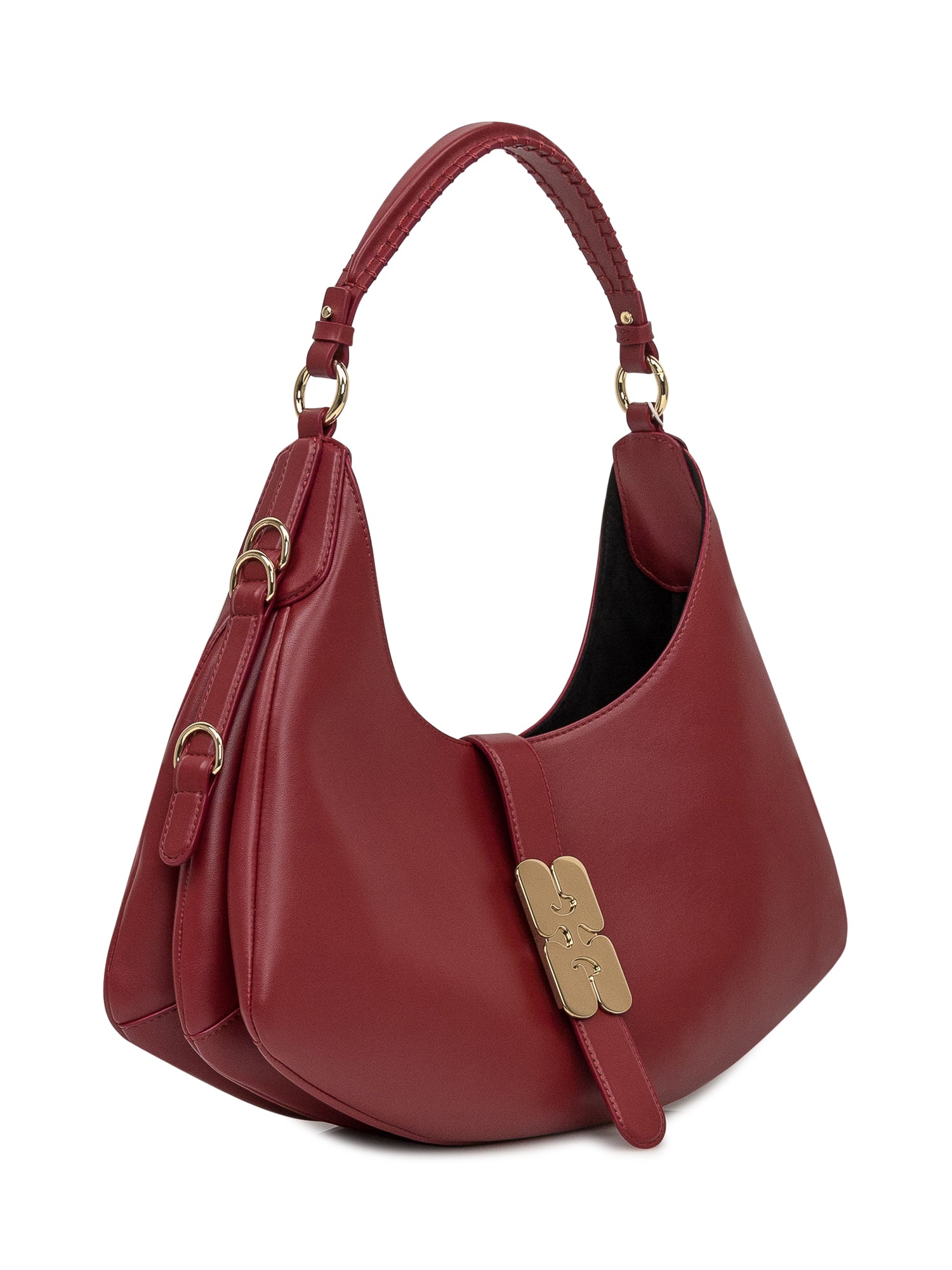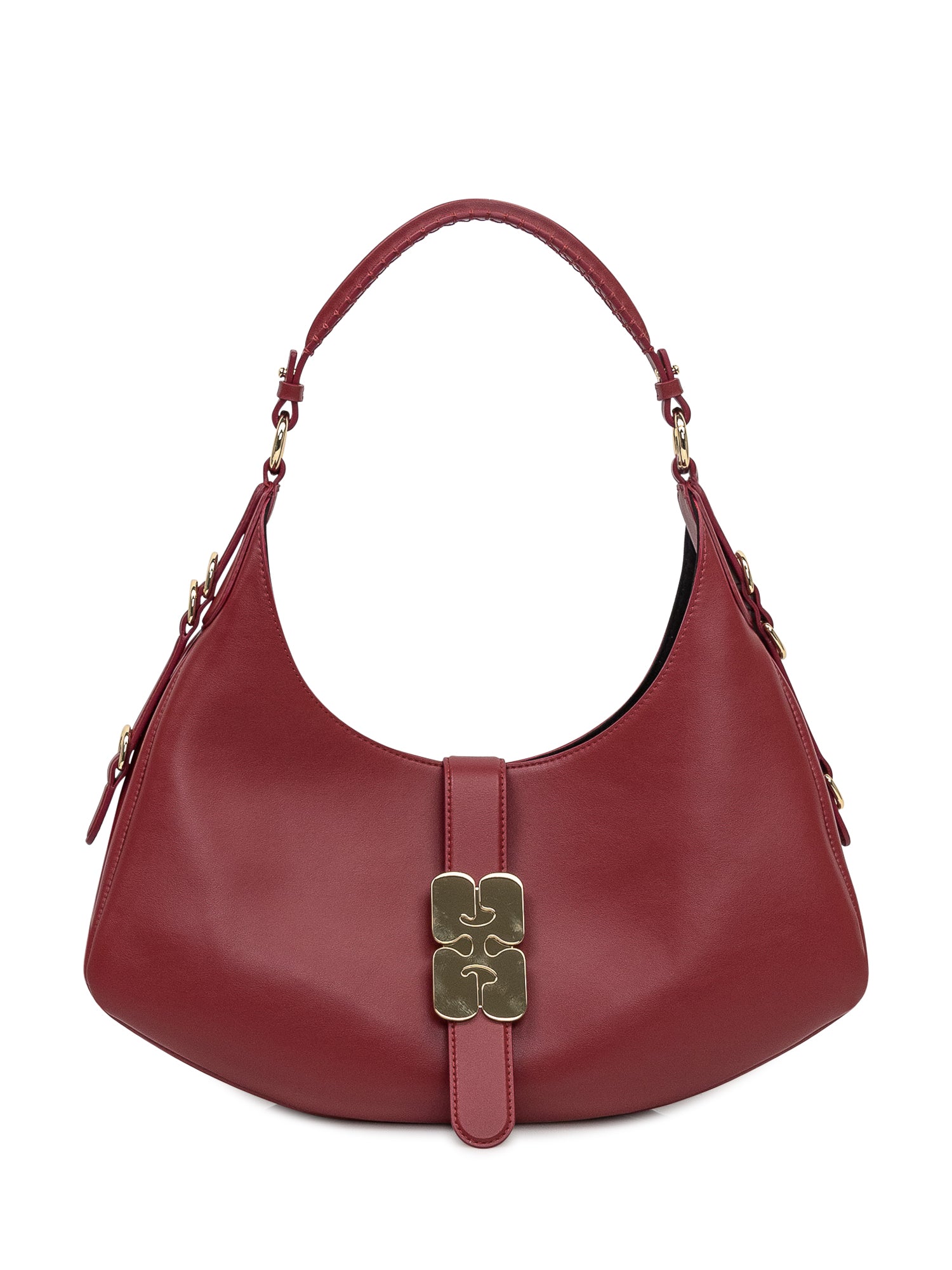 Ganni shoulder bag in smooth red leather with gold logo clasp and metallic details.