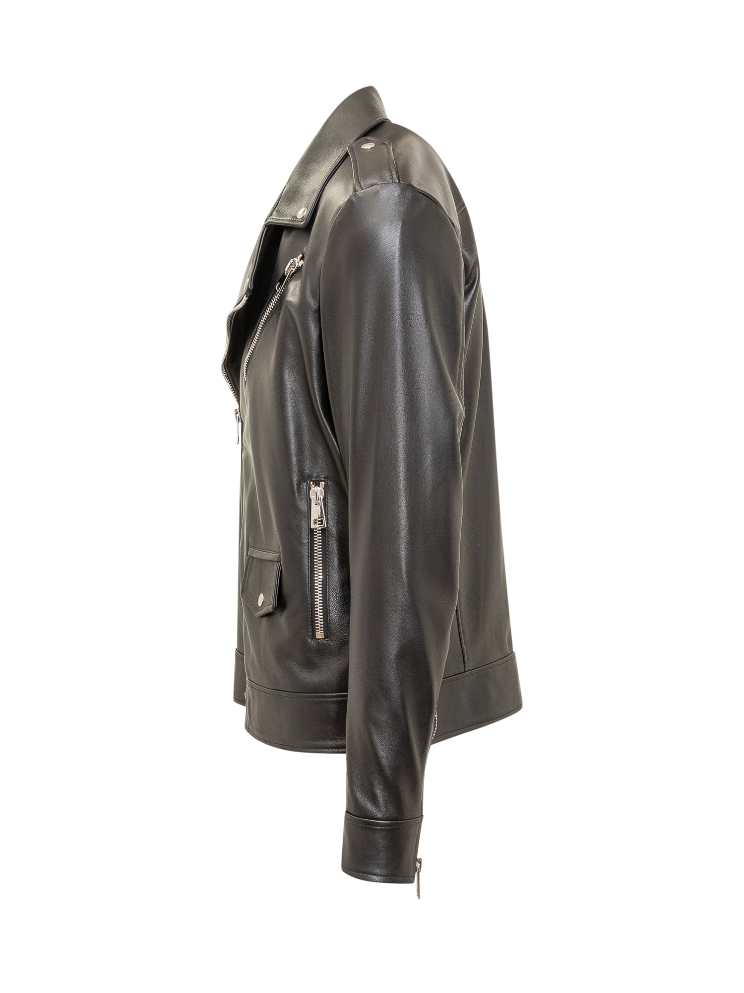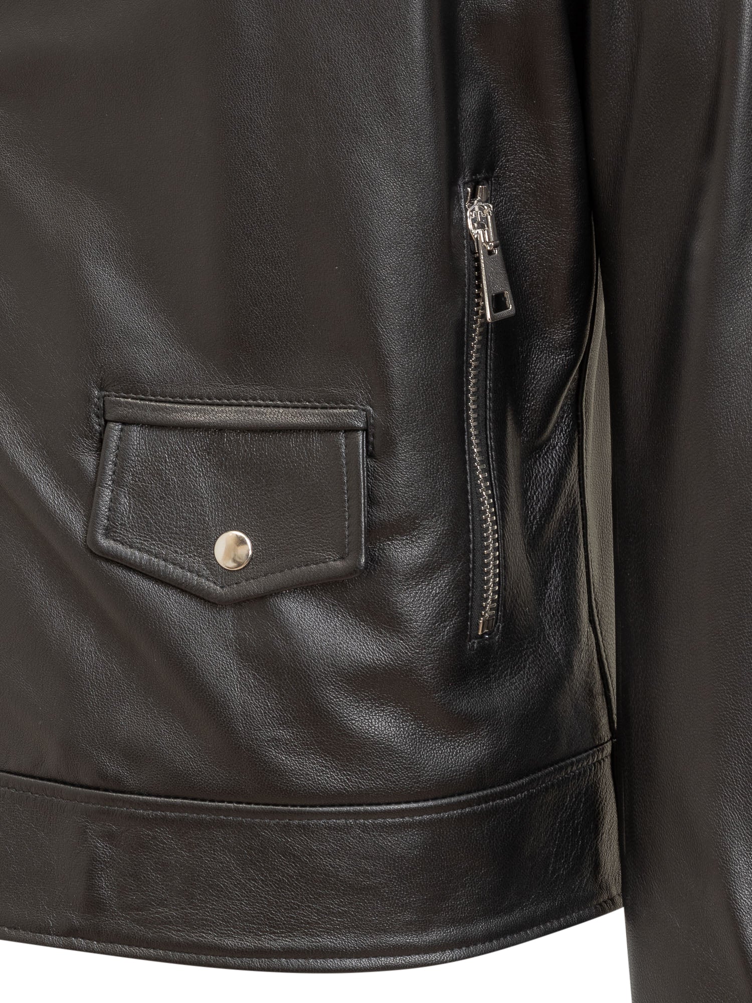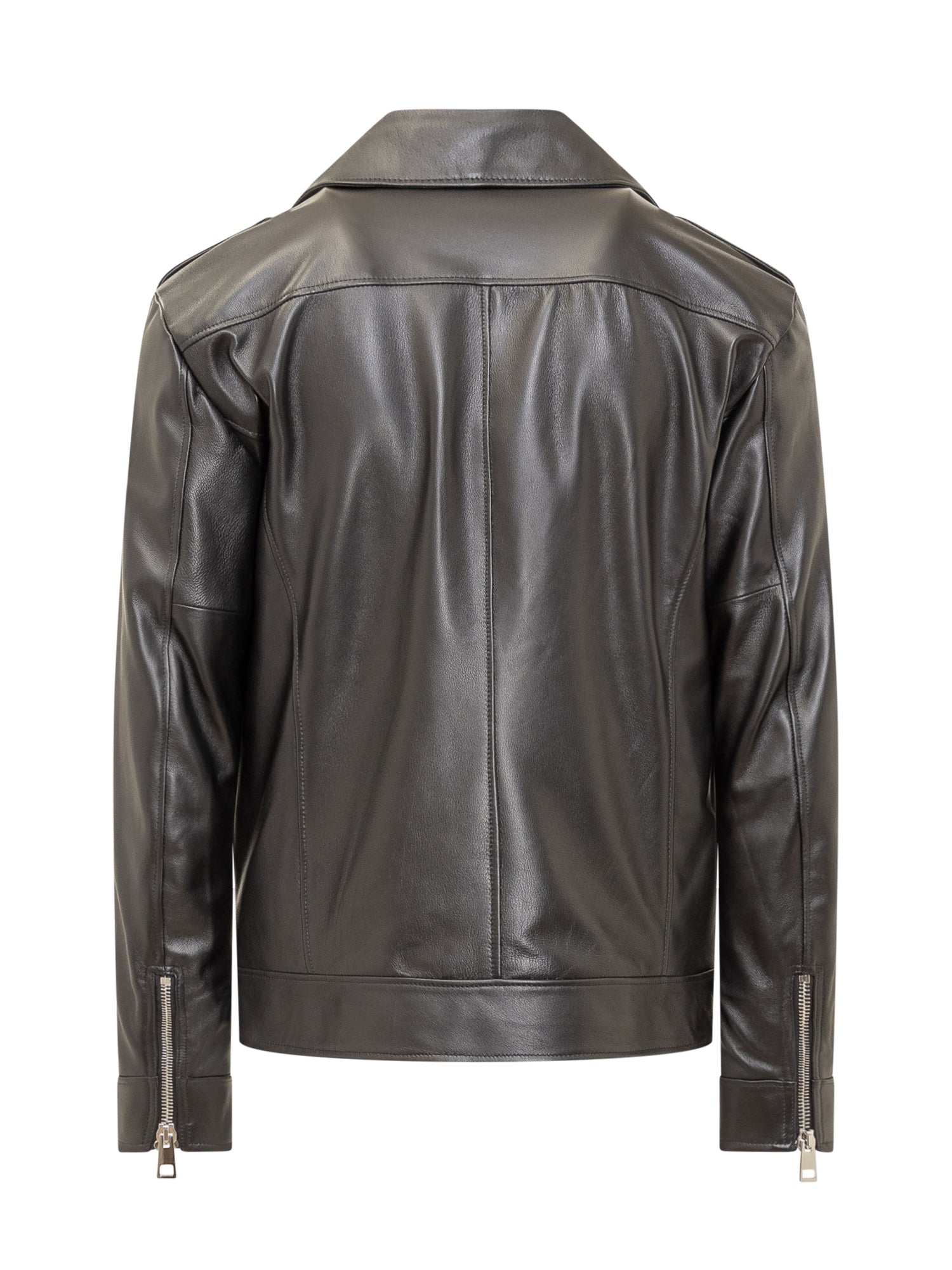 Leather jacket with long sleeves. Classic collar with V-neck. Zip closure. Zip cuffs. Four pockets.