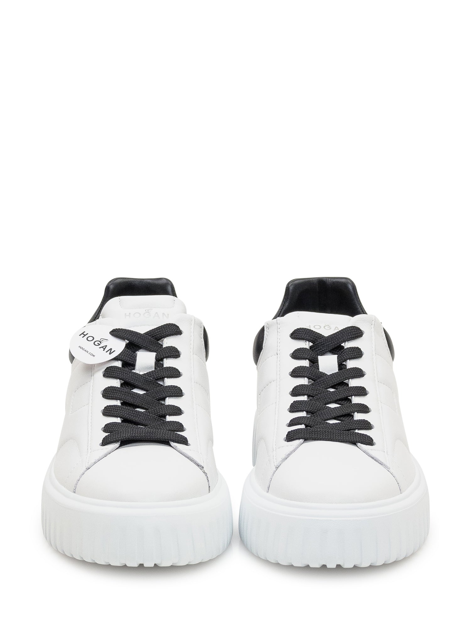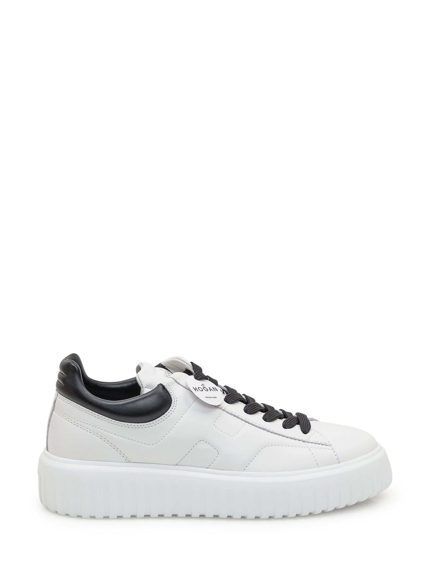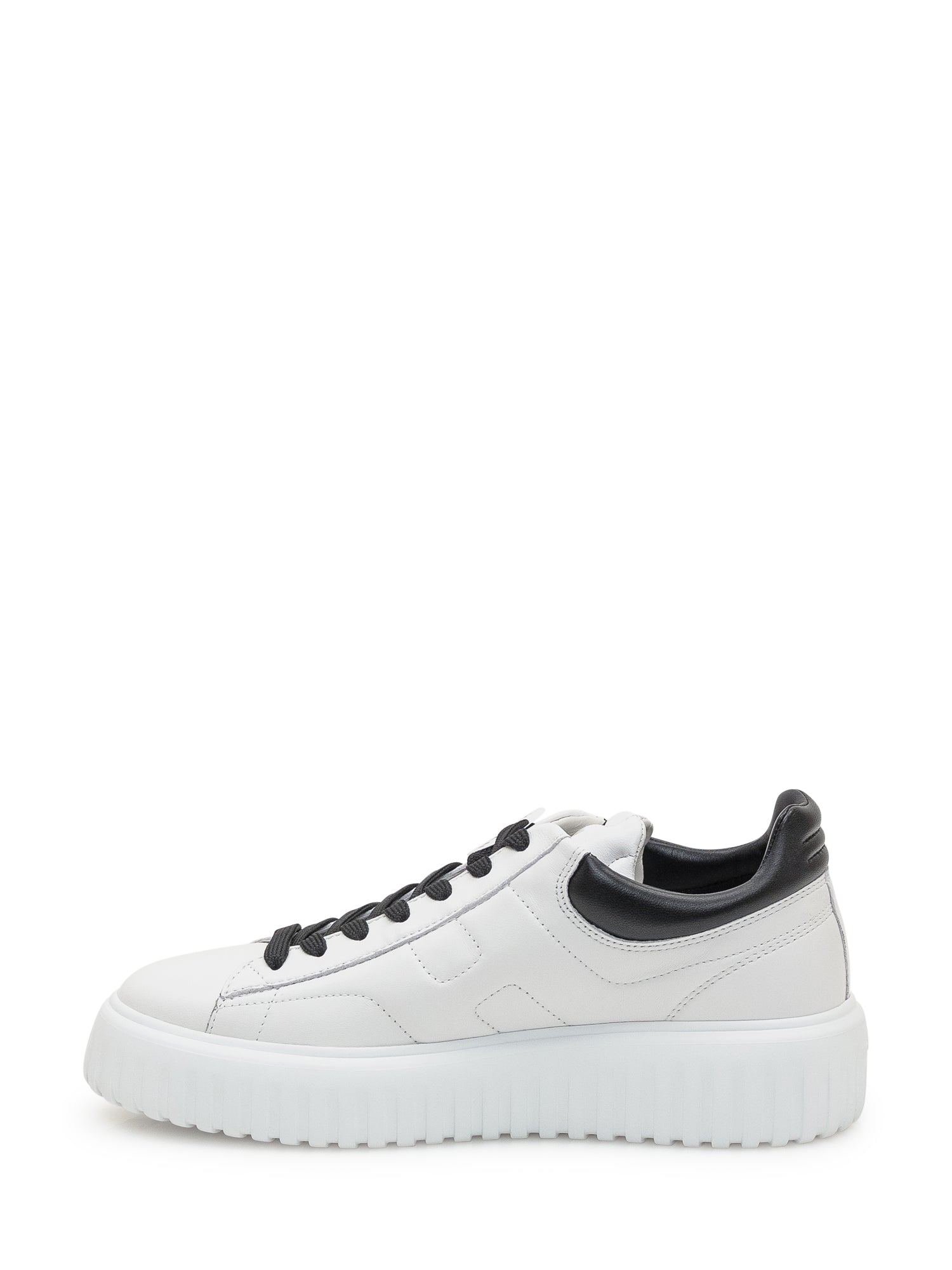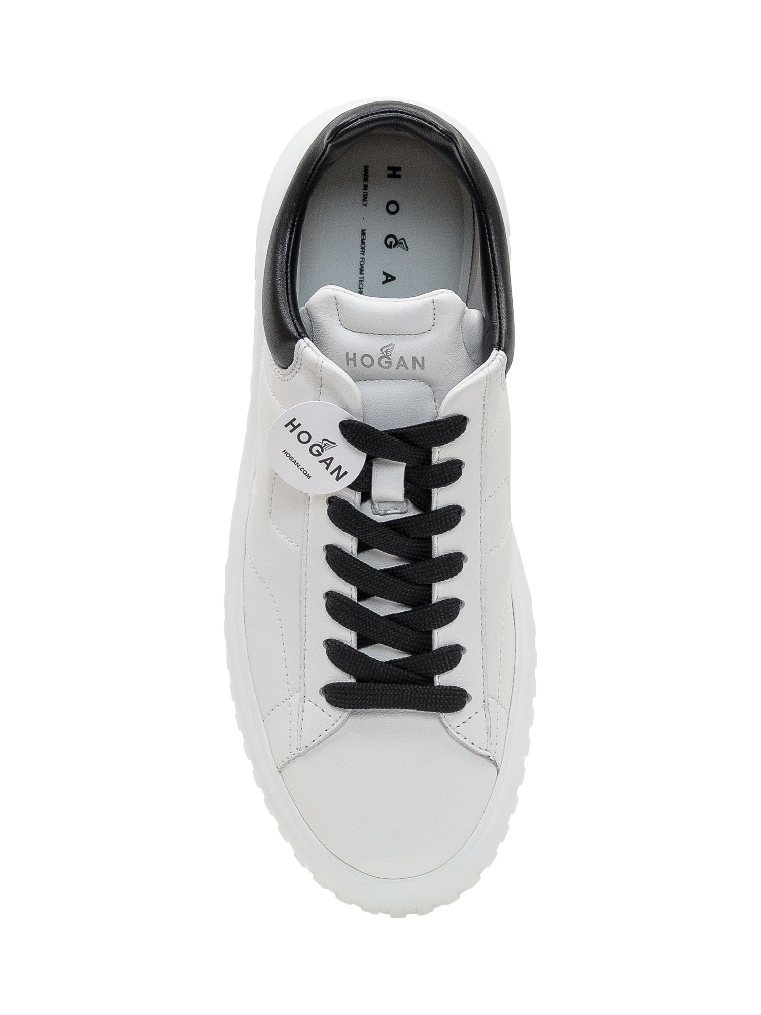 White shoe with black details made of calfskin. Embroidered logo. Tongue with logo print. Front lacing. Round toe. Brand insole. Platform sole. White replacement laces.