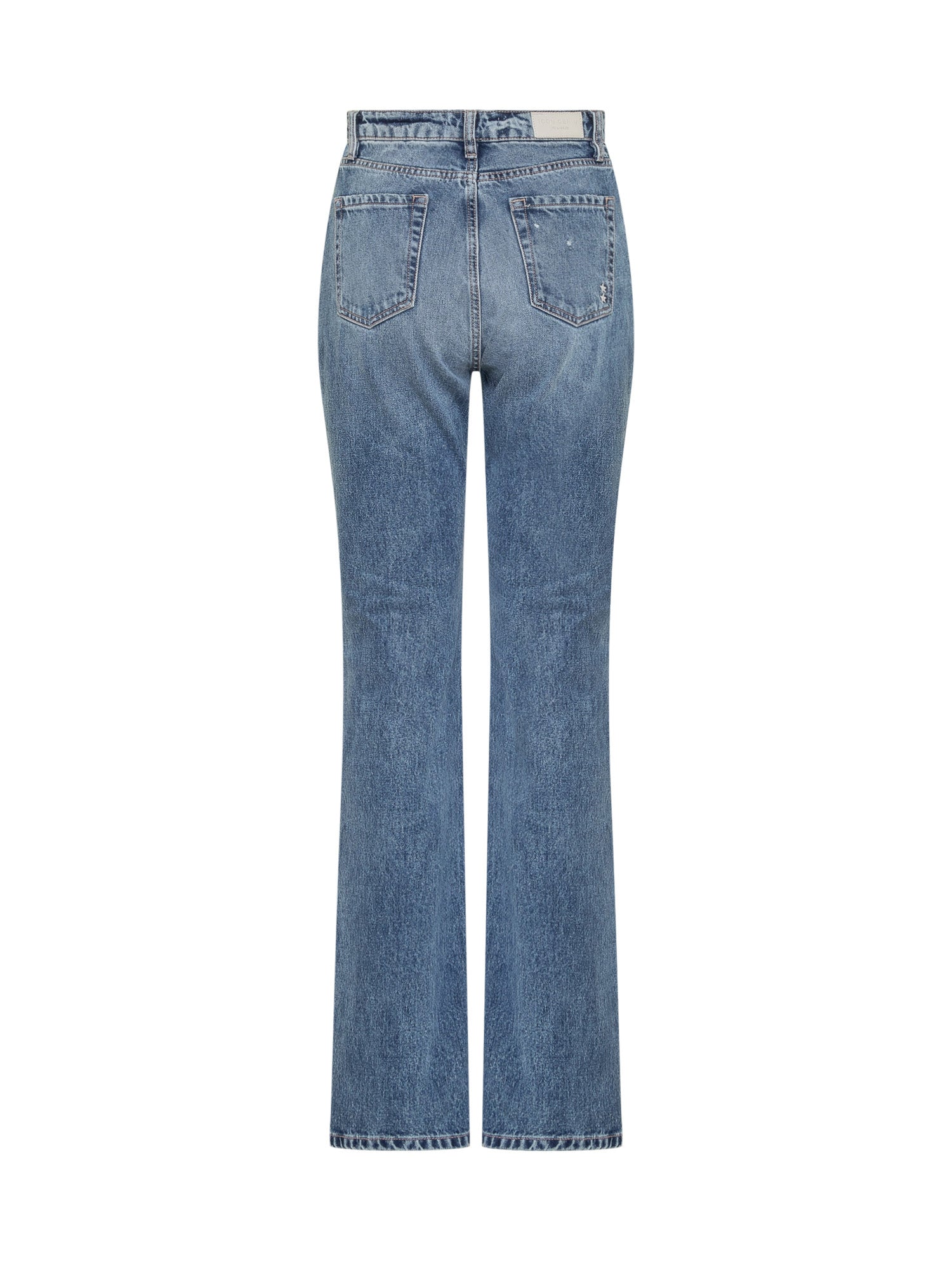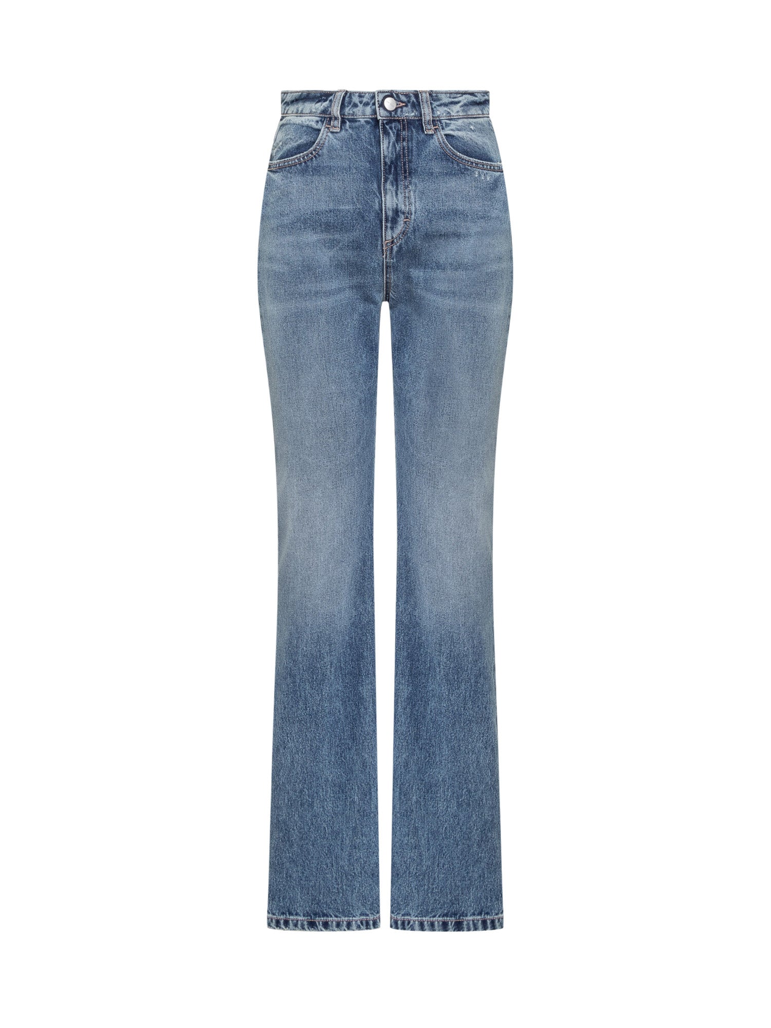 Long straight jeans. Zip and button closure. Belt loops. Four pockets.