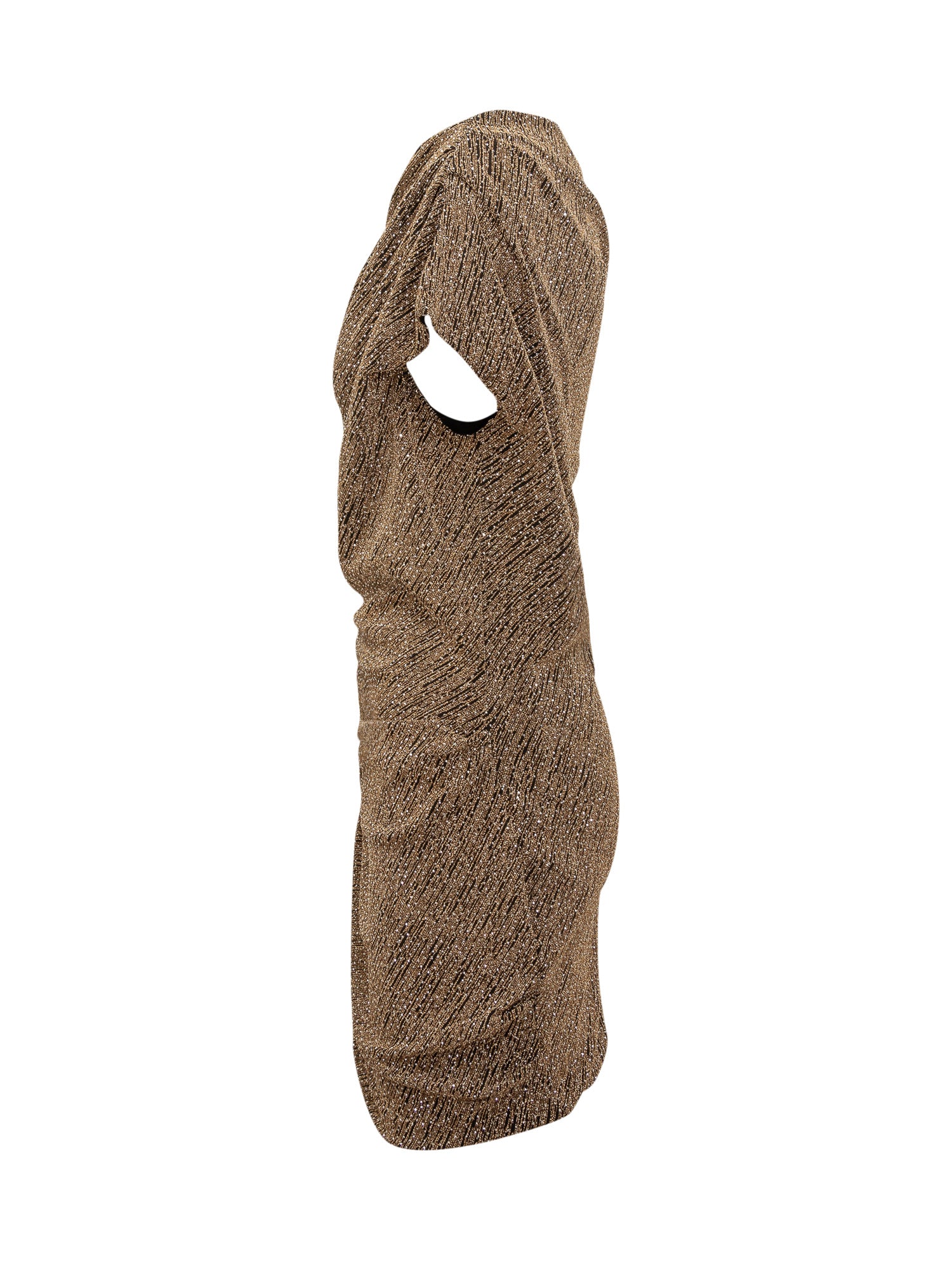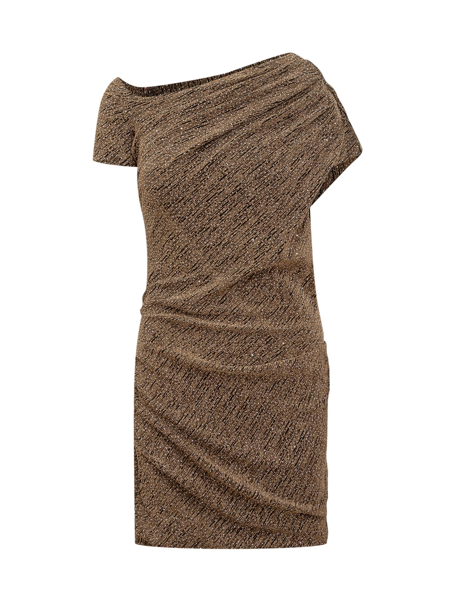 Iro Nalone short dress in bronze lamé fabric with one-shoulder design and side draping.