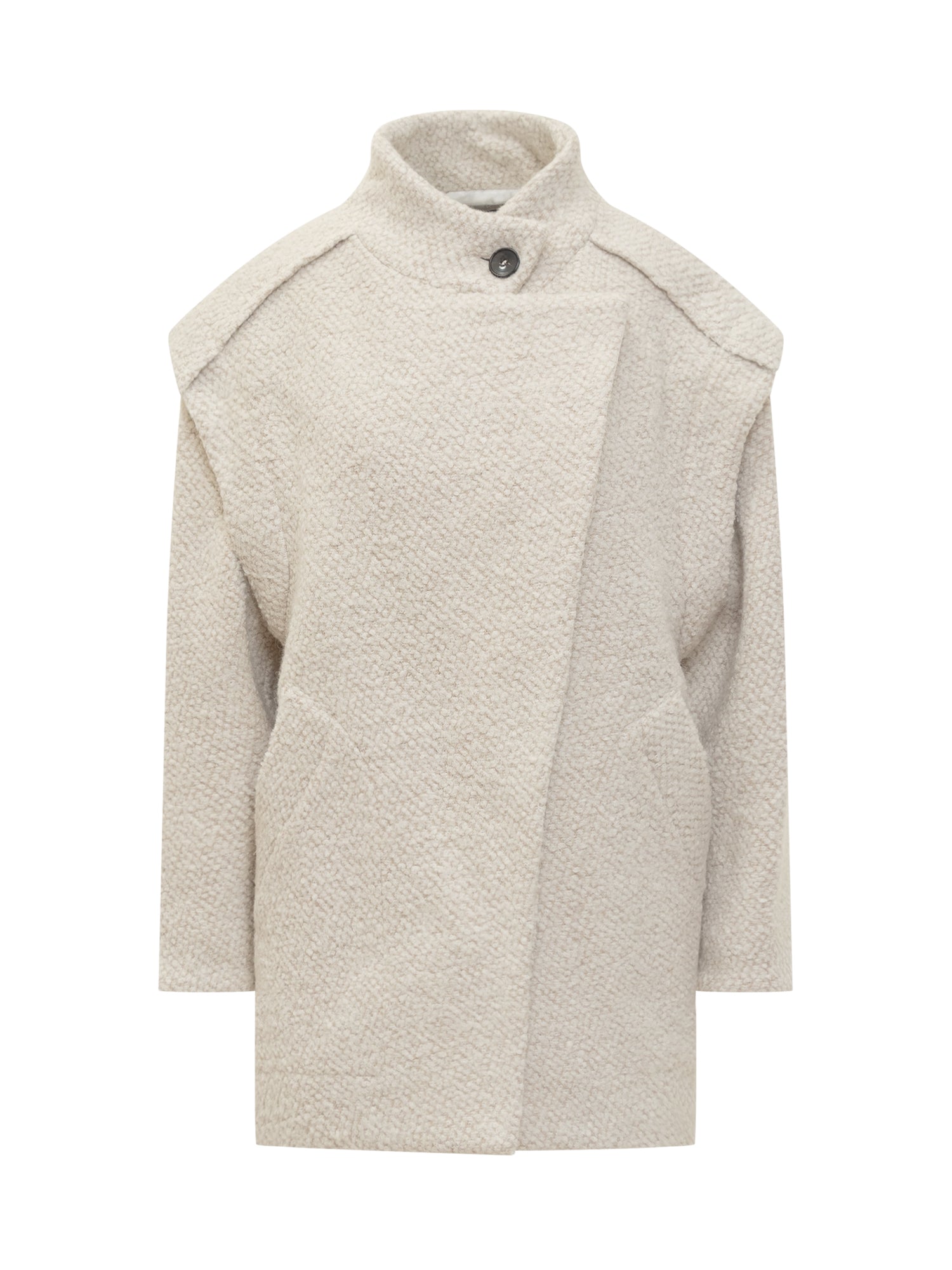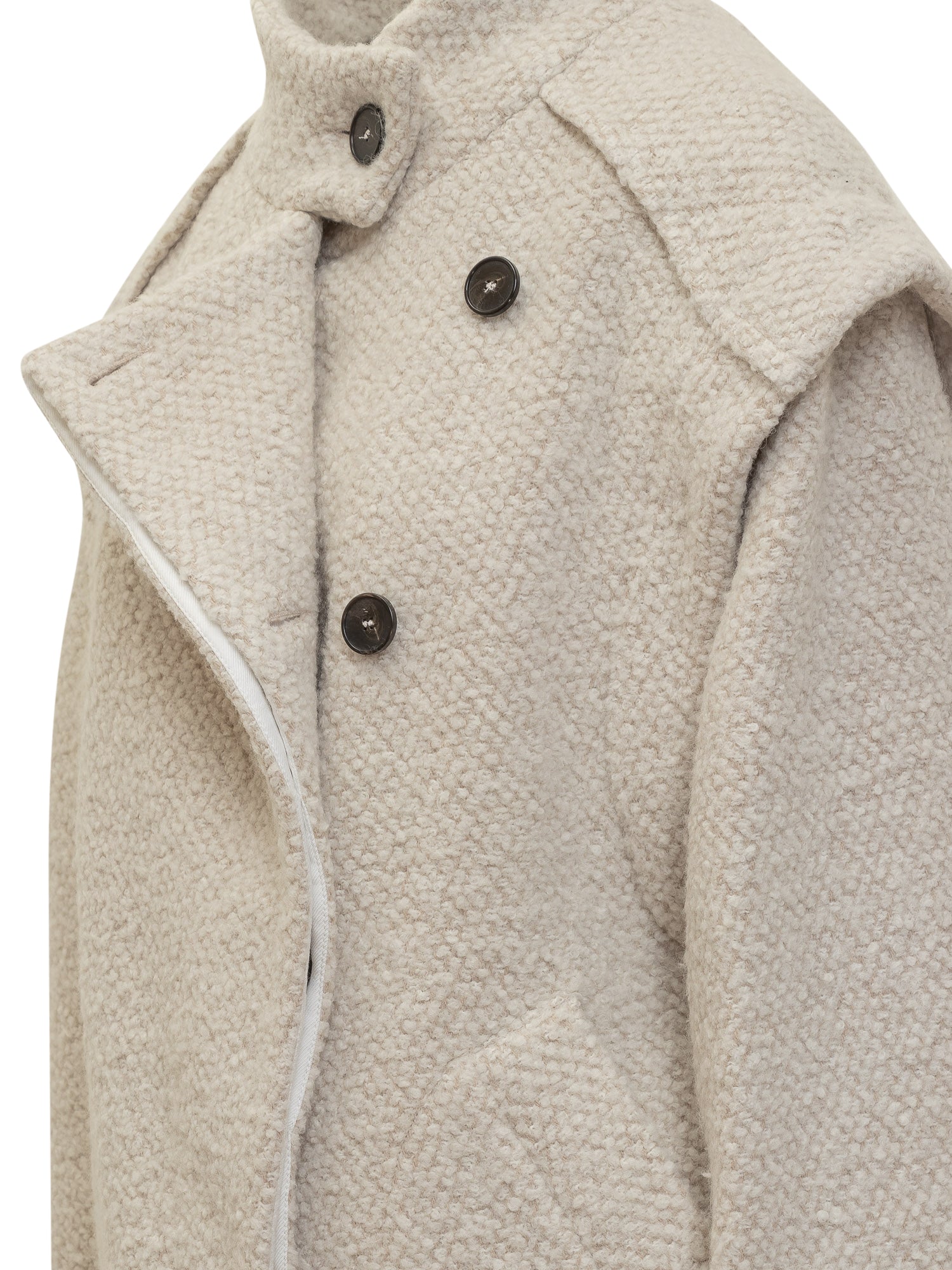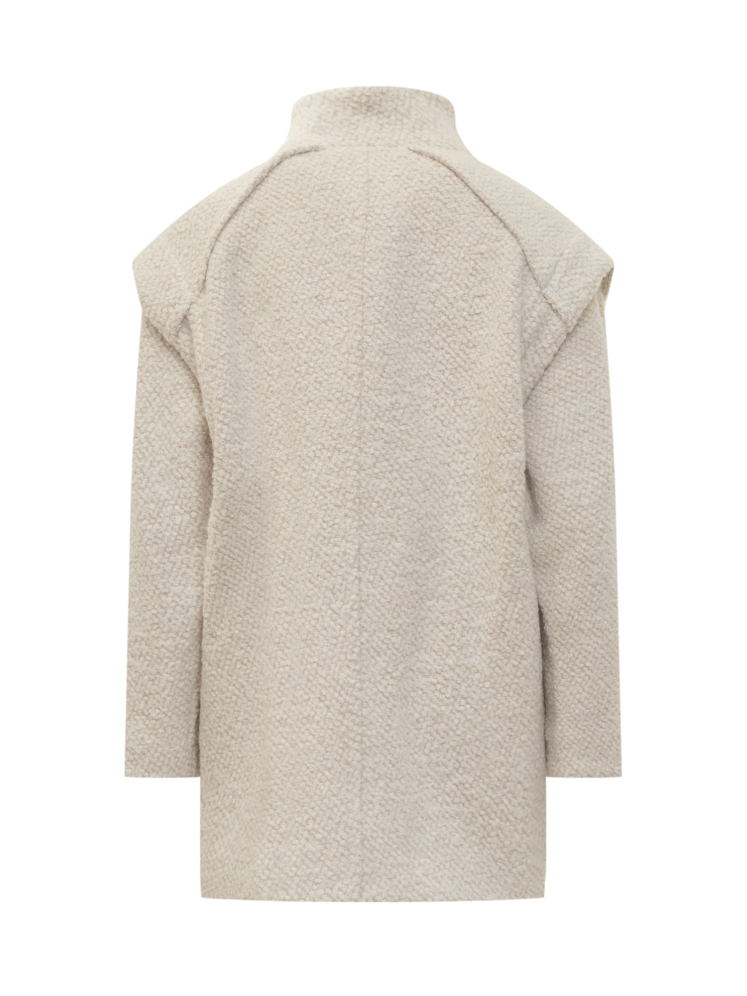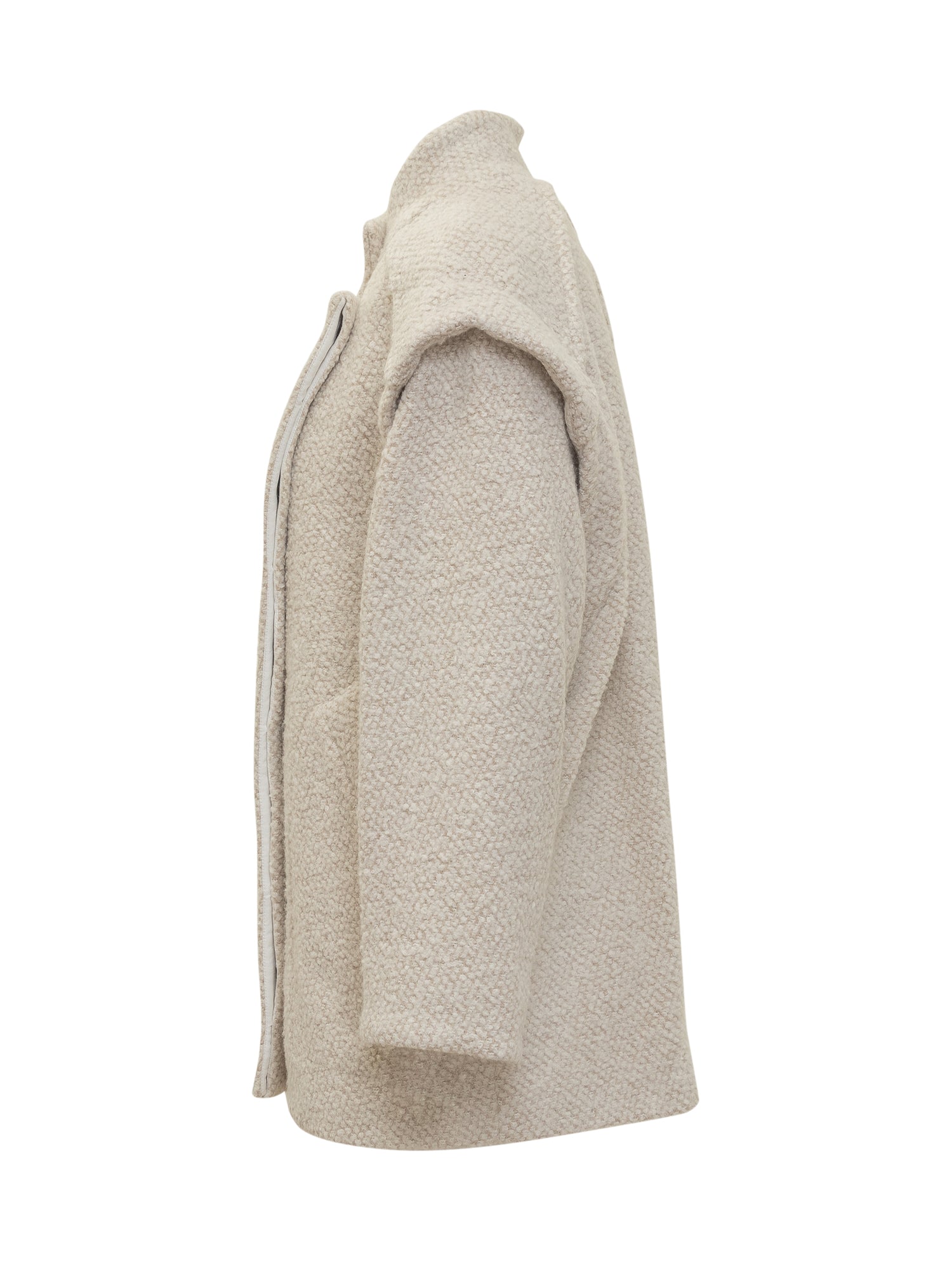 Pavina coat in a contemporary, structured cut. Crafted from cream bouclé fabric, it features a high collar with an asymmetric button closure and accentuated shoulders.