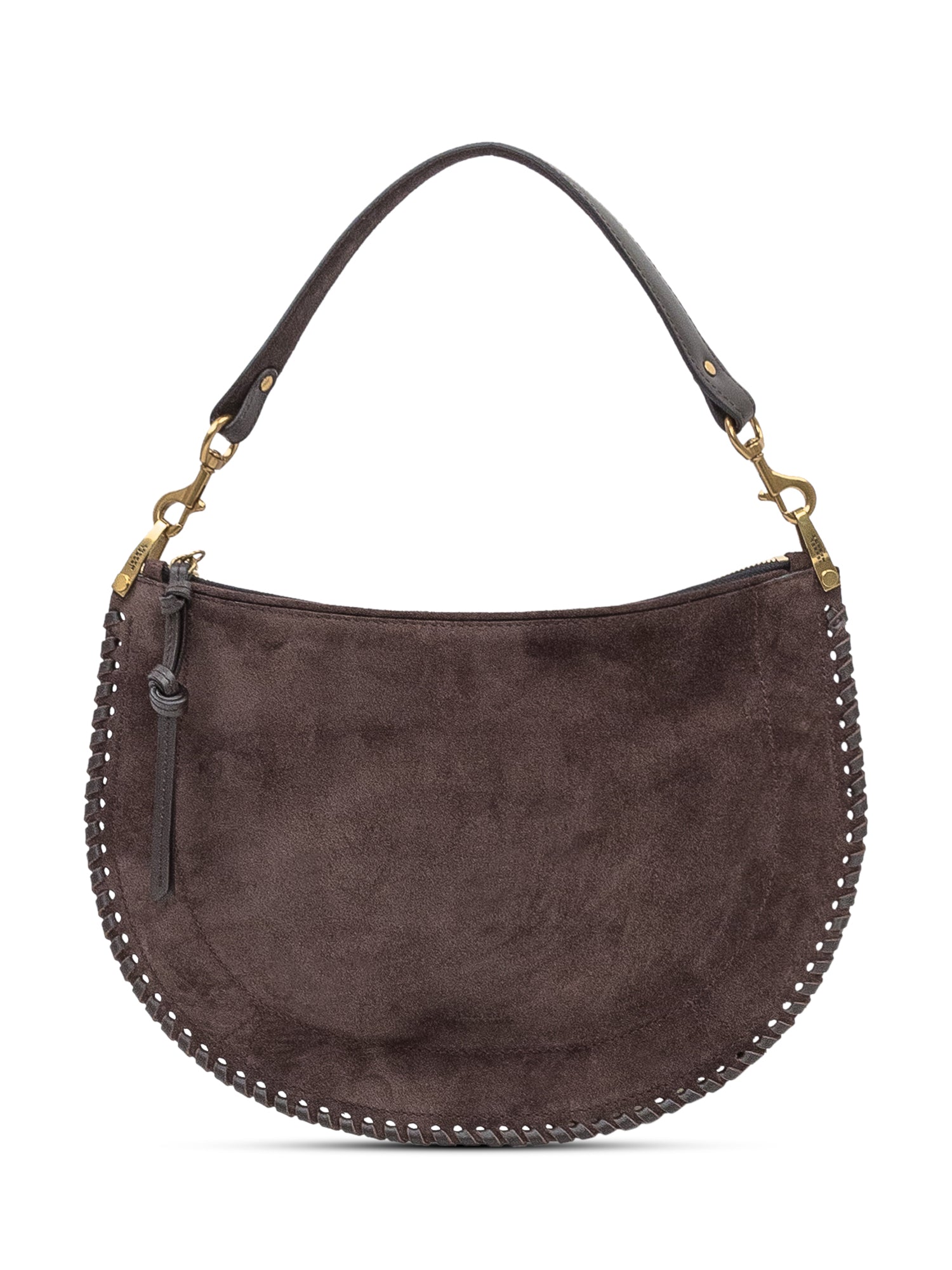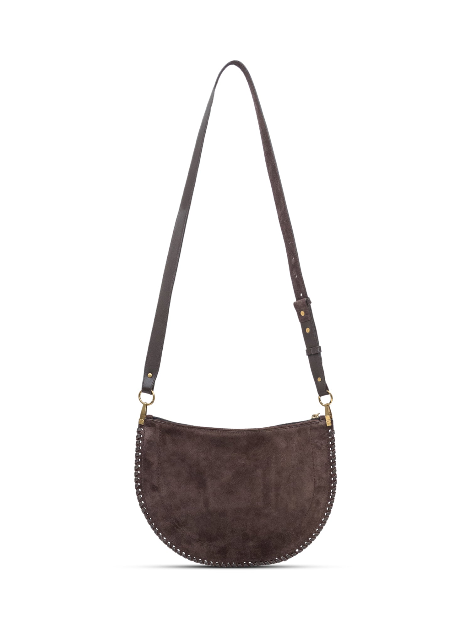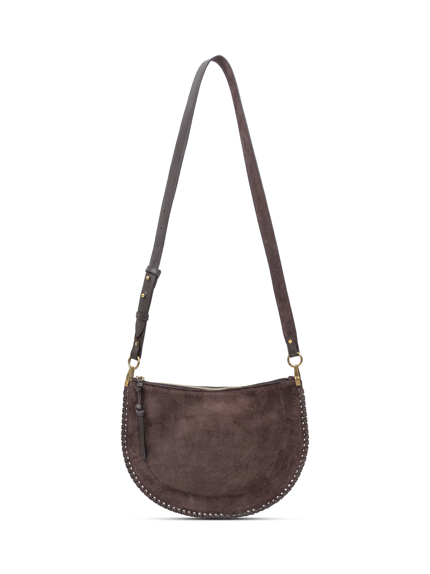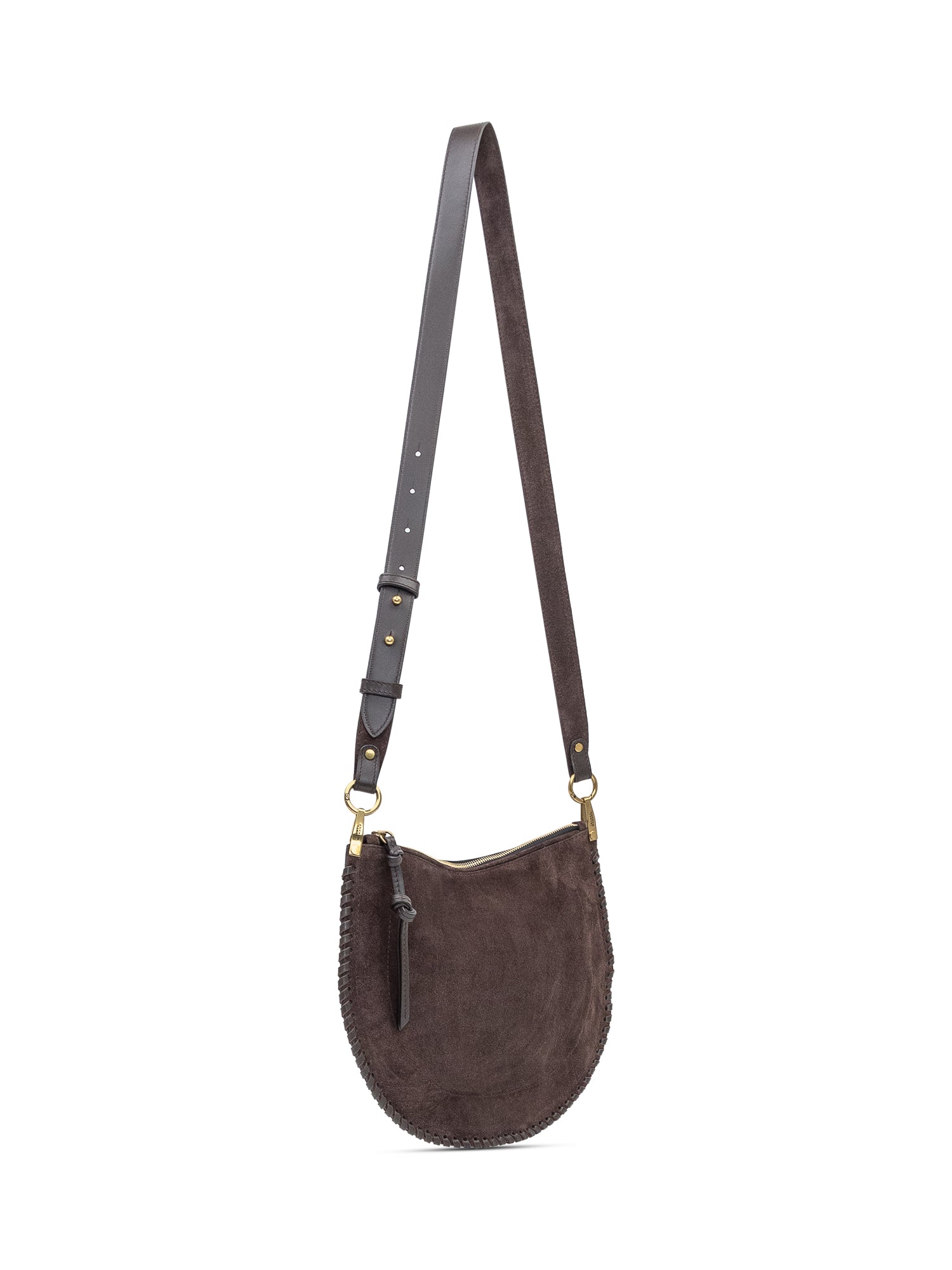 Isabel Marant Oskan Soft Zip bag in brown suede with adjustable shoulder strap and zip closure. Crescent shape with stitched details.
