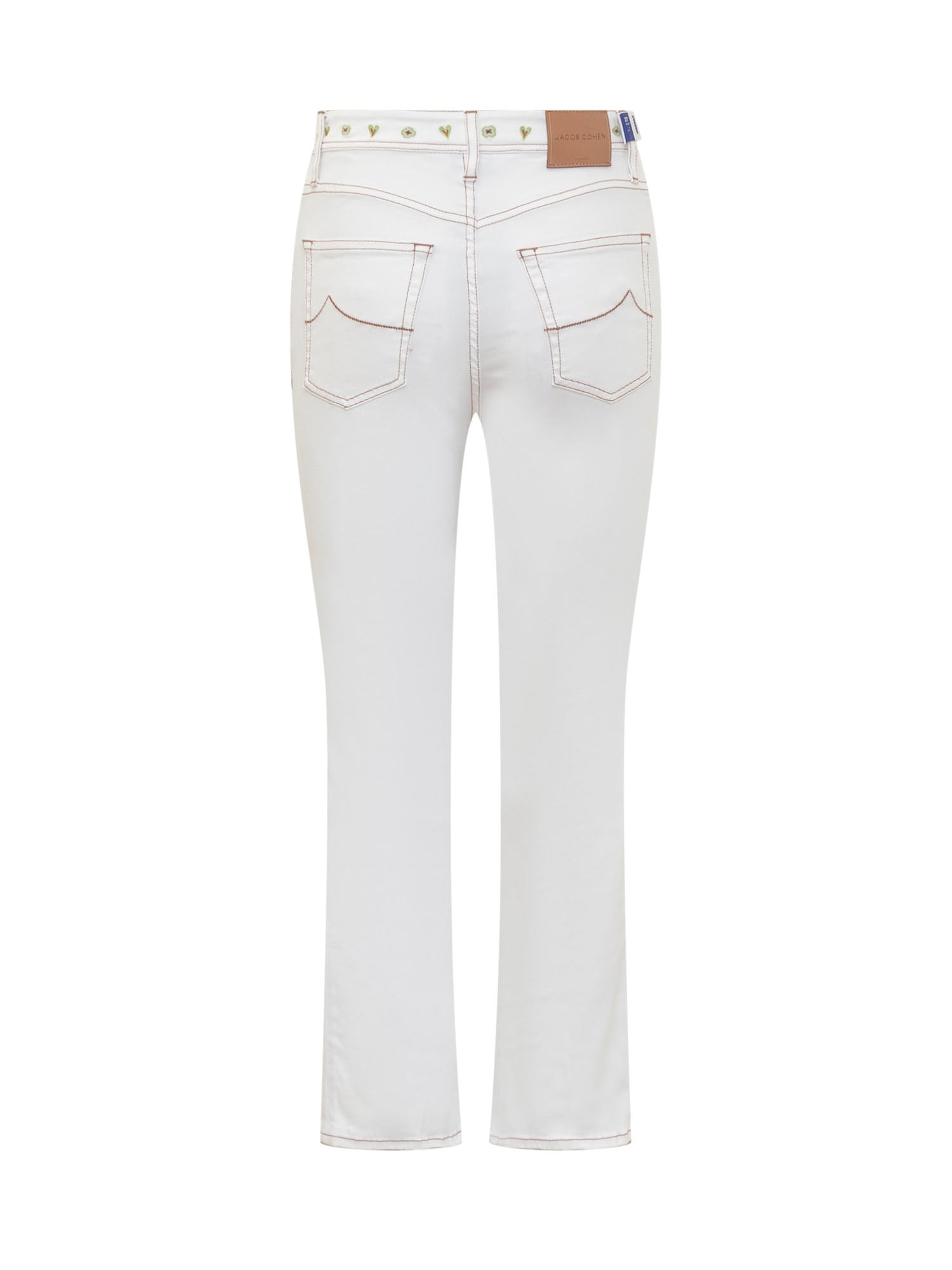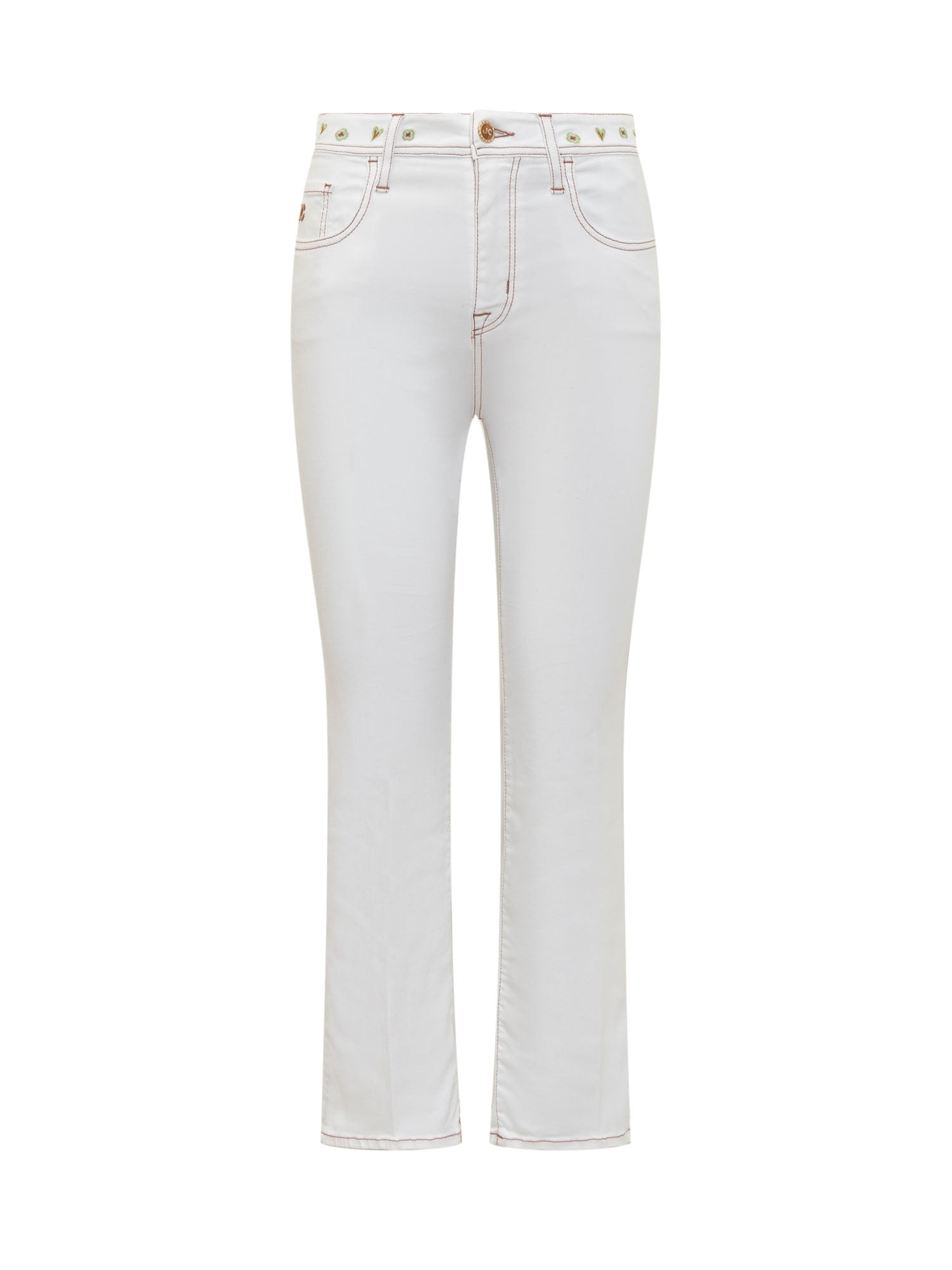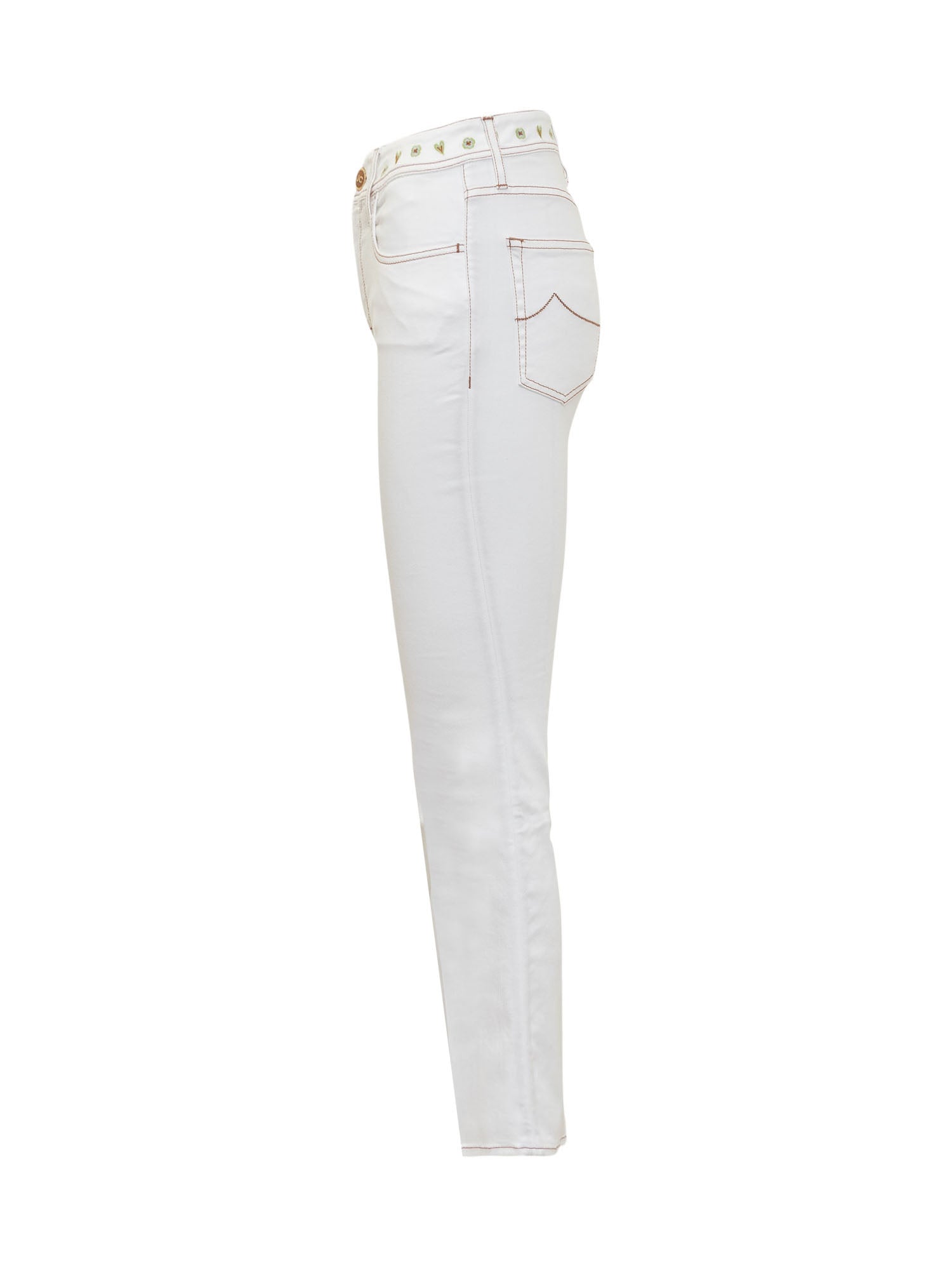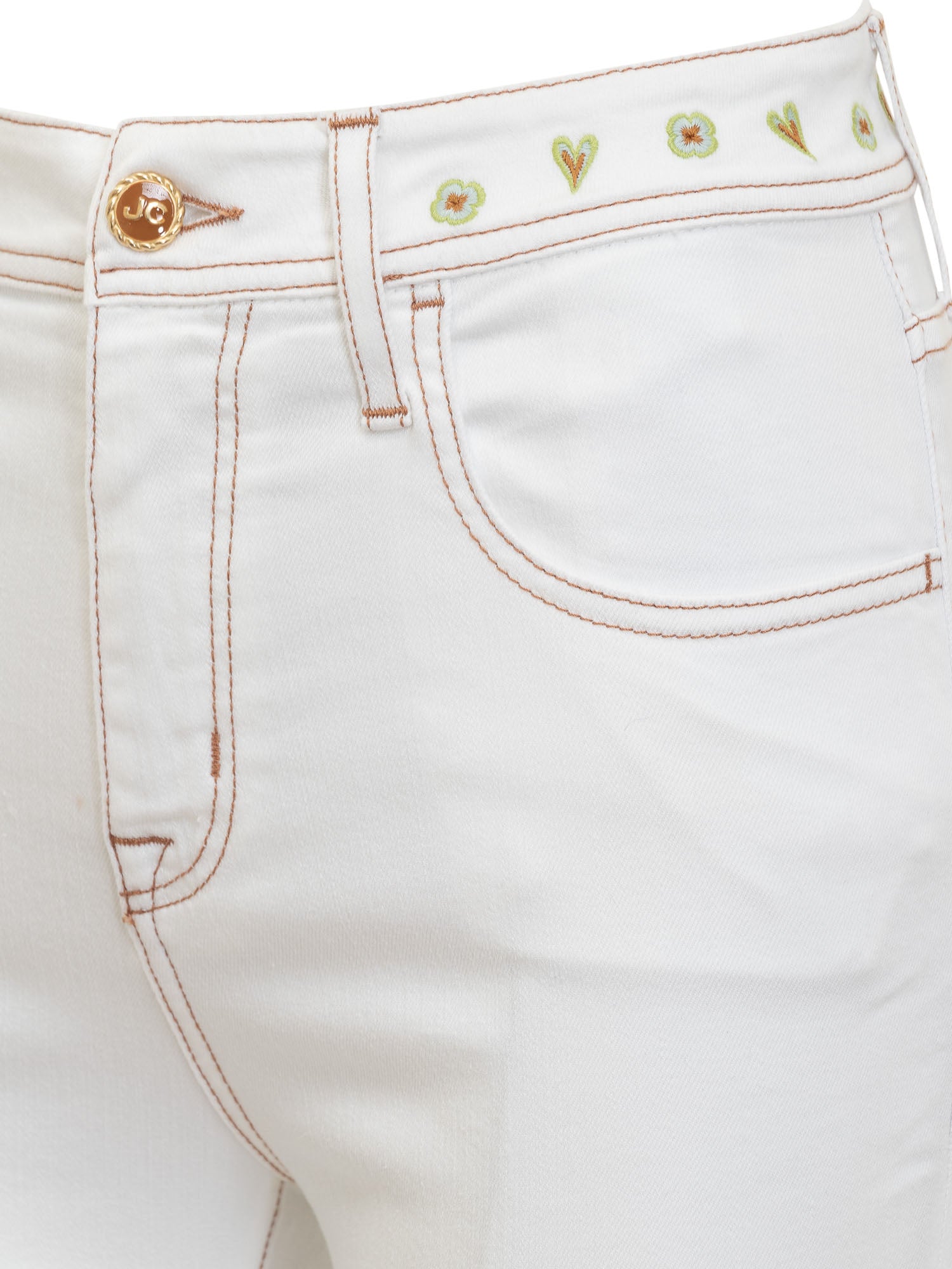 Long skinny fit jeans. Button and zip closure. Five pockets. Logo on the front. Embroidered decorations at the waist.