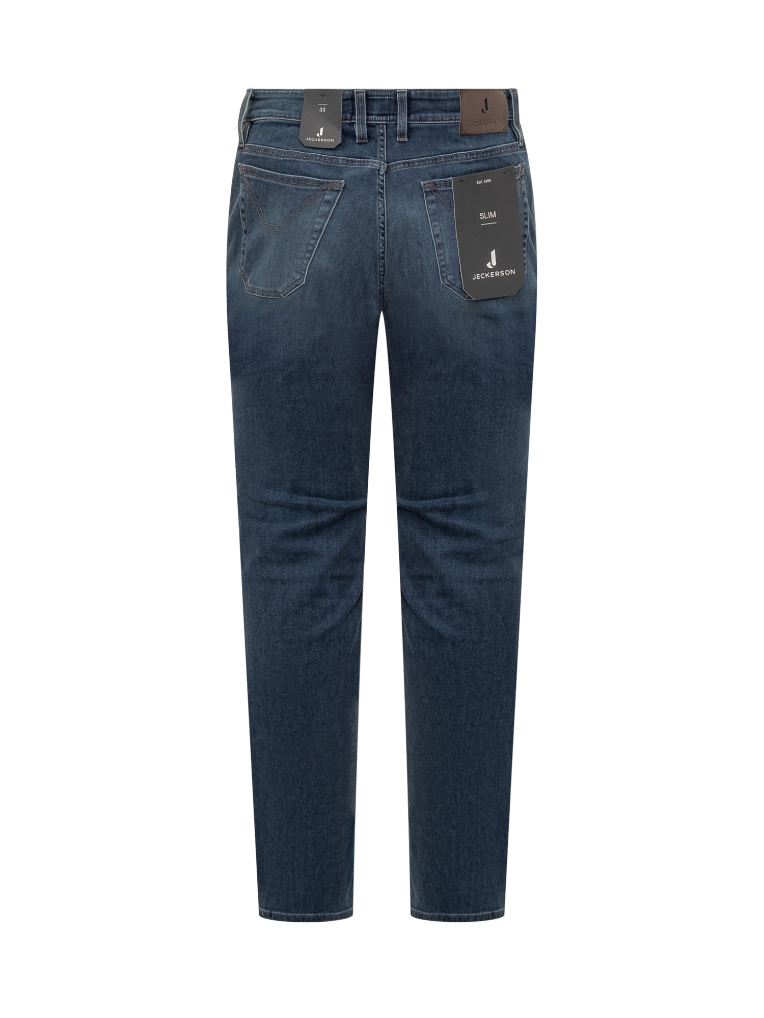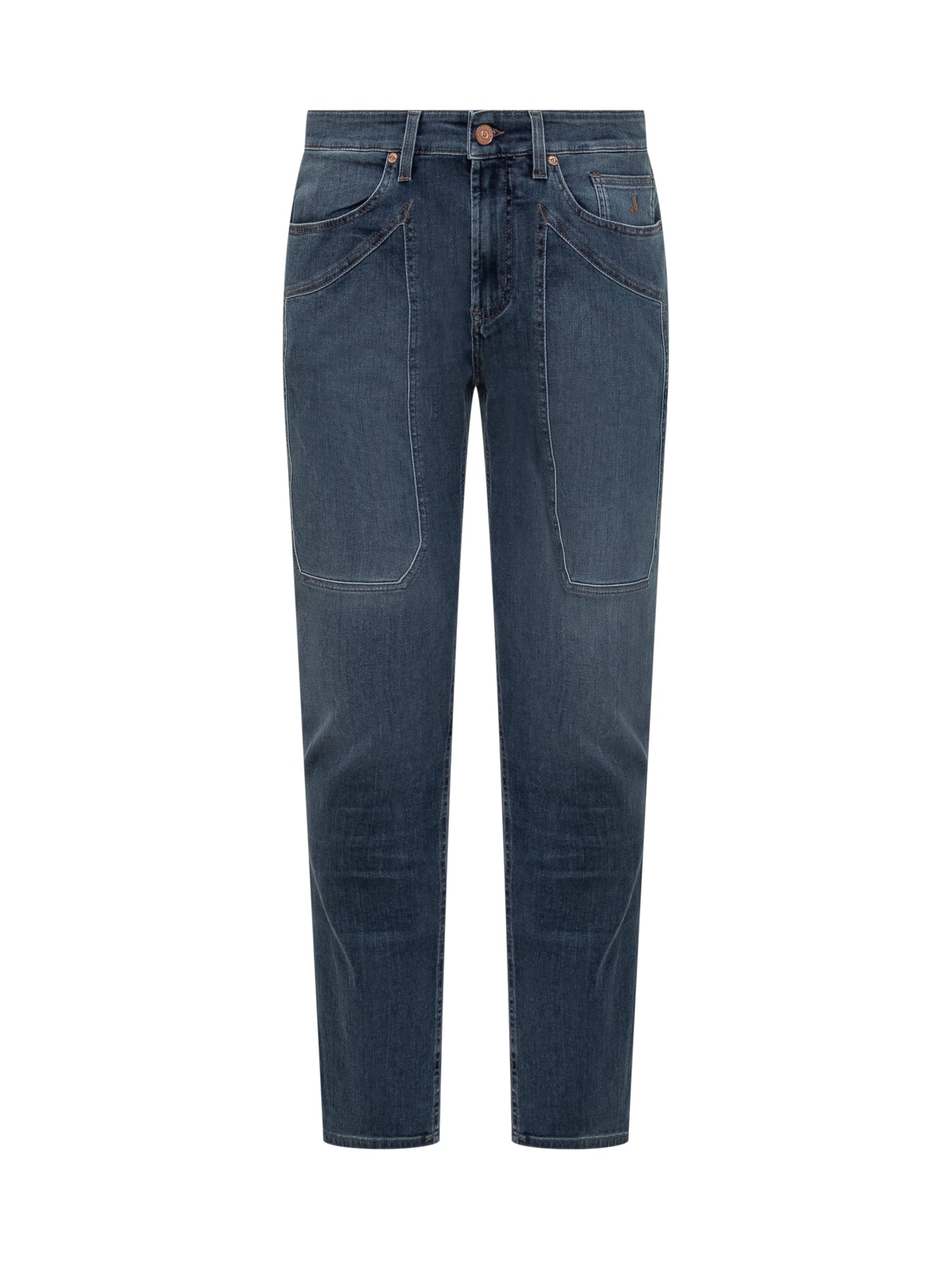 Jeckerson dark blue denim jeans featuring signature front patches and slim fit. Contrast stitching and button-zip closure.