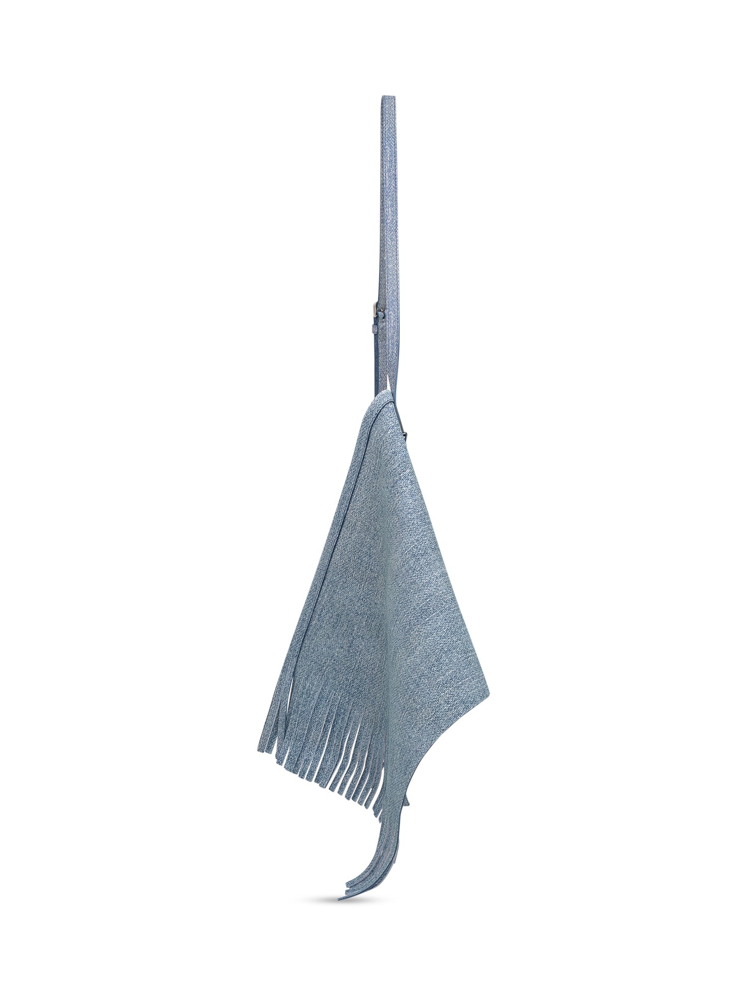 Denim bag. Adjustable shoulder strap. Asymmetrical design. Embossed logo on the front. Single compartment.