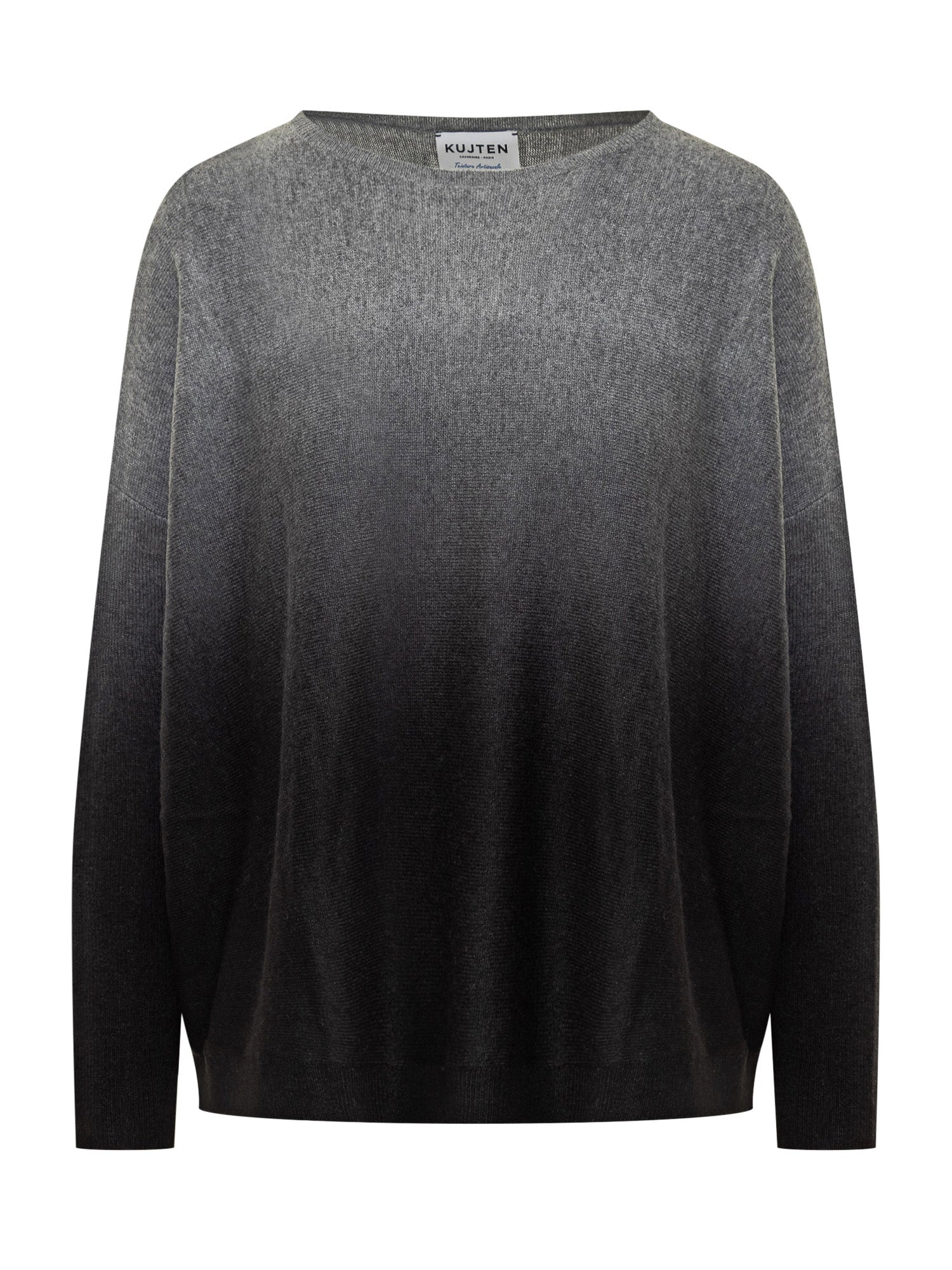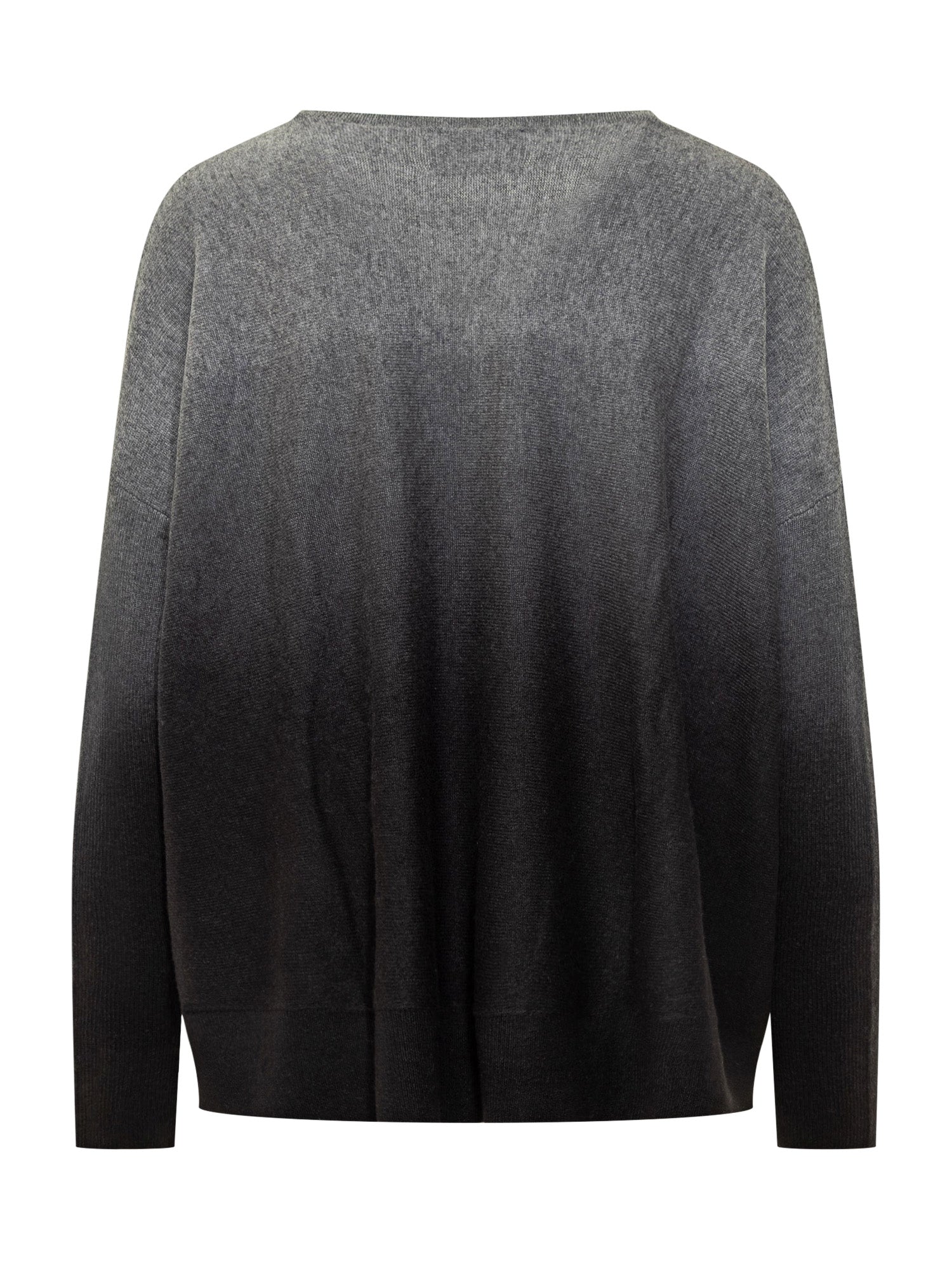 Women's cashmere sweater with light grey to black gradient and classic crew neck. Clean lines and modern style for a refined, versatile look.