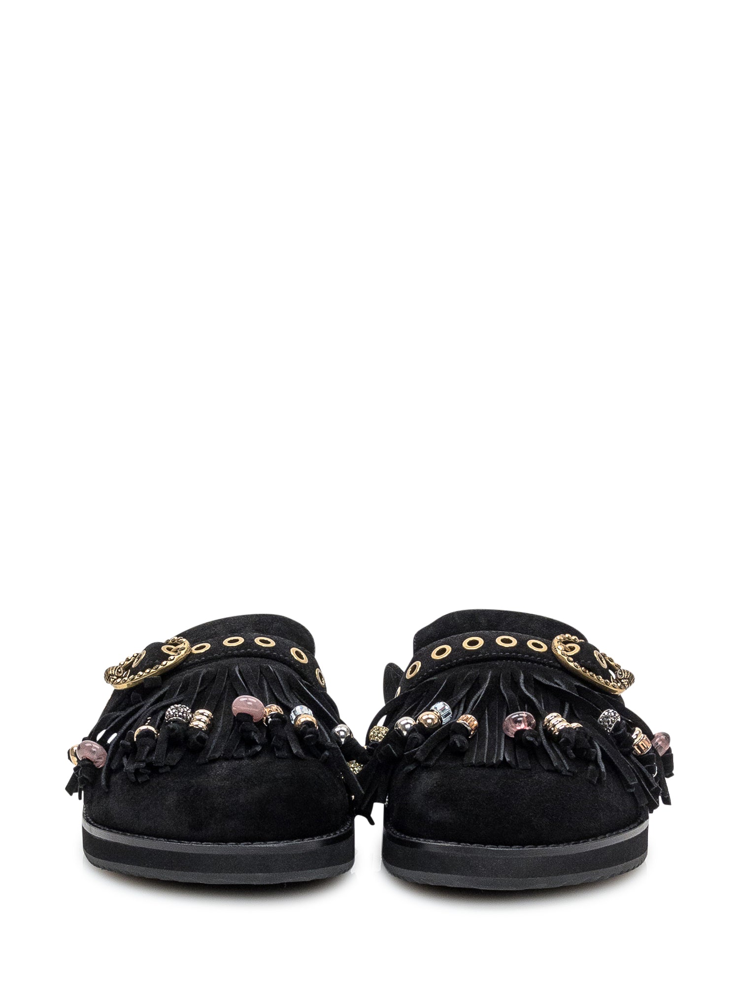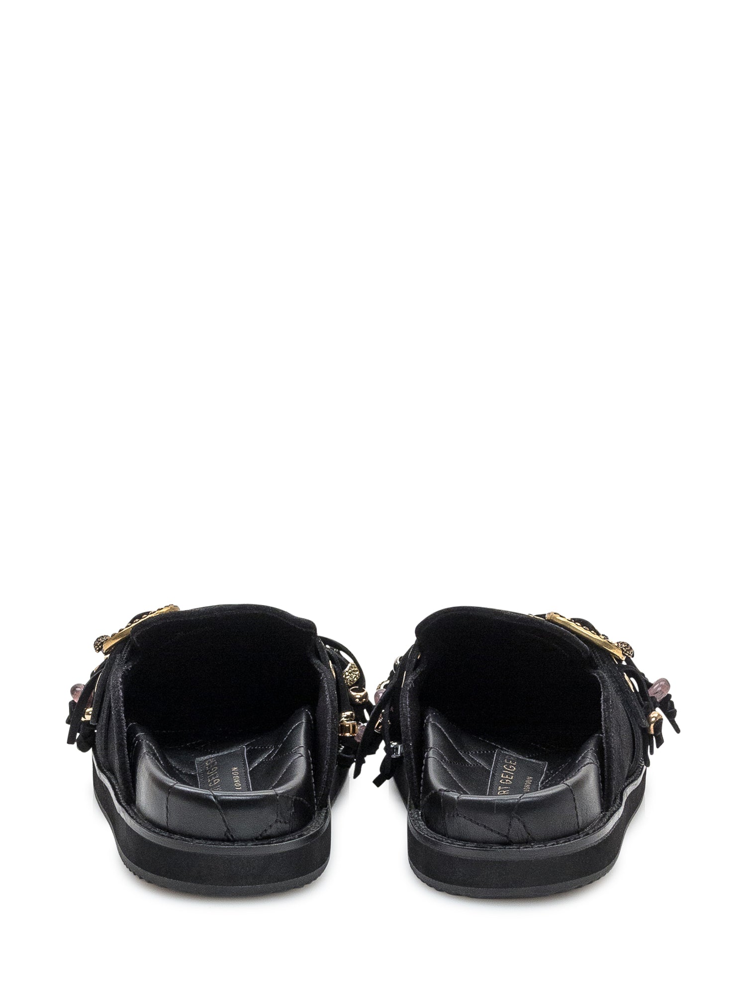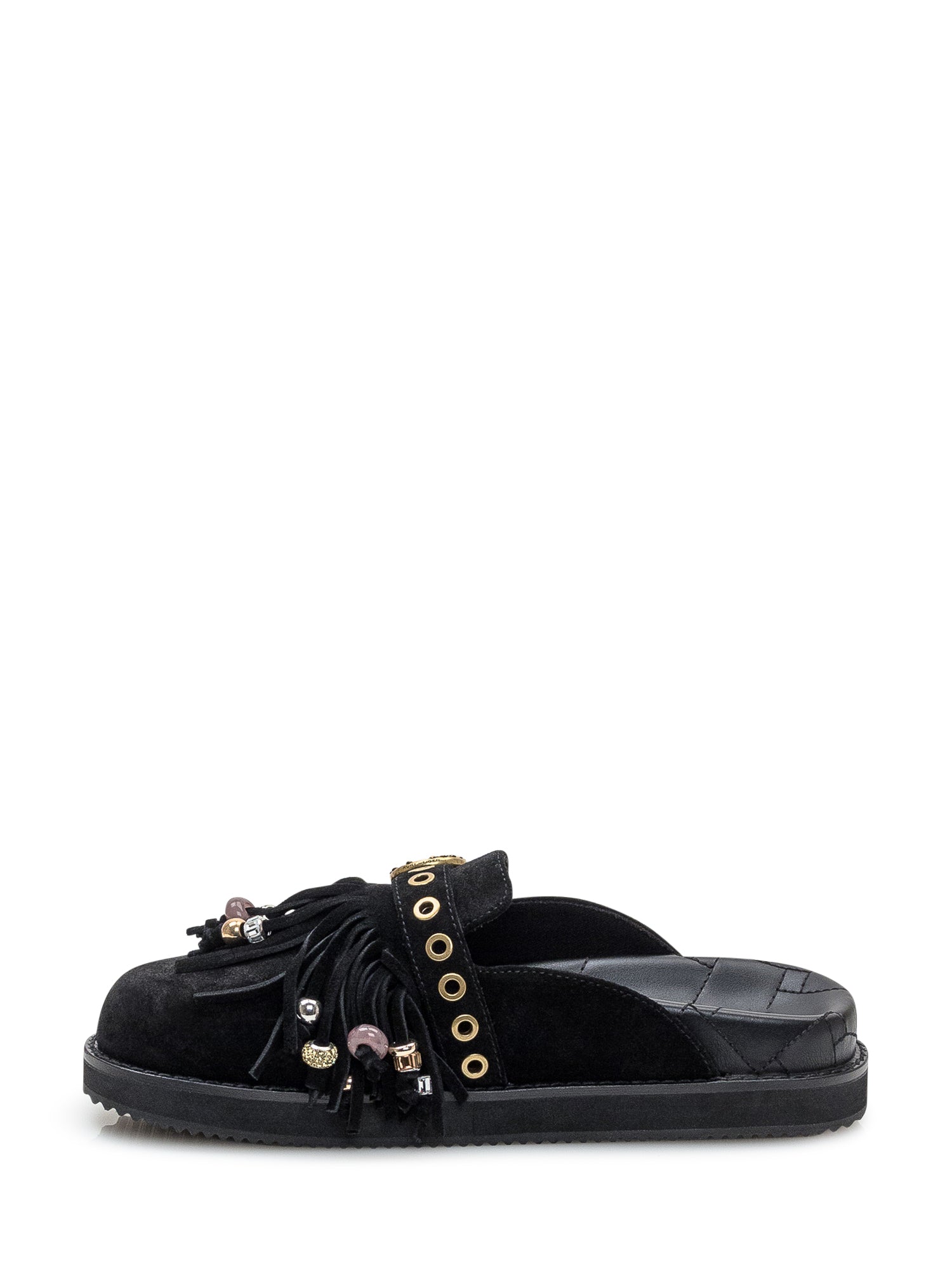 Kurt Geiger black suede sabot with fringes and jewel embellishments. Trendy and comfortable design.