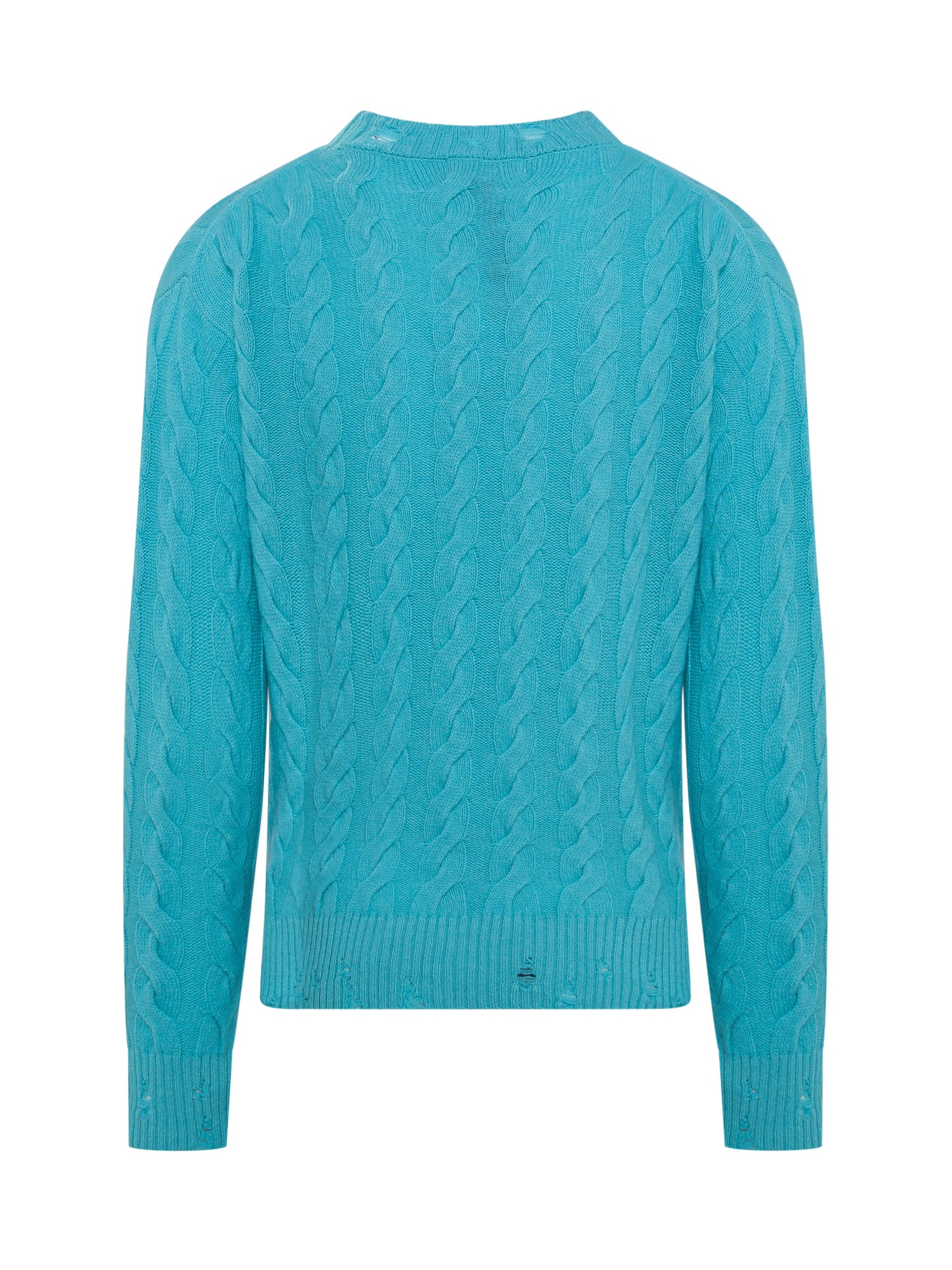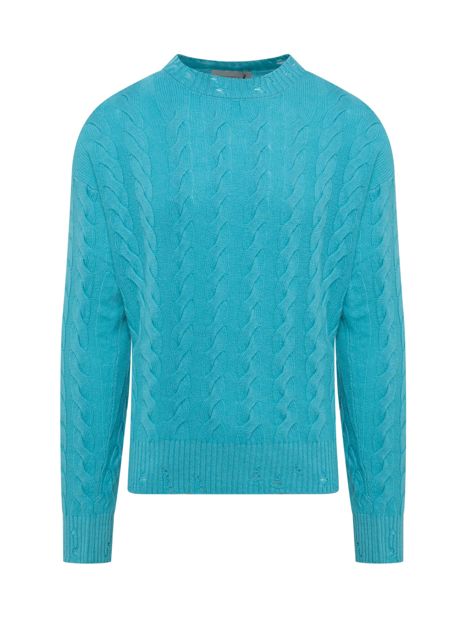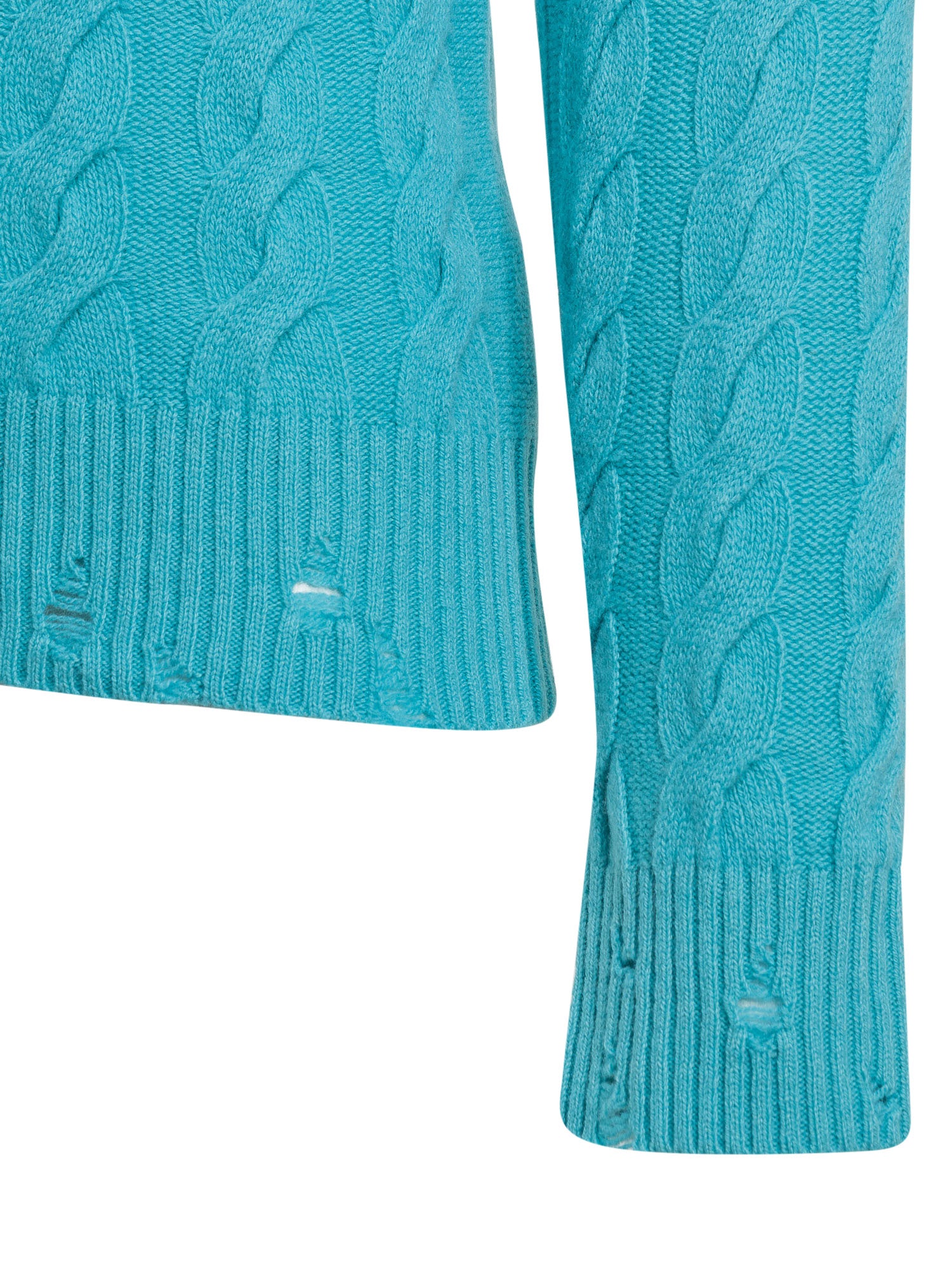 Long-sleeved sweater. Crew neck. Knitted braided fabric. Damaged effect on the bottom.