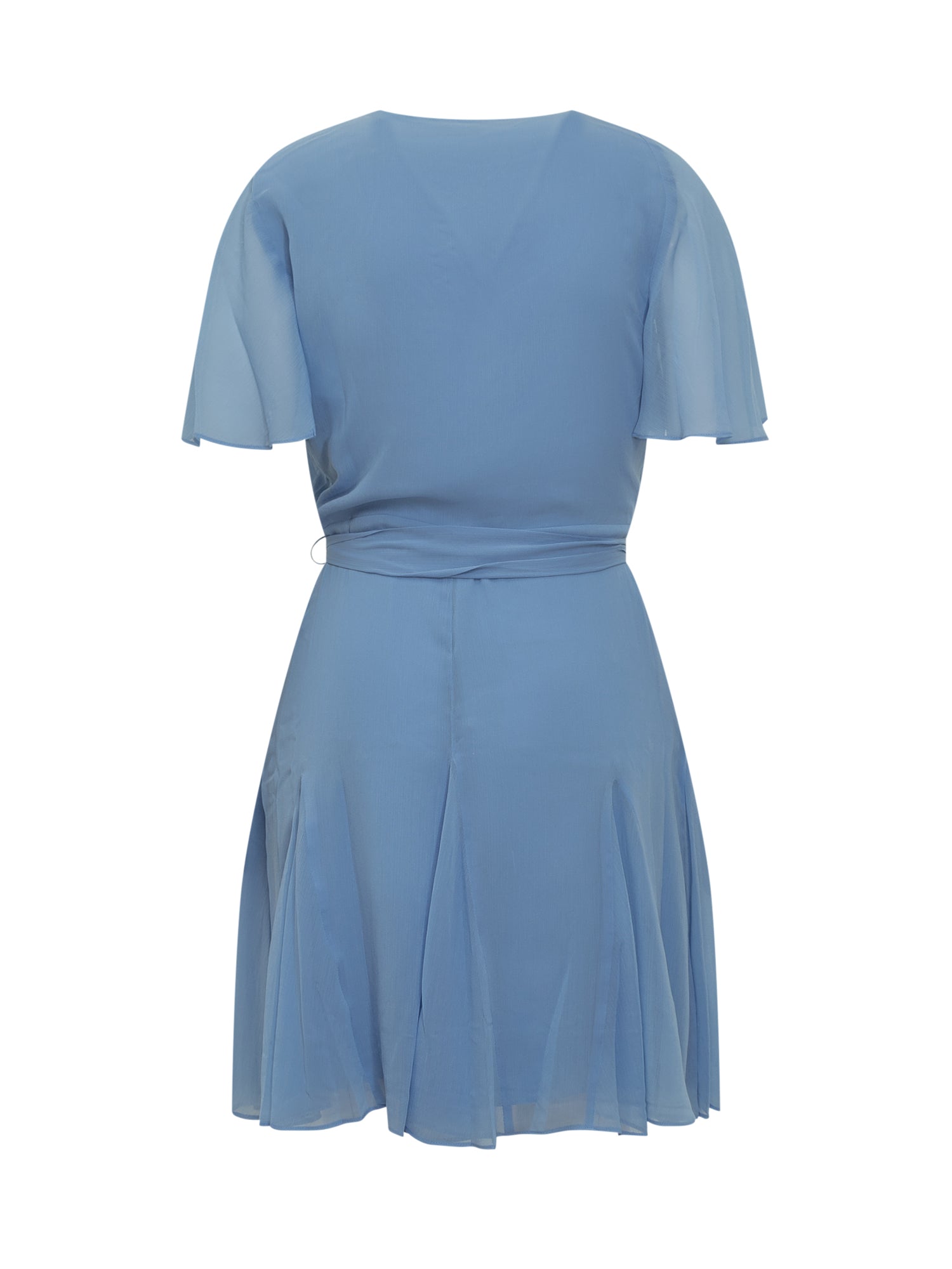 Short dress. Puff sleeves. Belted waist. V-neck.