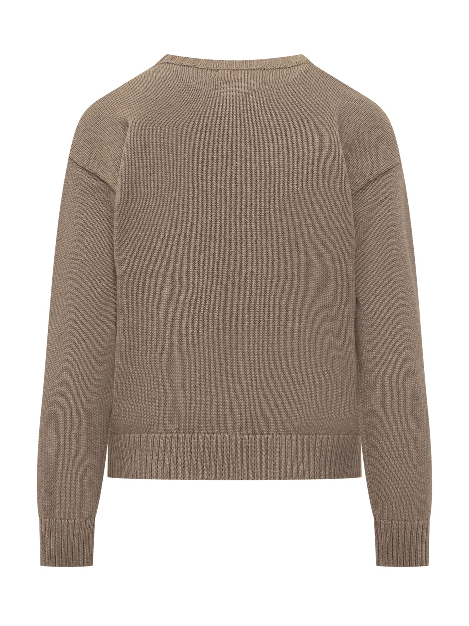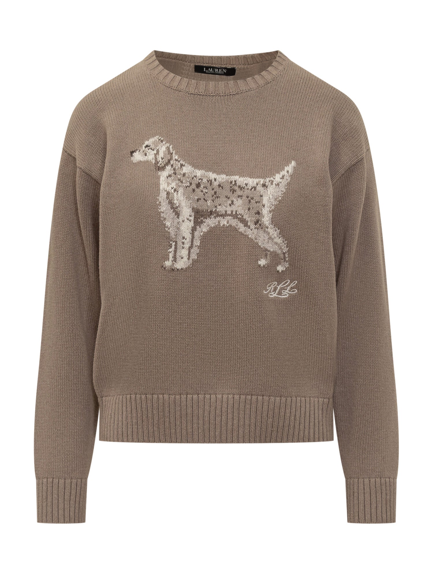 Lauren Ralph Lauren taupe cotton sweater featuring a dog embroidery on the front. Ribbed crew neck and trims.